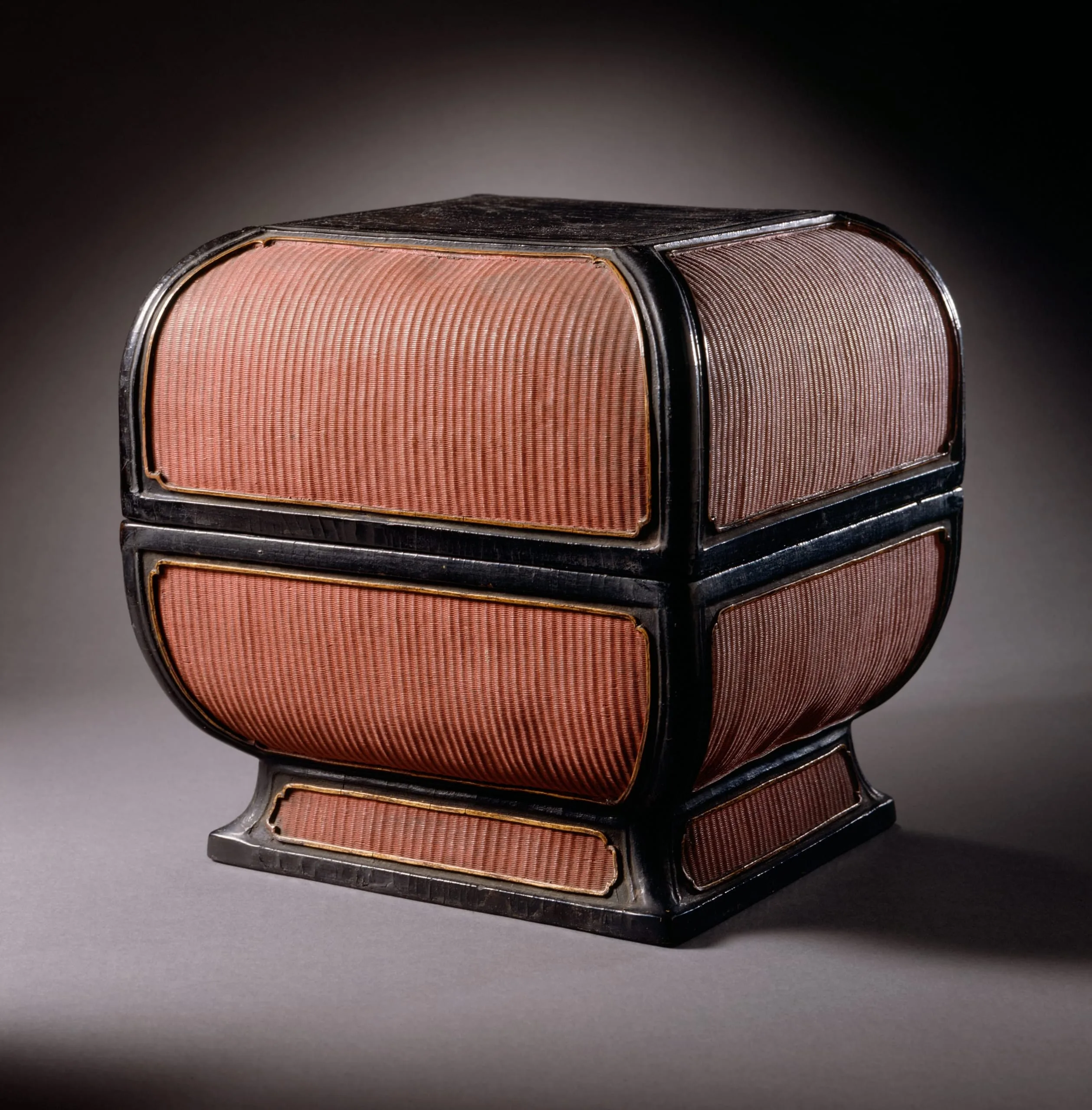 - Black lacquer with red-stained and gold-trimmed wickerwork panels
