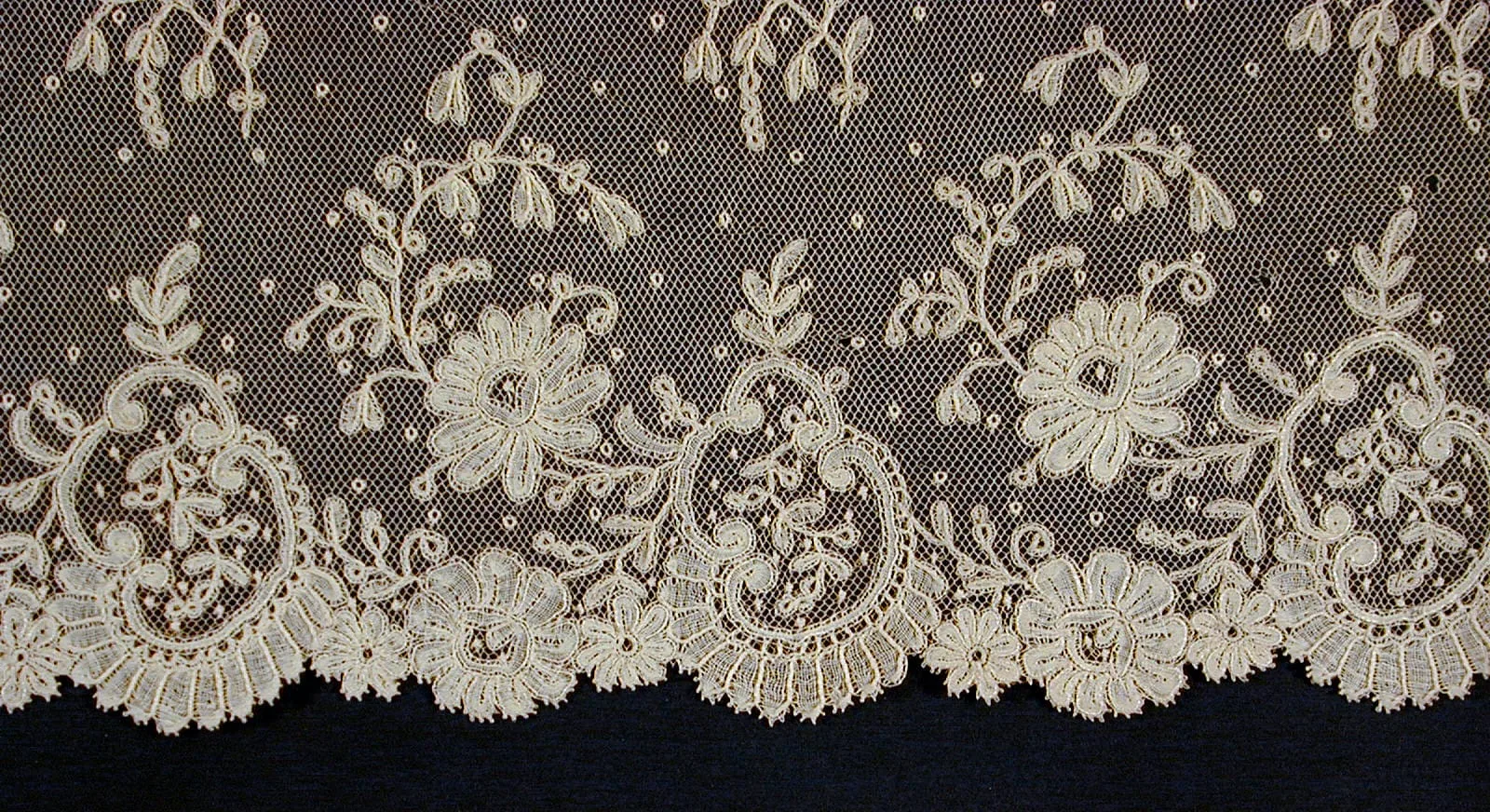 - Cotton and silk bobbin lace appliqué on machine net