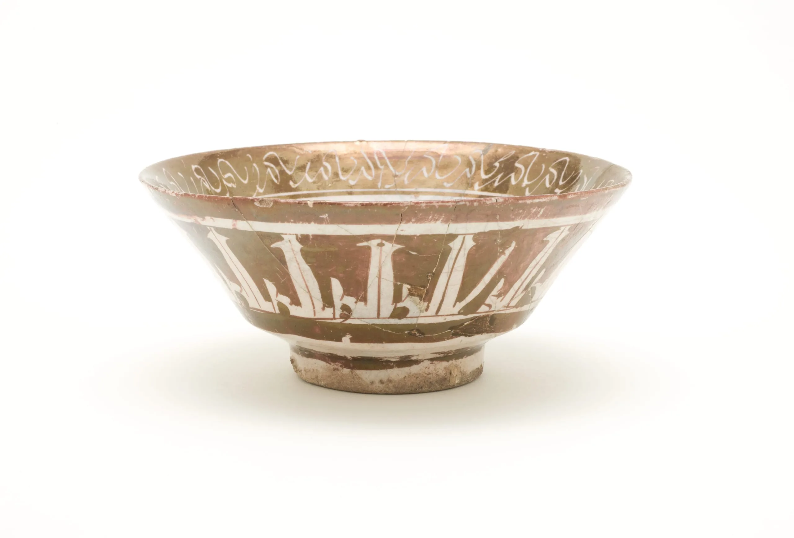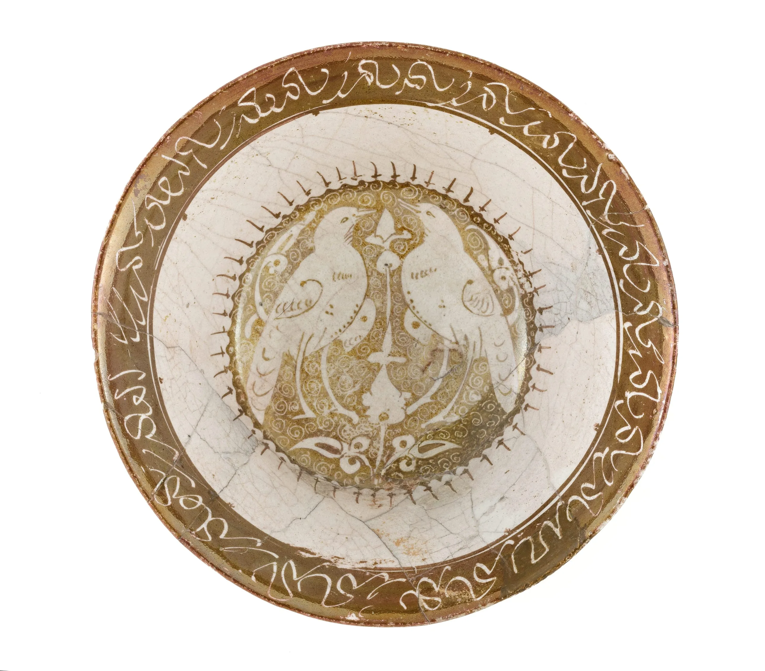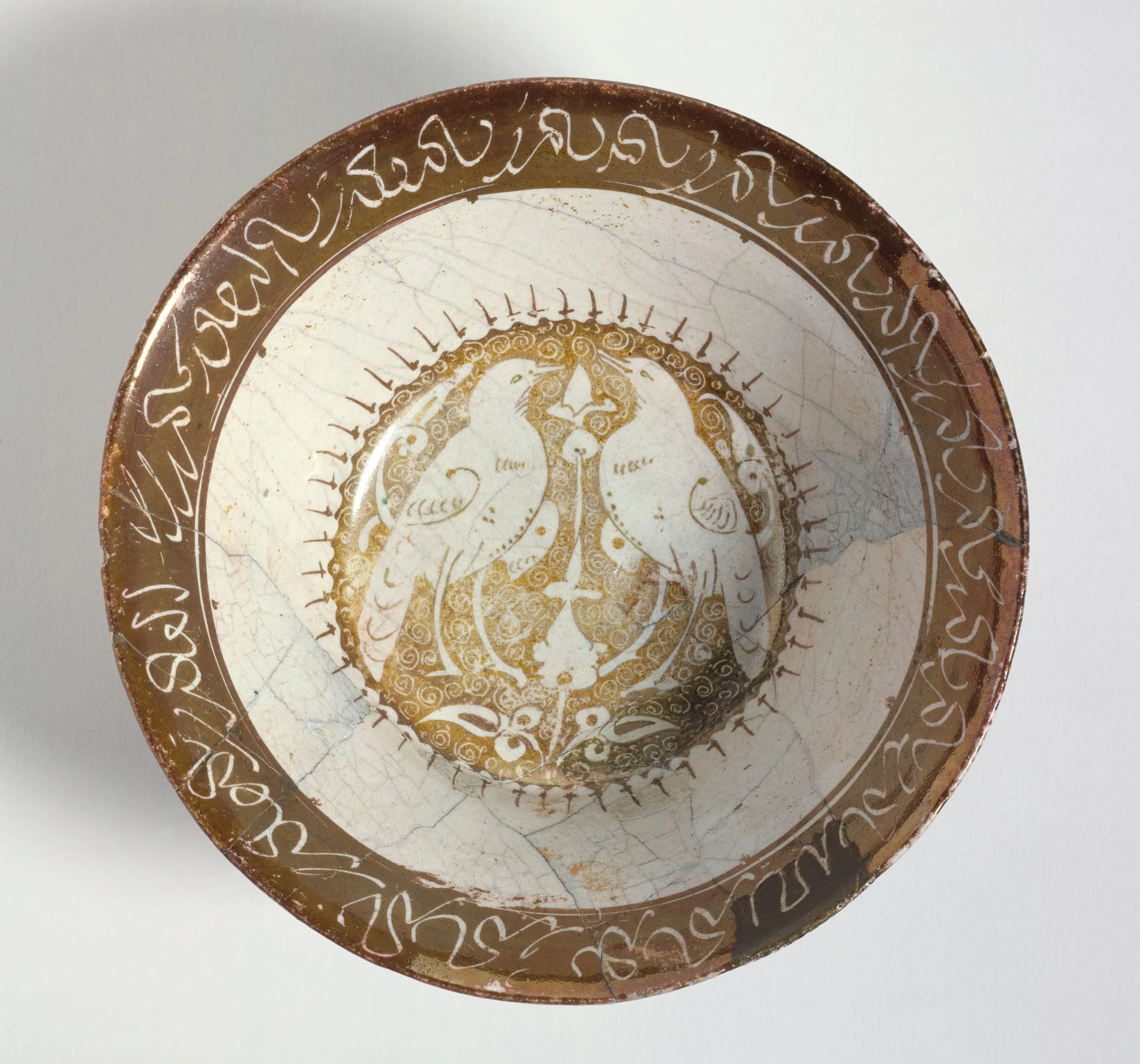 Birds are a common motif in Islamic art and appear in numerous mediums, including ceramics, textiles, carved wood, and metalwork. Two delicately painted birds, arranged face-to-face, decorate the center of this stunning gold luster bowl made in thirteenth-century Iran, probably for an affluent urban client. It is unclear what species of bird was intended, but it is possibly a nightingale, popularly known in Persian literature for its unrequited love for the rose and easily recognizable to the literate Iranian urbanite.