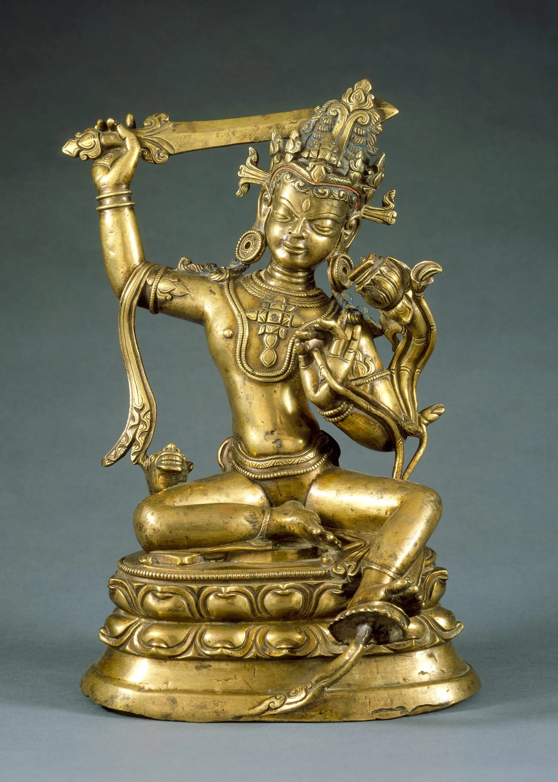 Manjushri (Beautiful Glory/Goddess) is the Bodhisattva of Wisdom. He is envisioned in at least fourteen iconographic forms per religious textual sources. Perhaps the most distinctive is Arapachana Manjushri, who personifies his eponymous mantra A RA PA CHA NA. In this form, represented here and in M.75.4.6, he brandishes his sword of wisdom and holds a manuscript of the Prajnaparamita (Perfection of Wisdom) surmounted on a lotus stalk. Alternatively, he can carry only the sacred manuscript (M.75.4.9) or hold his hands in the gesture of Turning the Wheel of the Law (dharmachakra mudra) (M.75.4.19).