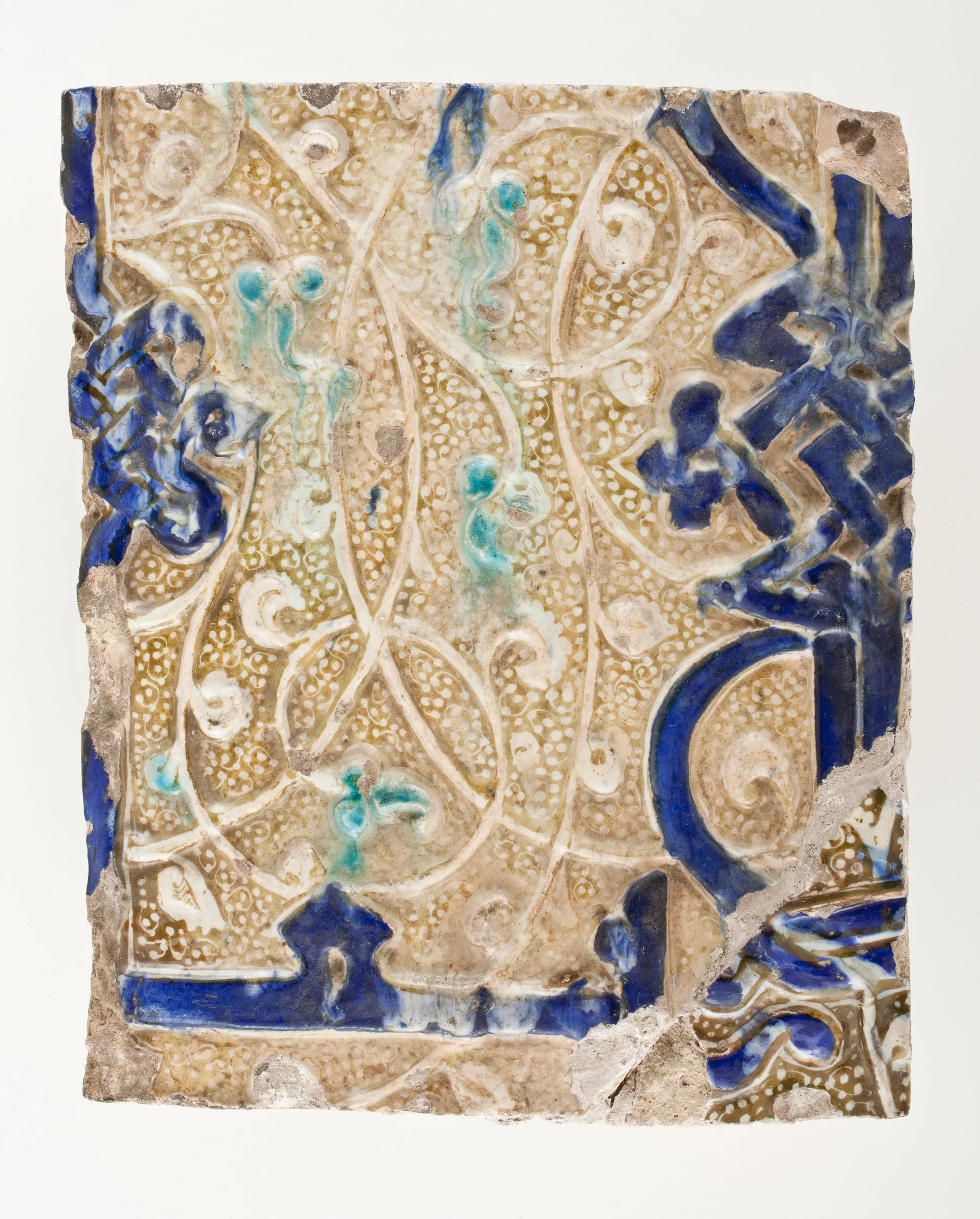 - Fritware, overglaze luster-painted, with cobalt blue