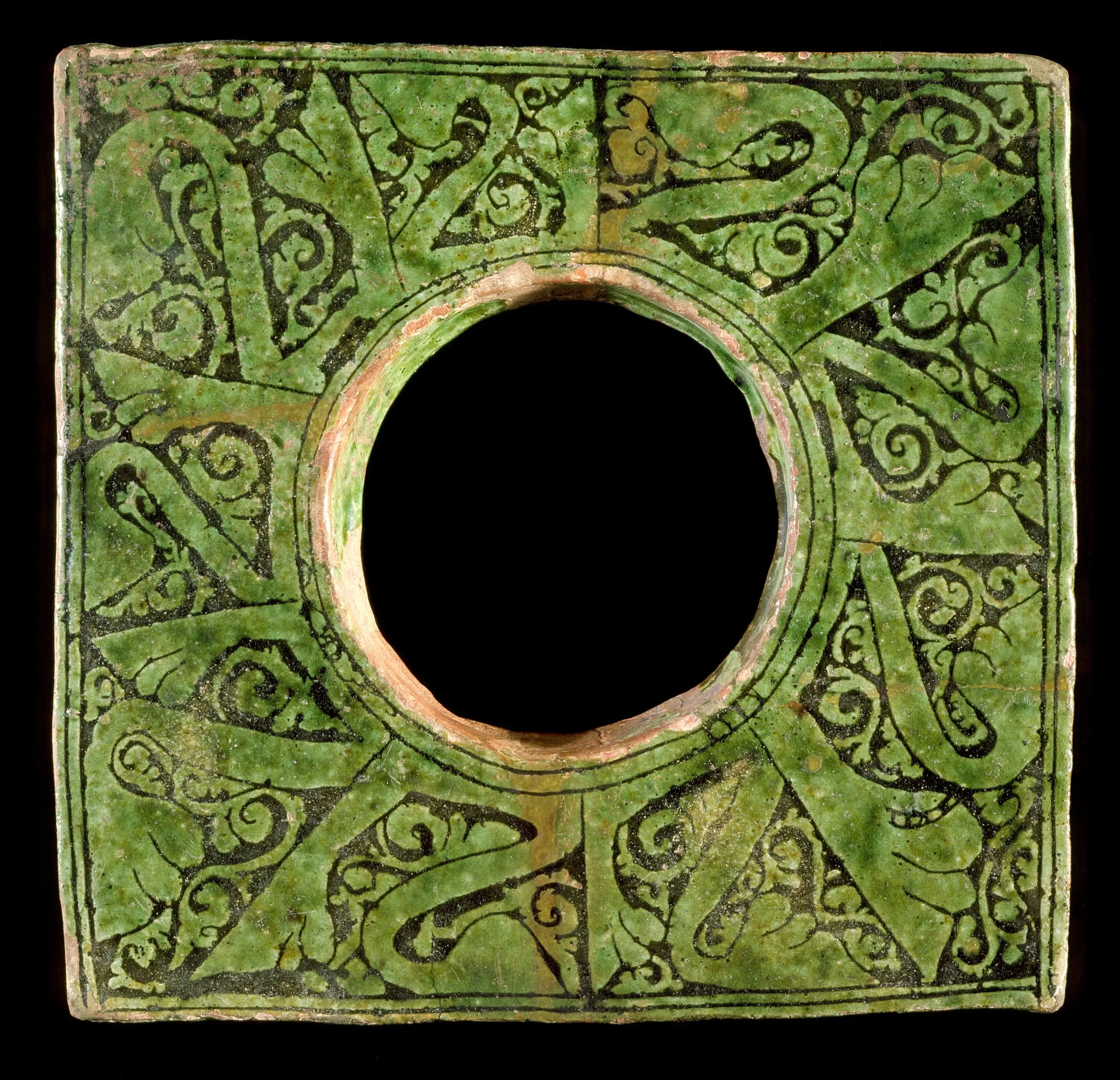 - Earthenware, incised in champlevè technique, white engobe, underglaze painted