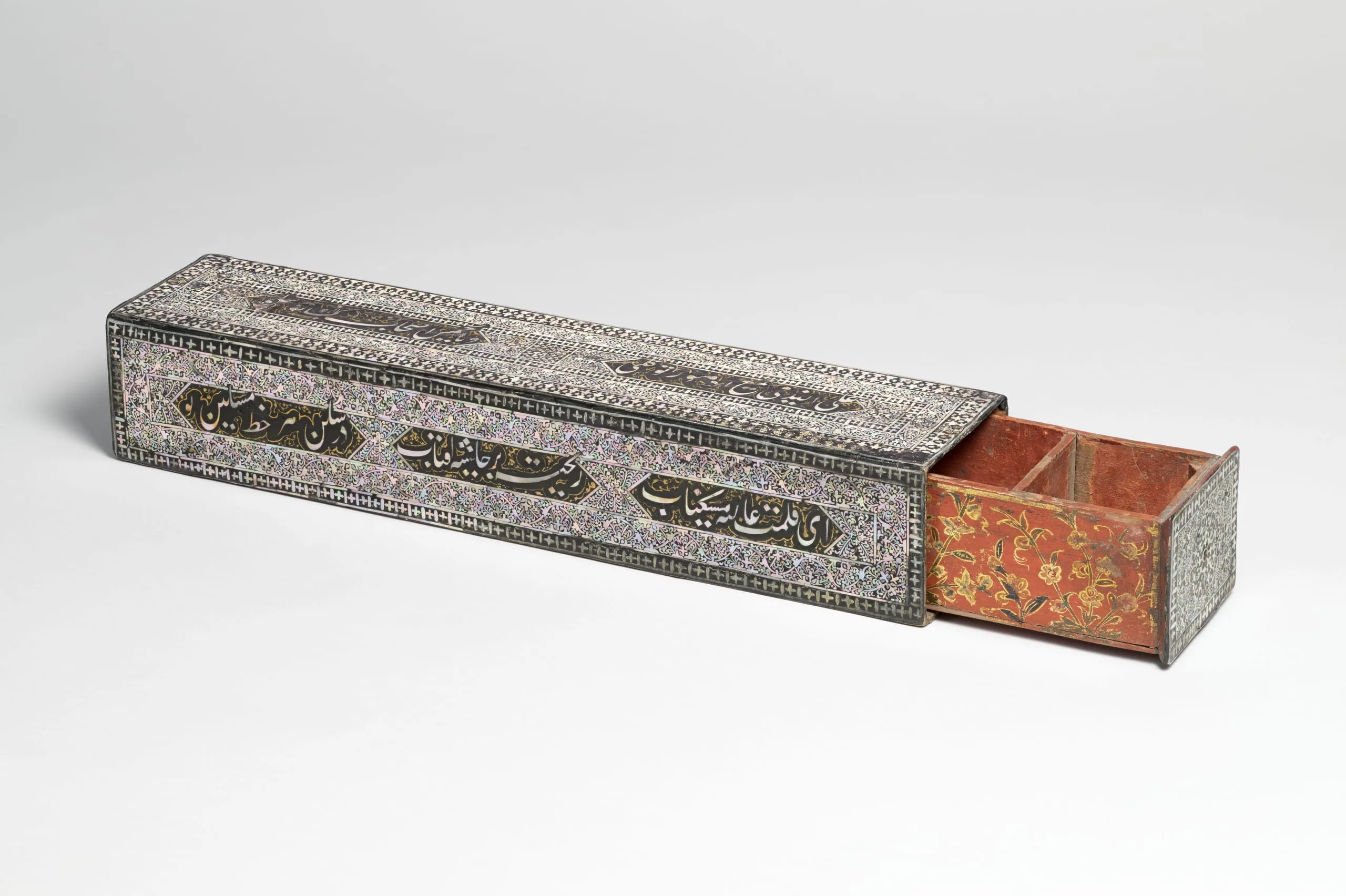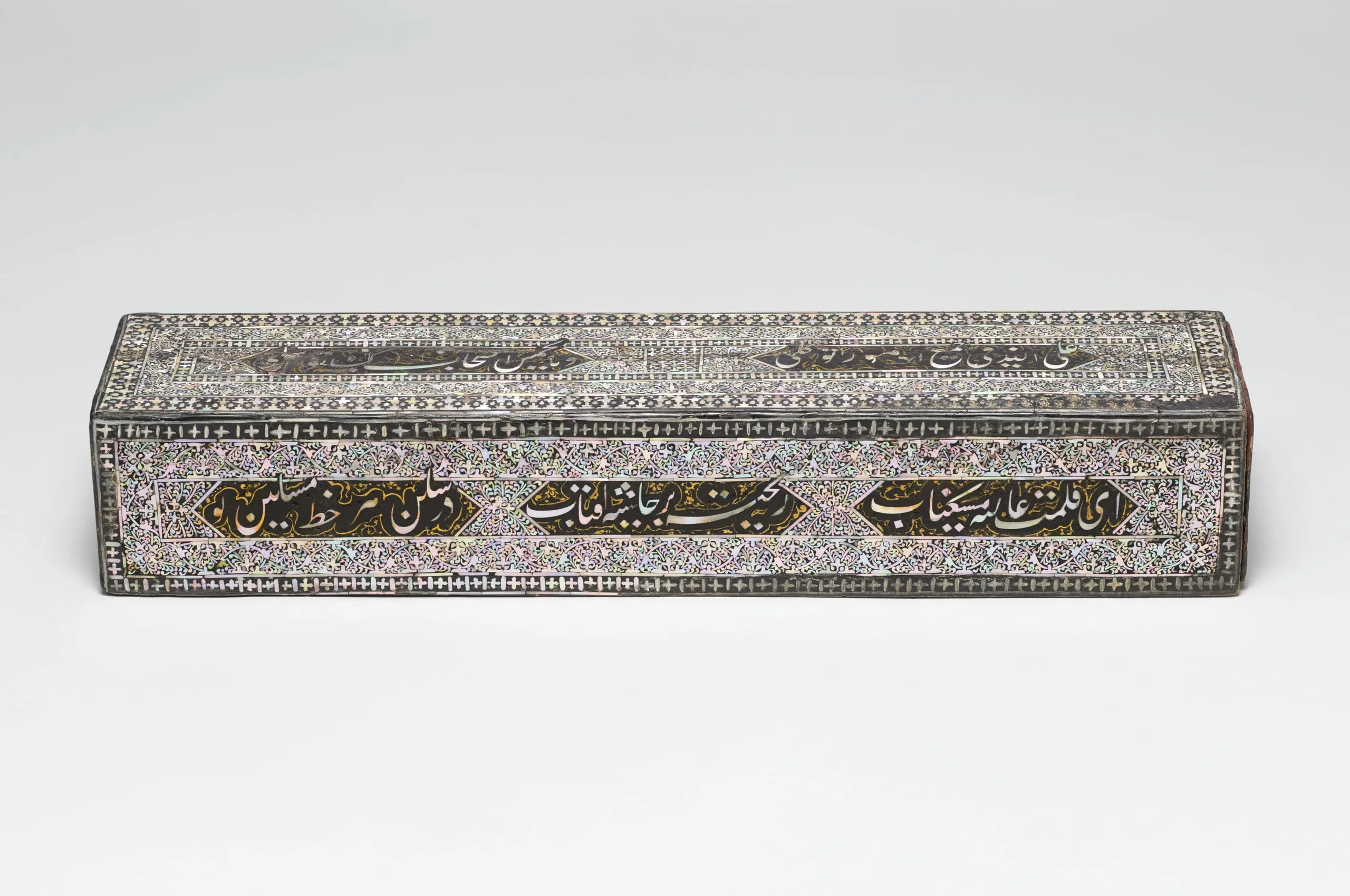 This rectangular pen box with an inner side drawer is likely made of sisham wood (dalbergia sissoo). It is adorned with small overlaid pieces of iridescent mother-of-pearl or nacre, the shiny secreted coating found on pearls and some mollusk shells, which are adhered with lac or mastic, a lacquerlike resinous ground. The scintillating mother-of-pearl fragments are arranged in concentric registers in a dense foliated arabesque featuring a scrolling vine accentuated with split palmettes set against a background of comma-shaped leaves and geometric borders. The innermost register of the top and sides has horizontal hexagons with Persian poetry written in nasta’liq script. The verses are a religious invocation to Allah (on the top), and a celebration of the aesthetic flavor of the awe-inspiring calligraphy. (Translation by Shadi Shafiei.)