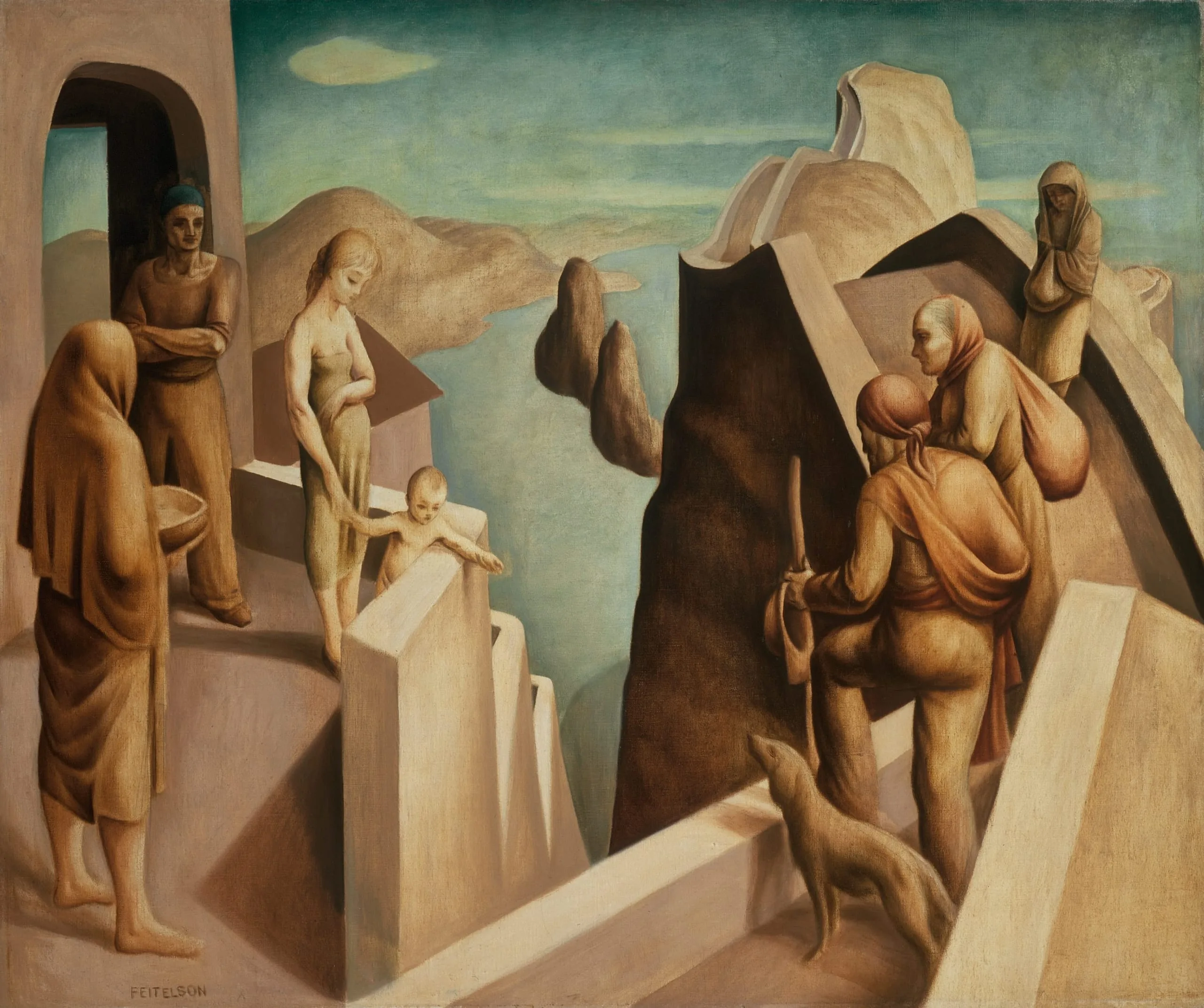 Landscape became a major component in Feitelson’s art for the first time in this canvas. The craggy mountains of Corsica are the basis of the setting. The deep chasm in the center forms a physical and psychological barrier between the two figure groupings, the young people on the left and the elderly on the right. The two strongly vertical elements of the composition are unified by what Feitelson termed "the dynamics of directional suggestion," that is, by the figures’ gazing across the chasm at one another and thereby uniting the two sides by the directions of their gazes. According to the art historian Diane Moran, this was a major discovery for Feitelson and marked a turning point in his development of a classical art structured by subjective means. This new compositional device was so important to him that when he first exhibited Maternity in San Francisco in 1932-in his most important exhibition to date-and then at the Los Angeles Museum the next year, a diagram of his analysis of the composition’s directional rhythms was hung next to the painting.