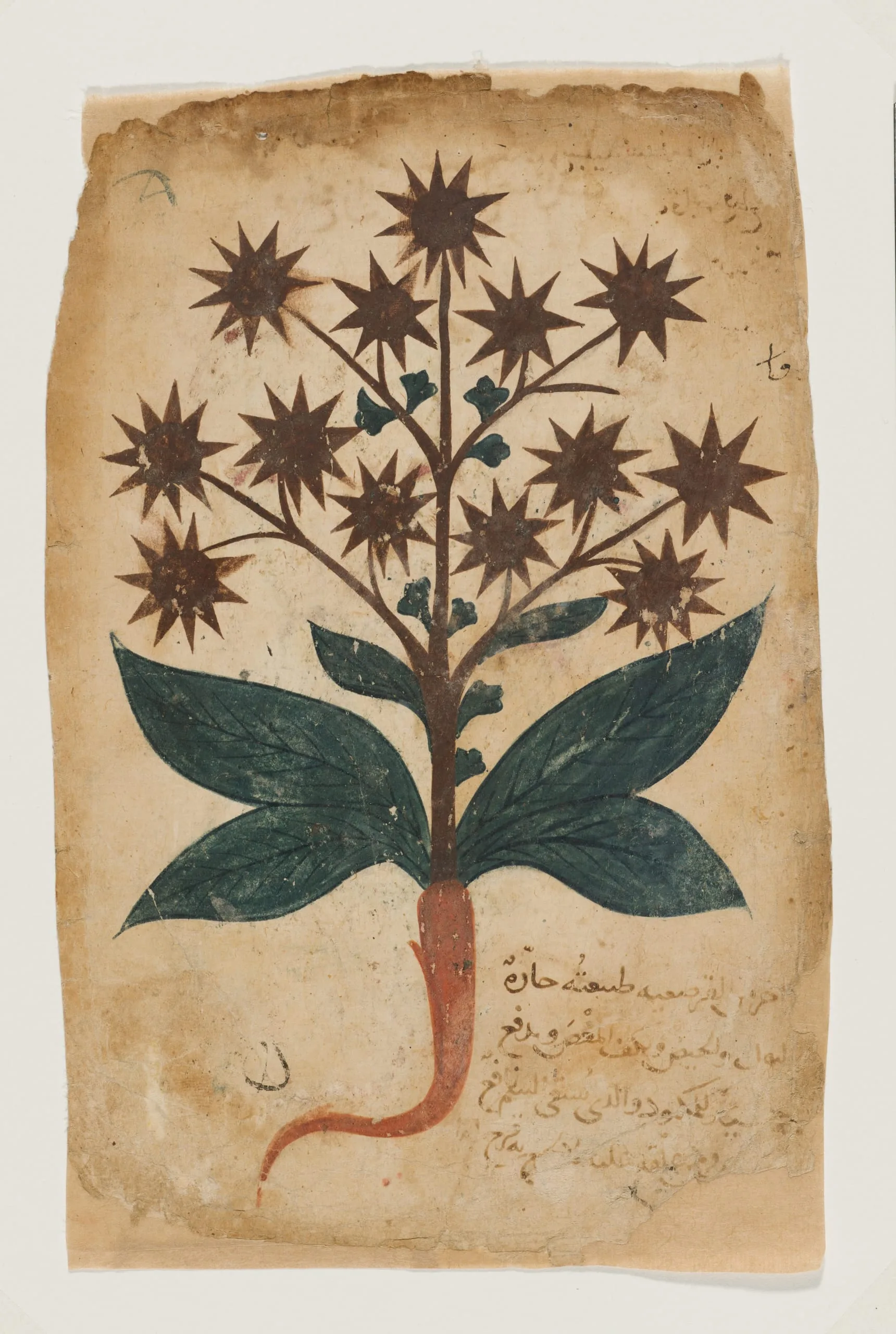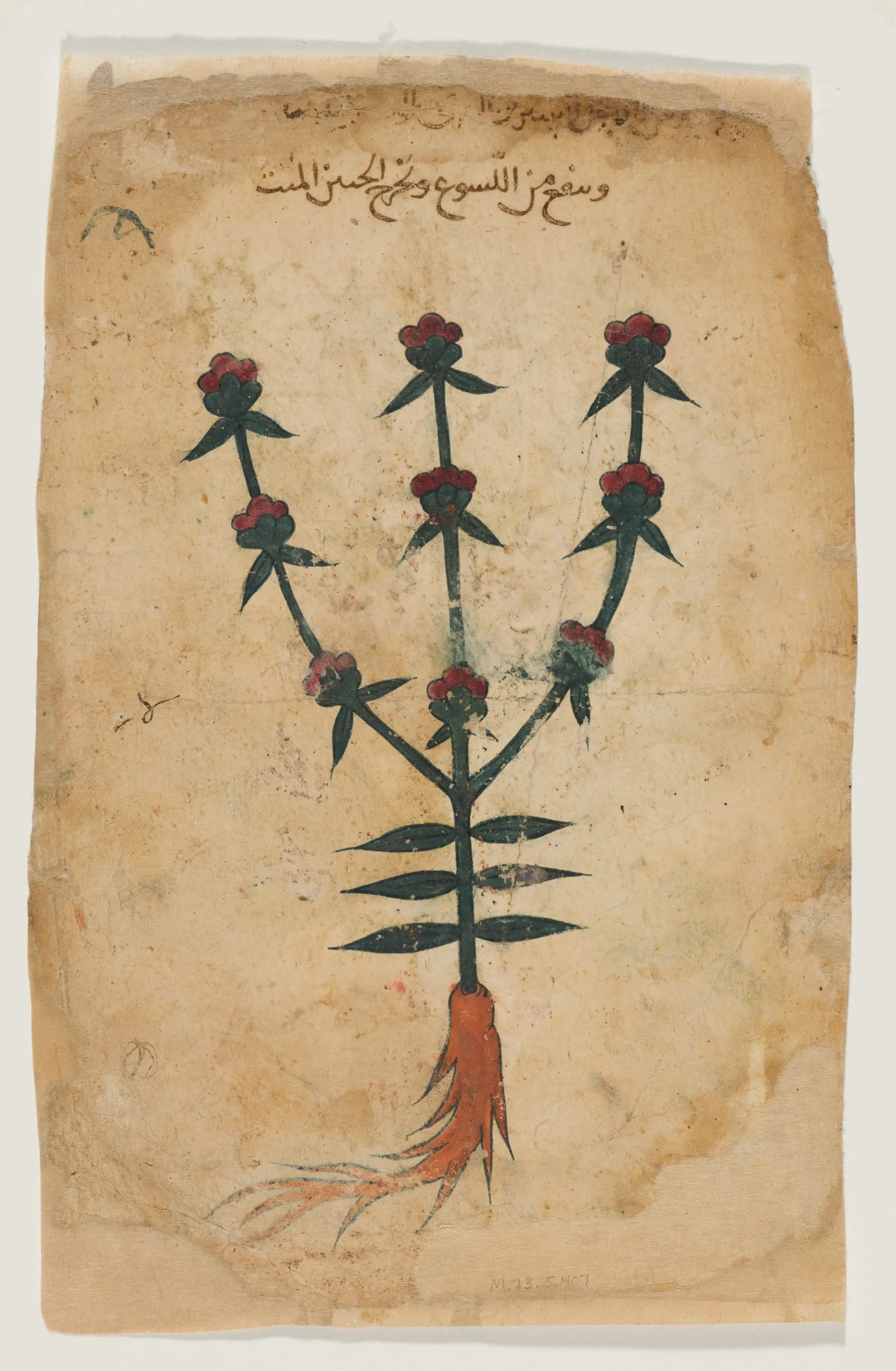 Beginning in the ninth century and under the direction of the ‘Abbasid caliph, scribes began translating, updating, and expanding ancient Greek scientific and philosophical manuscripts. Among the translated texts was Dioscorides’s De materia medica, a guide to medicinal plants and the inspiration for later herbal manuscripts, from which this thirteenth-century page derives (also see M.73.5.408a-b). Physicians and pharmacists may have relied on nonillustrated versions of the text in their practice, but illustrated versions such as this one, which often have more limited textual information, were likely commissioned for their visual appeal. This illustration of a plant with star-shaped flowers is accompanied by a description of its use: to treat the urinary tract, menstruation, stomach cramps, and liver problems.