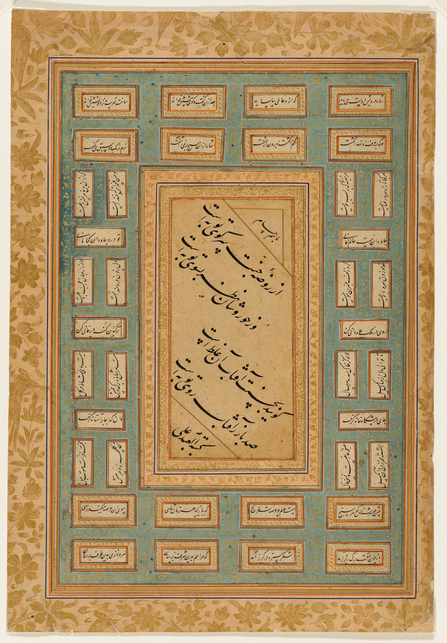 This album page features verses of Persian poetry, including love poetry written in a script known as nasta‘liq. First developed in Iran in the fourteenth century, nasta‘liq is a modification of the cursive naskh script, in which letterforms are smoothed and elongated and successive words are stacked atop one another, appearing suspended. By the fifteenth century, nasta‘liq became the principal calligraphic script used in regions where Persian was the primary literary language, including Iran, Central Asia, and Anatolia.