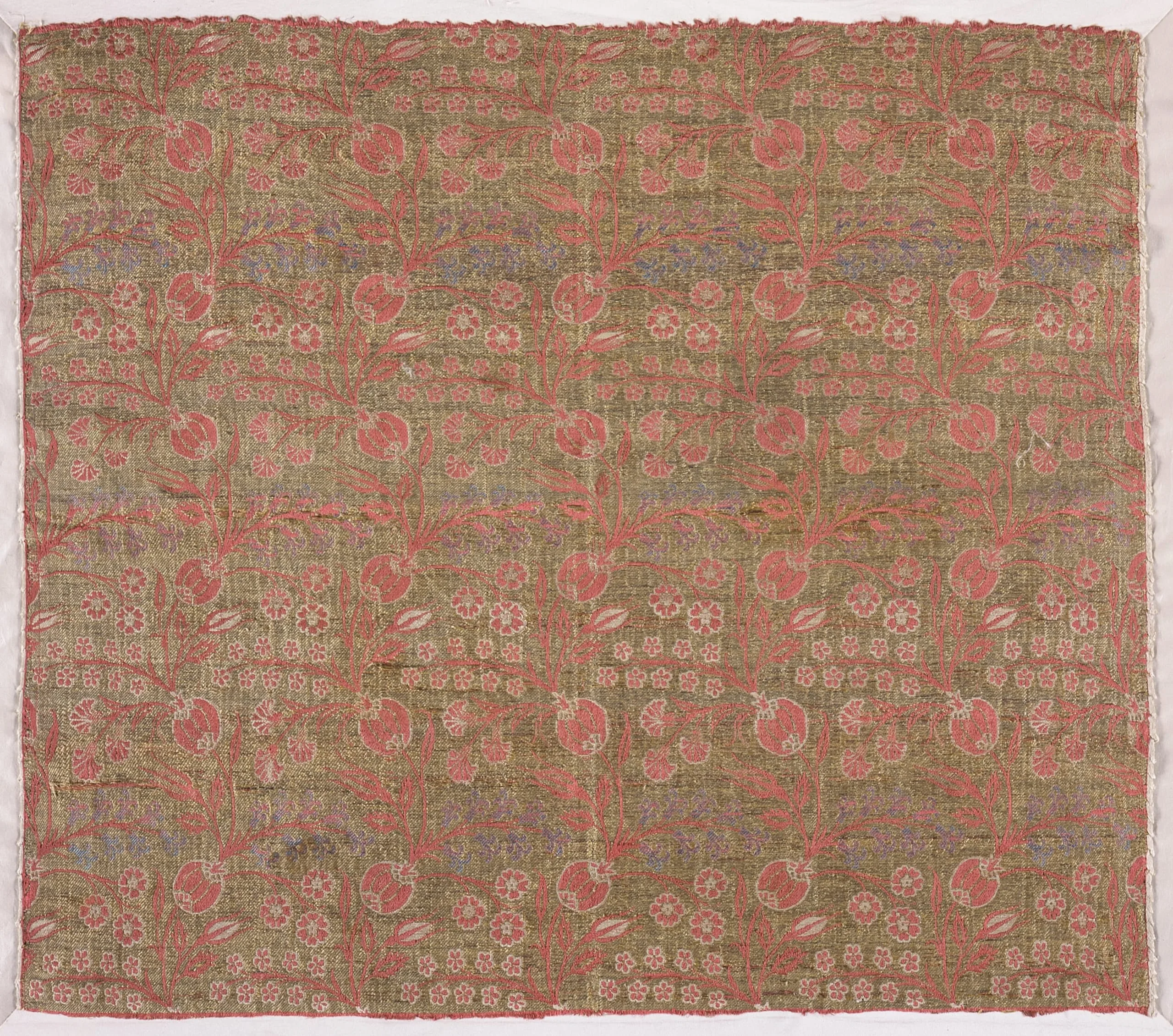 - Silk satin with silk and metallic thread supplementary weft patterning bound in twill (lampas).
