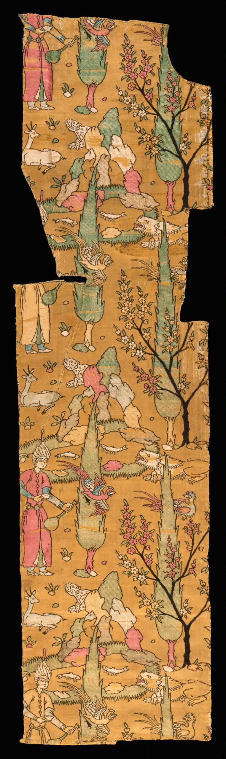 - Silk satin with silk supplementary-weft patterning bound in twill (lampas)