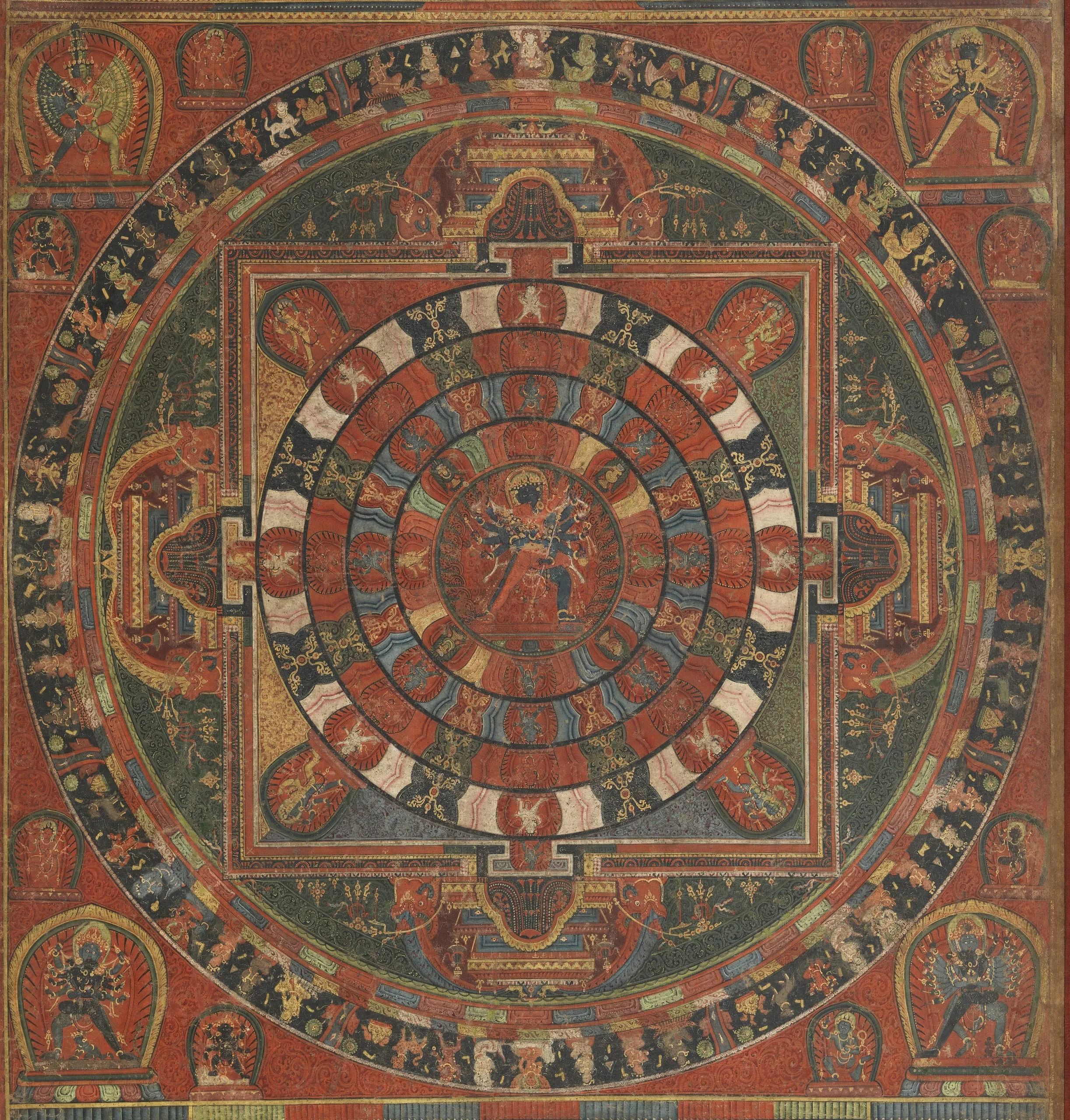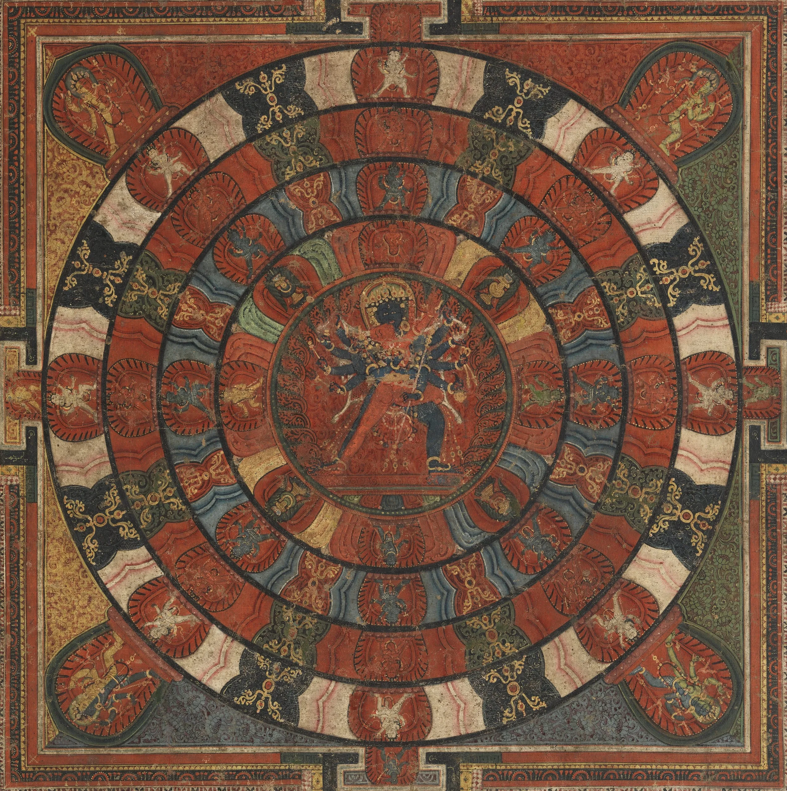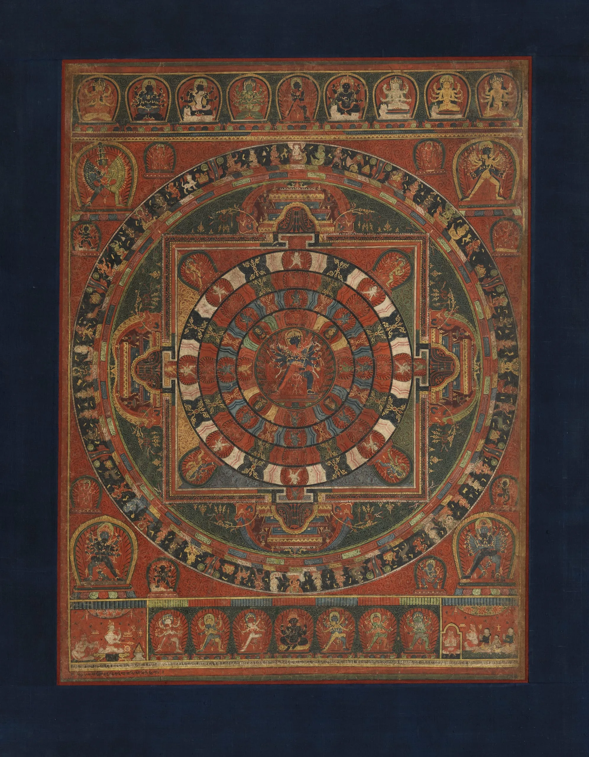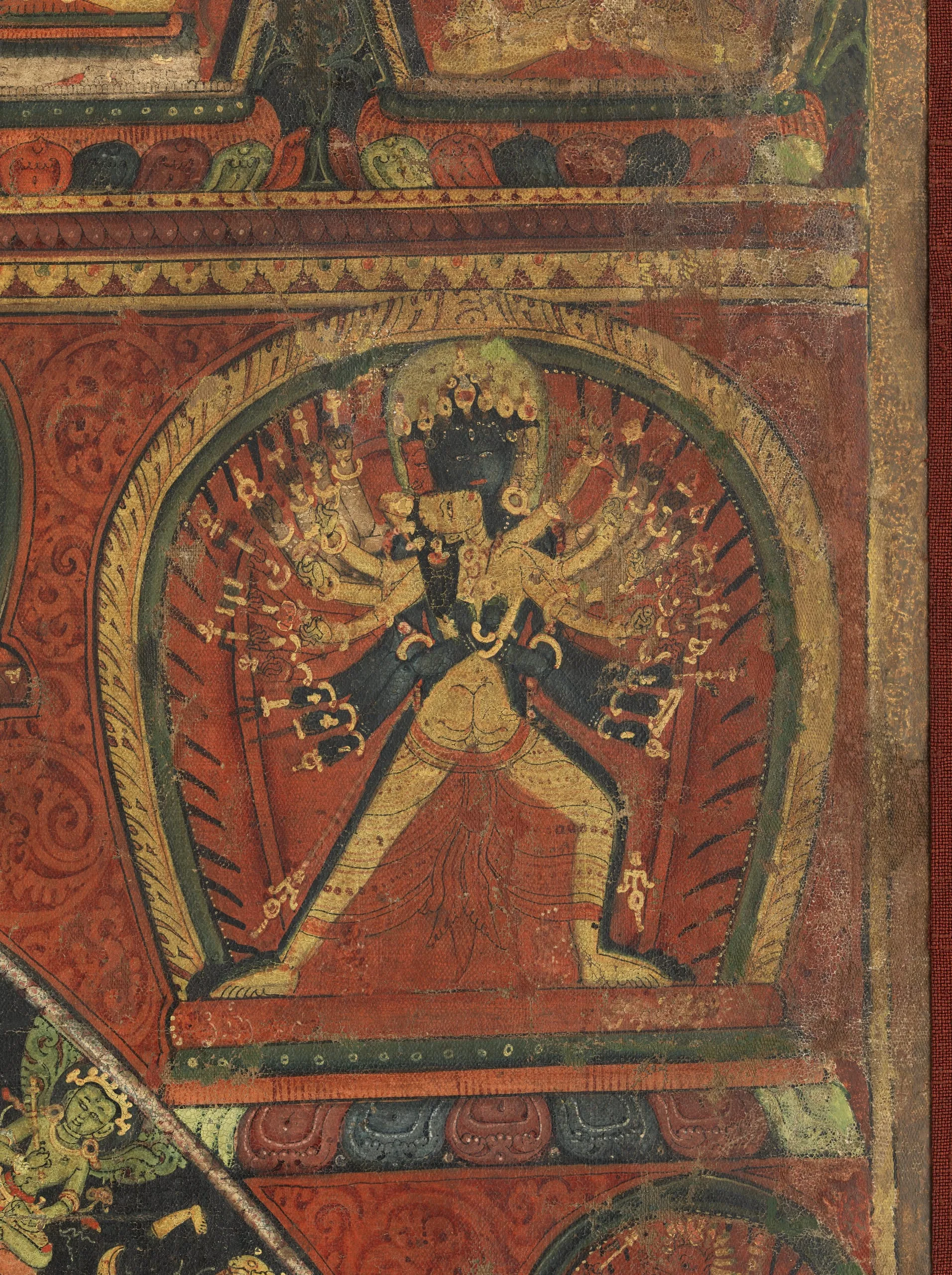 This painting provides a superb example of the fully detailed Chakrasamvara mandala iconography. Chakrasamvara and Vajravarahi are situated at the mandala’s core and a series of concentric circles, signifying the systematic purification of the practitioner’s body, radiates outward. The entire mandala is surrounded by the eight charnel fields, as an environment of renunciation of egoistic craving to prepare the practitioner for meditation.