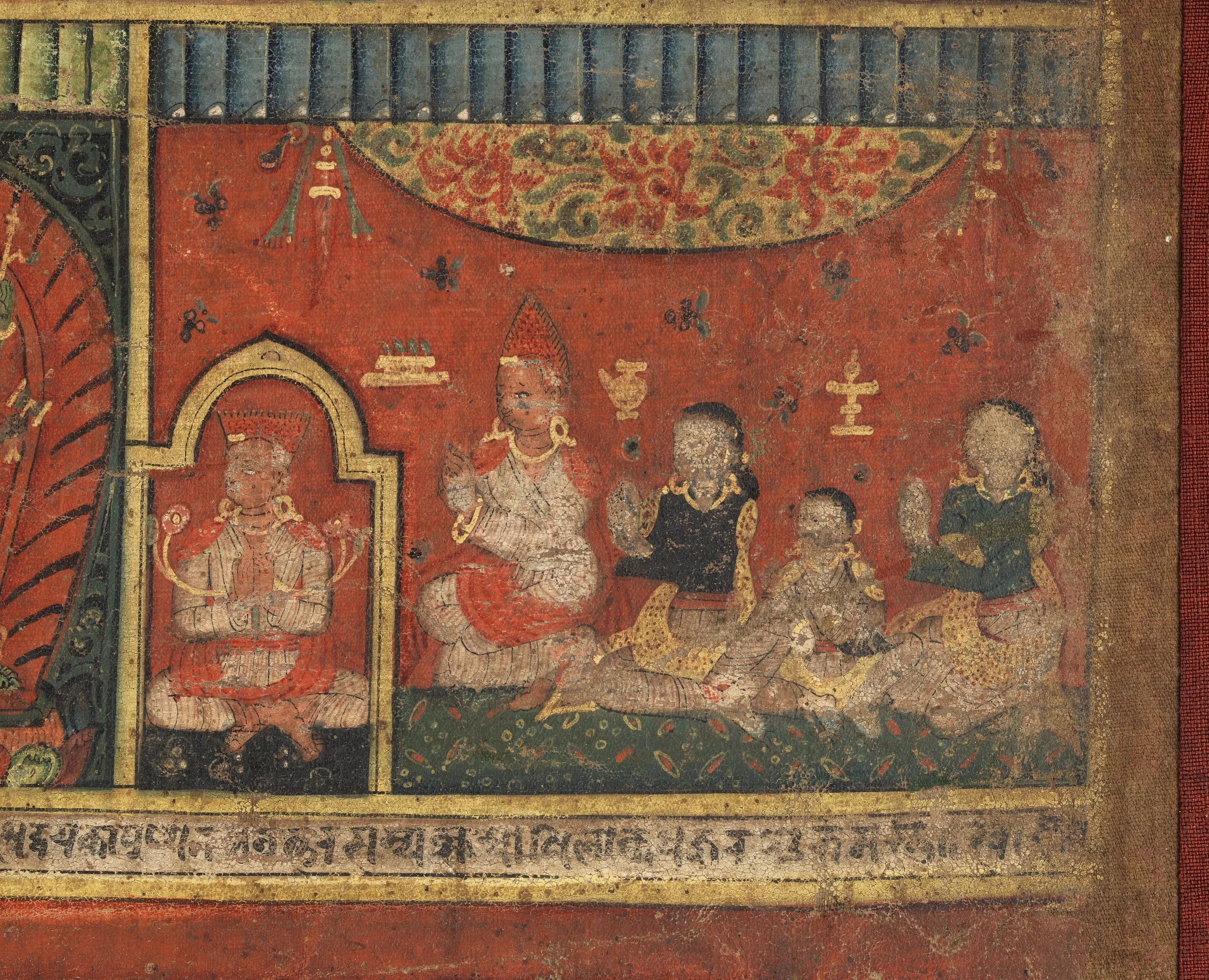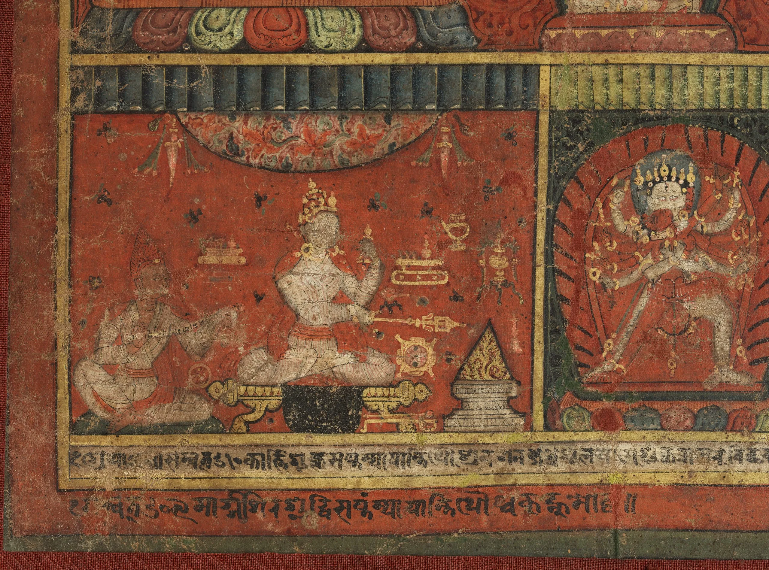 According to the Newari inscription in the footer, the painting was consecrated in 1490 (N.S. 610) during the one-year death-rite ceremony at the request of the donor Vajracharya Jayaraja of Manasu Vihara (monastery) in memory of the death of his father, Vajracharya Uhlasa, who is depicted as a white-haired figure at the lower right. The accuracy with which the scene also represents the priests performing the fire-sacrifice rituals is remarkable, since even in the contemporary context, similar rituals with Vajracharya priests continue to be performed with the same dynamism and vitality of the donors. The second inscription in the lower border states that Uhlasa died in the month of Mansir (December – January) in 1489 (N.S. 609).