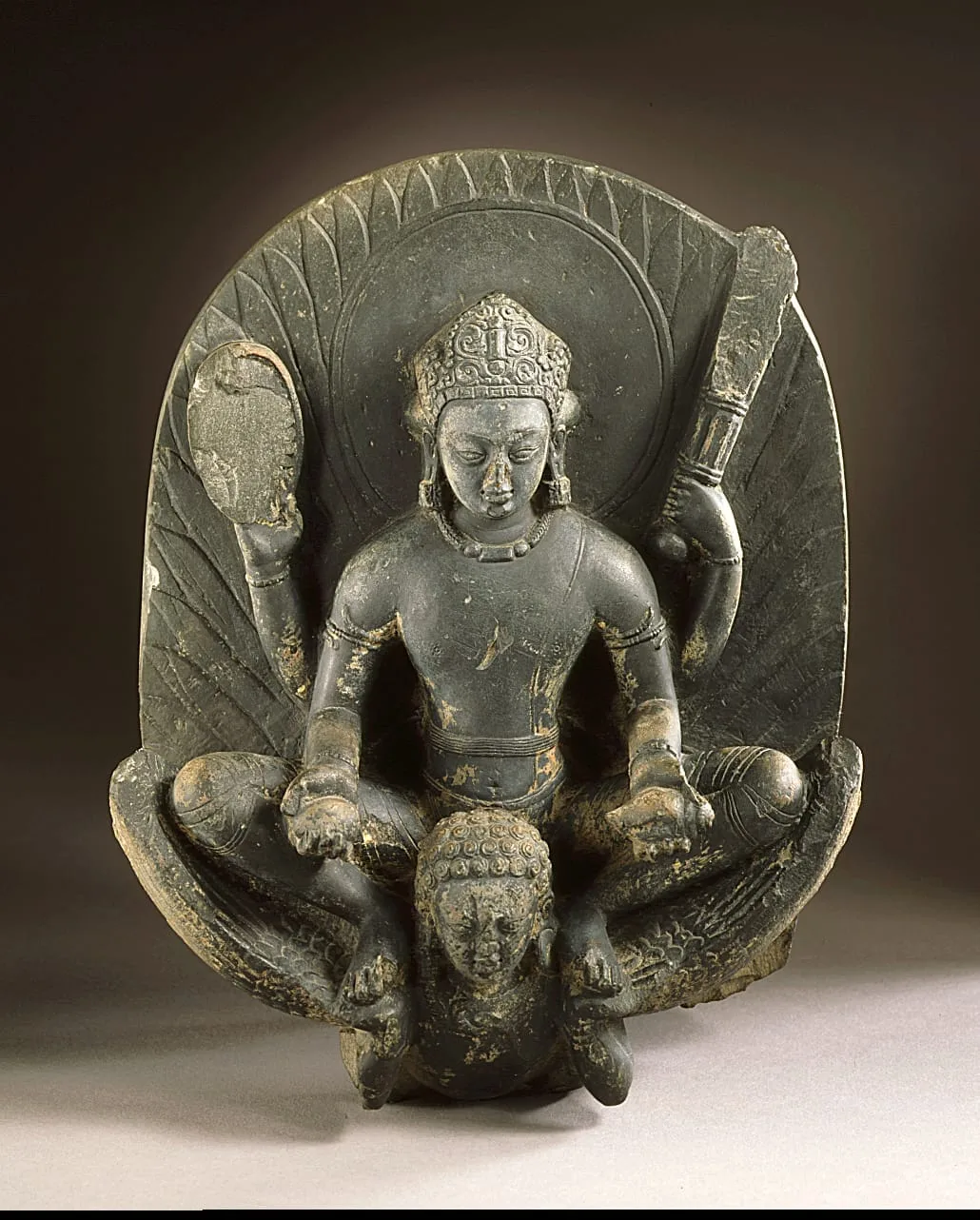 Vishnu, the Hindu God of Preservation, is portrayed in this 7th-century Nepalese sculpture as riding the sunbird Garuda, his half-avian, half-human mount (vahana). Vishnu squats on the shoulders of Garuda, who supports his feet. Vishnu is crowned and four-armed. His upper right hand holds his discus (chakra), while his upper left carries his mace (gada). His lower right hand holds the fruit of knowledge (jñana palam), while his lower left carries a conch (sankha). Garuda’s tail feathers are depicted fanlike to form an aureole (prabhavali) behind Vishnu, who is also given a plain circular nimbus. Stylistically, the inflated volumes used in depicting Vishnu’s body derive from the Mathura school of sculpture created during the northern Indian Gupta Dynasty (4th-6th century). See also M.77.65.2, M.77.154.12, and M.86.247.2.