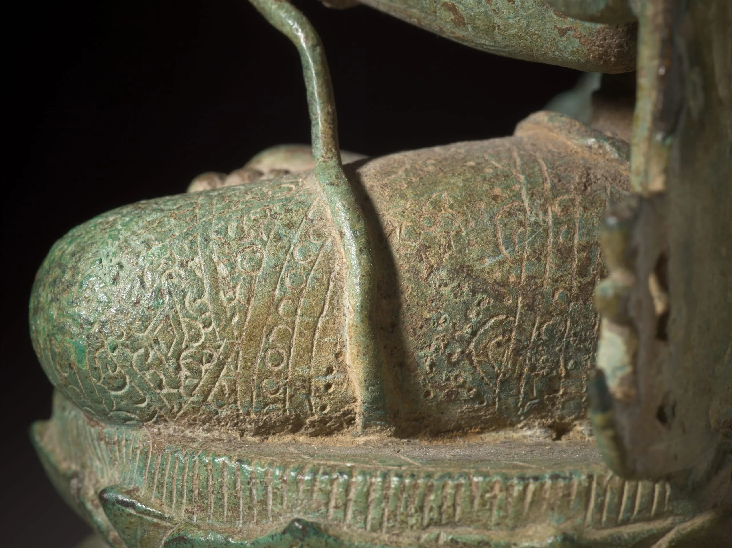 Tara has the piled hair of an ascetic without an identifying small image (bimba) in her crown of her emanation source deity. She is seated on a lotus base in the meditation posture (padma asana). She has a gracious countenance and wears standard jewelry, a sash over her left shoulder, and a patterned lower garment. She is four-armed. In her upper right hand, she holds a rosary (akshamala). Her lower right hand is extended in the gesture of charity (varada mudra). In her upper left hand, she holds a sacred manuscript (pustaka). Her lower left hand holds the stalk of a lotus. Behind her is an aureole (prabhavali) with a flaming border. Its finial, now damaged, was likely an honorific parasol (chattra).