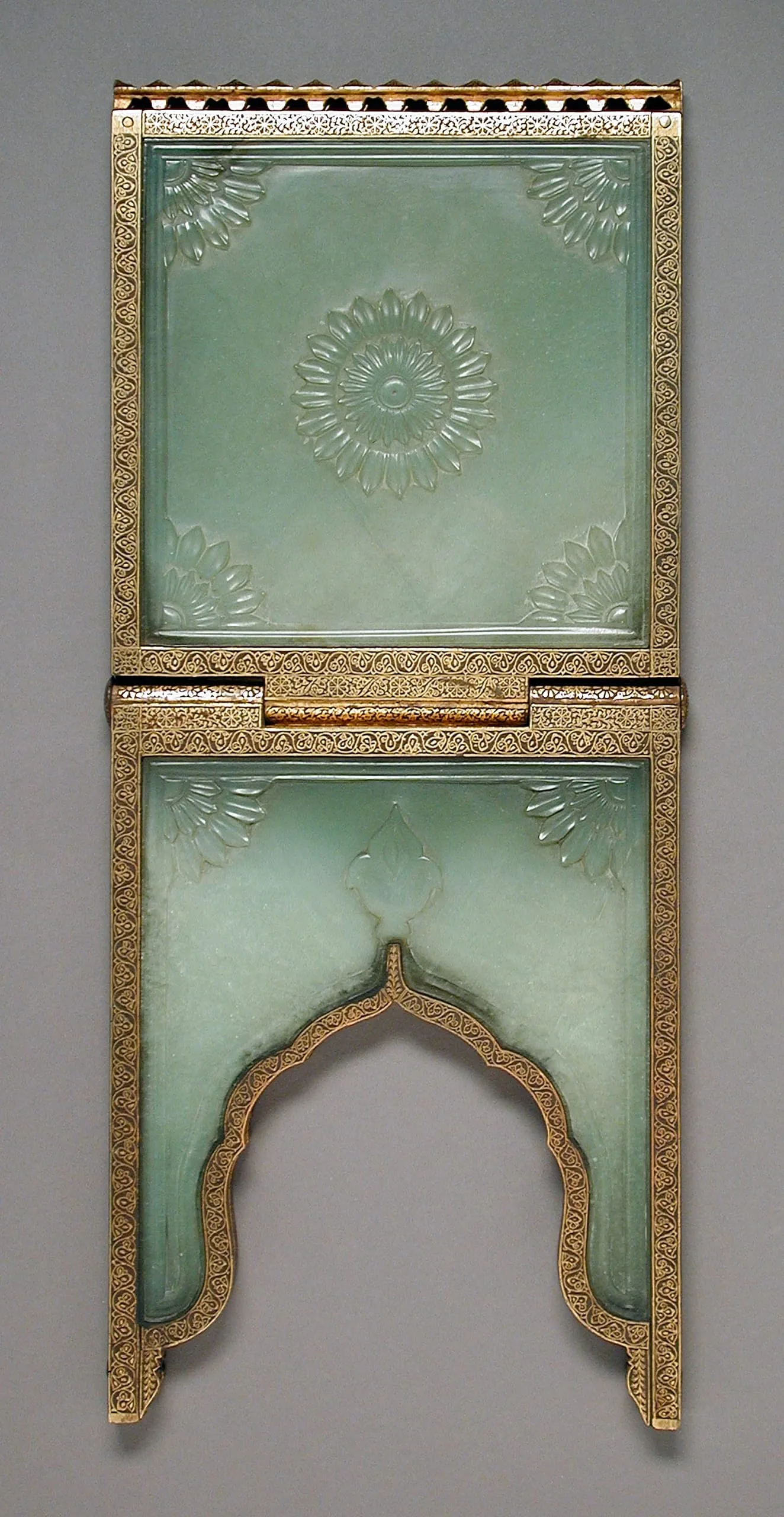 This collapsible bookstand (X-shaped when open and in use) was made for supporting an Islamic Qur'an during reading and recitation. The bookstand is bound with a steel frame decorated principally with a bud-and-creeper scroll design that is inlaid with gold wire in the koftgari technique characteristic of Panjabi metalware. Diamond-shaped crenulations articulate the frame’s top edges. Encased within the frame are panels of light green lizardite serpentine, which is occasionally employed as a jade simulant because of its close visual similarity, and because it is easier to carve than nephrite jade due to having a softer surface. The panels are adorned on the exterior with concentric lotus flowers in the center and quarter-flowers in most corners. The legs of the stand are formed into pointed architectural-style arches, which are surmounted by a palmette-shaped pinnacle sometimes found on Islamic architecture and ceremonial standards.