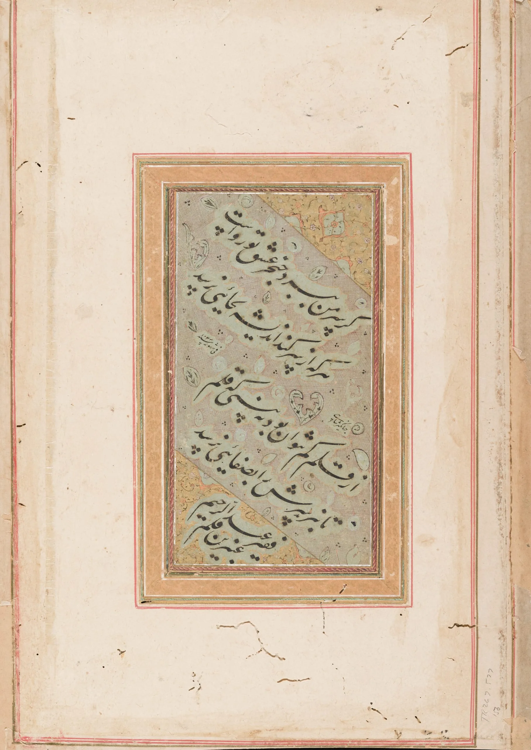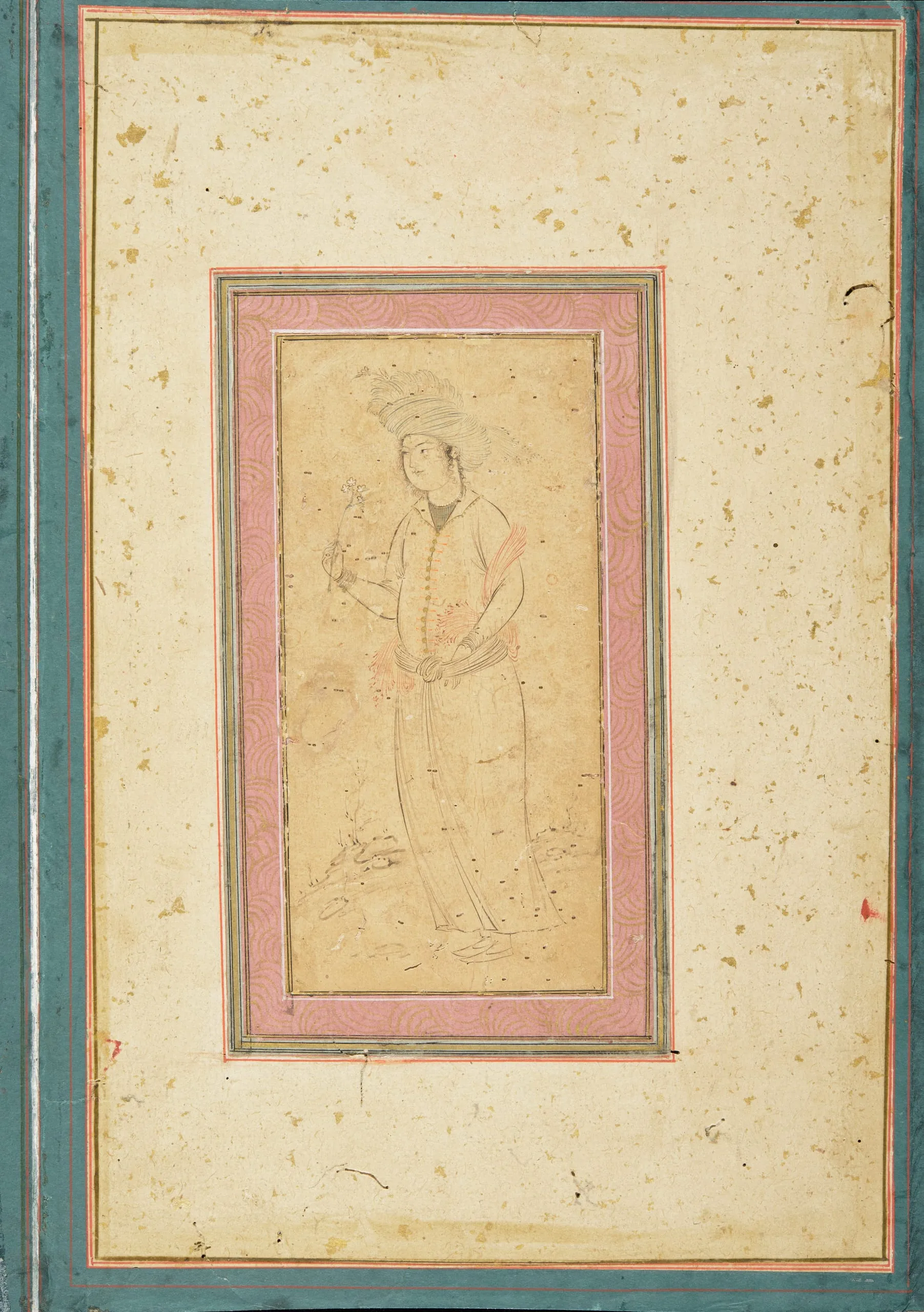 This depiction of an elegant young dandy holding a flower sprig exemplifies the types of pen-and-ink drawings that became popular in seventeenth-century Iran. Here the artist uses line to capture the fullness of the youth’s turban, the swaying folds of his robe, and the delicate tendrils of curled hair around his face, imbuing the drawing with a subtle lyricism and reinforcing the man’s leisurely attitude.