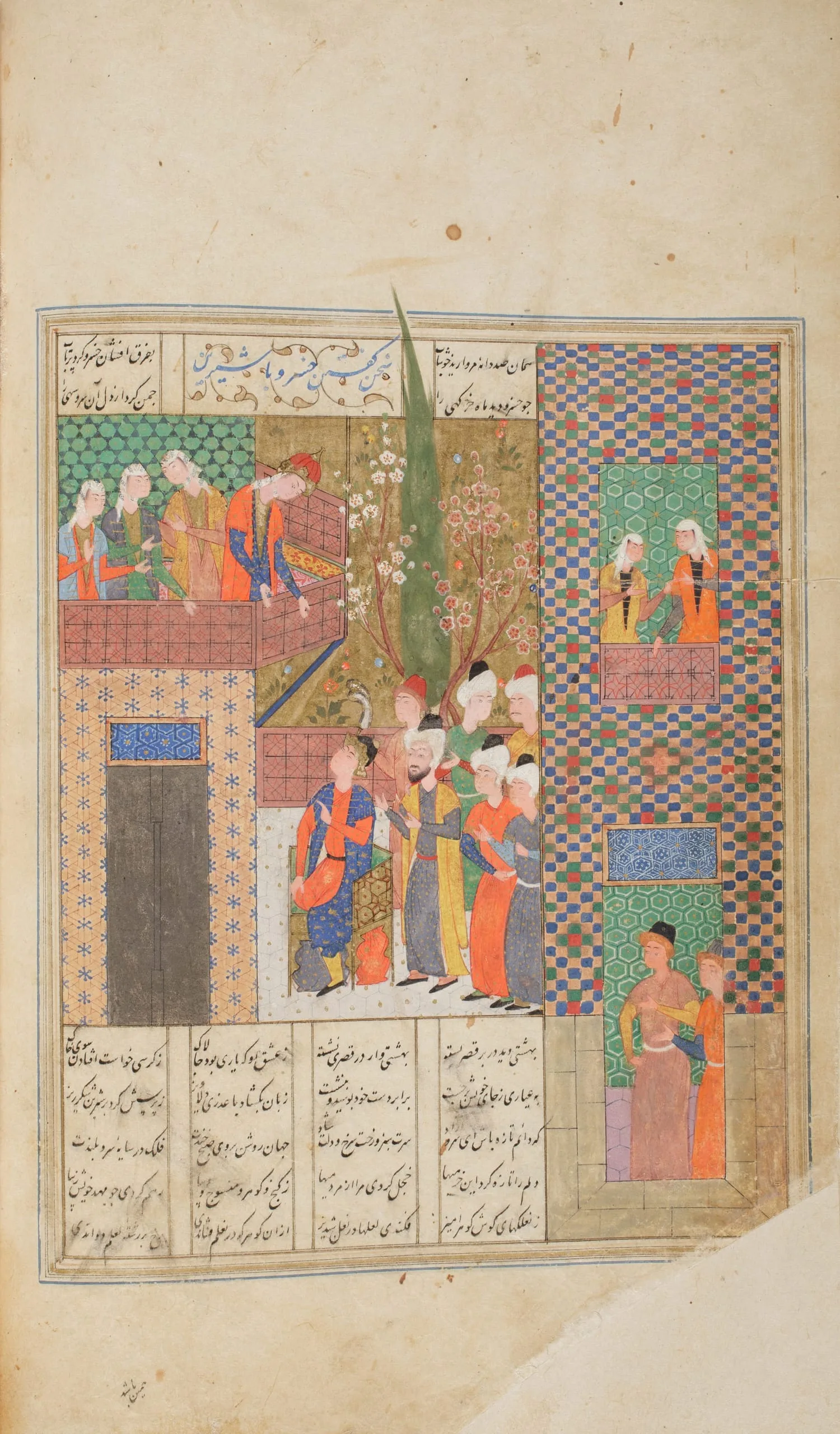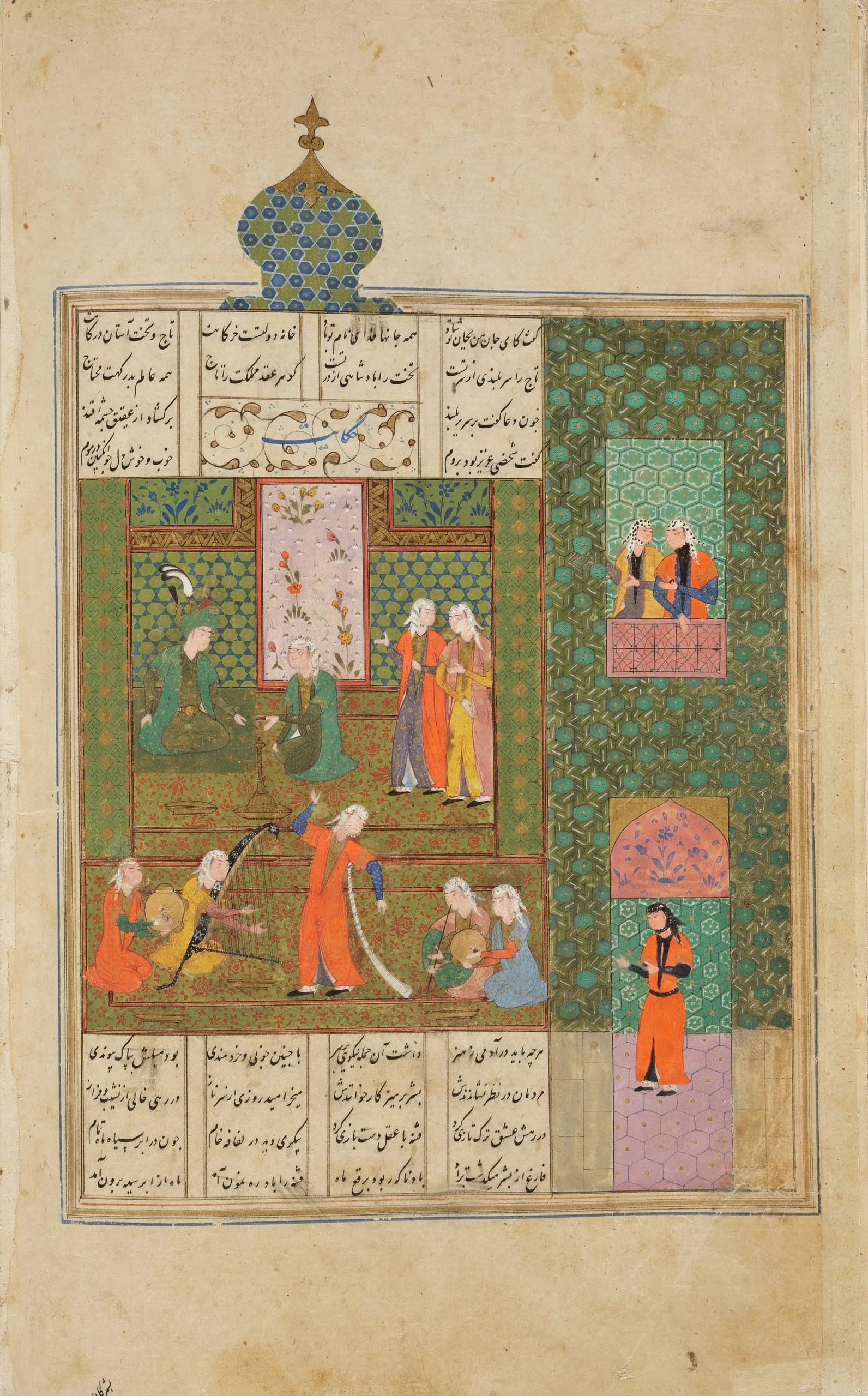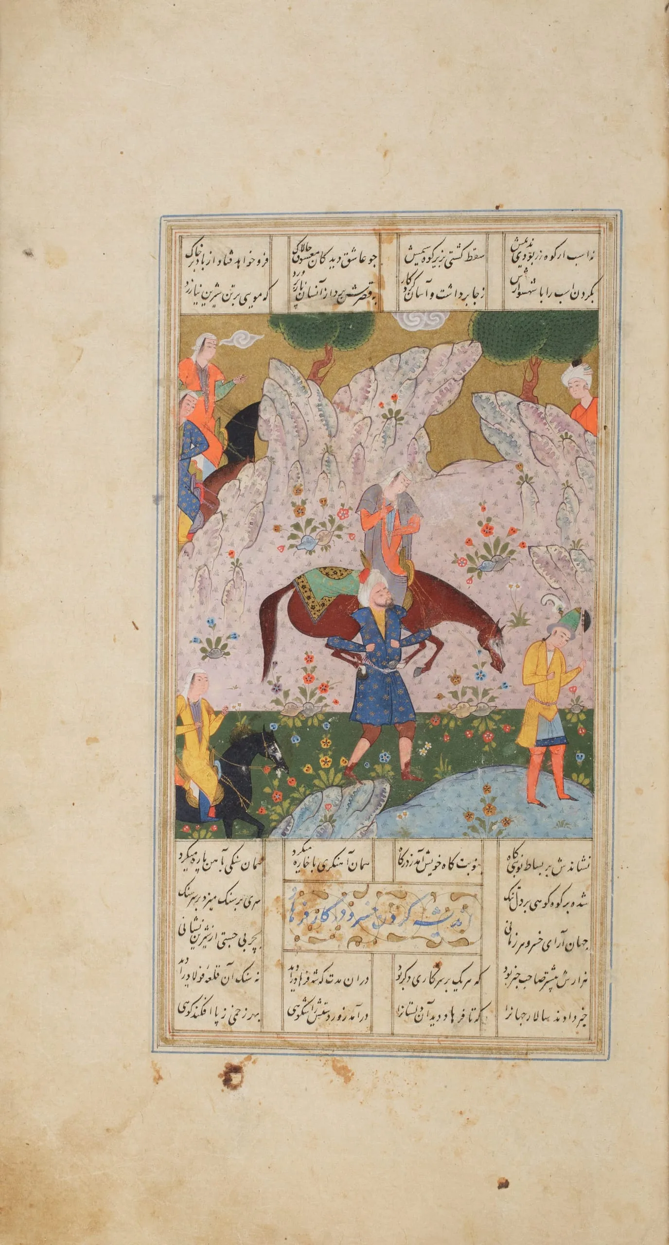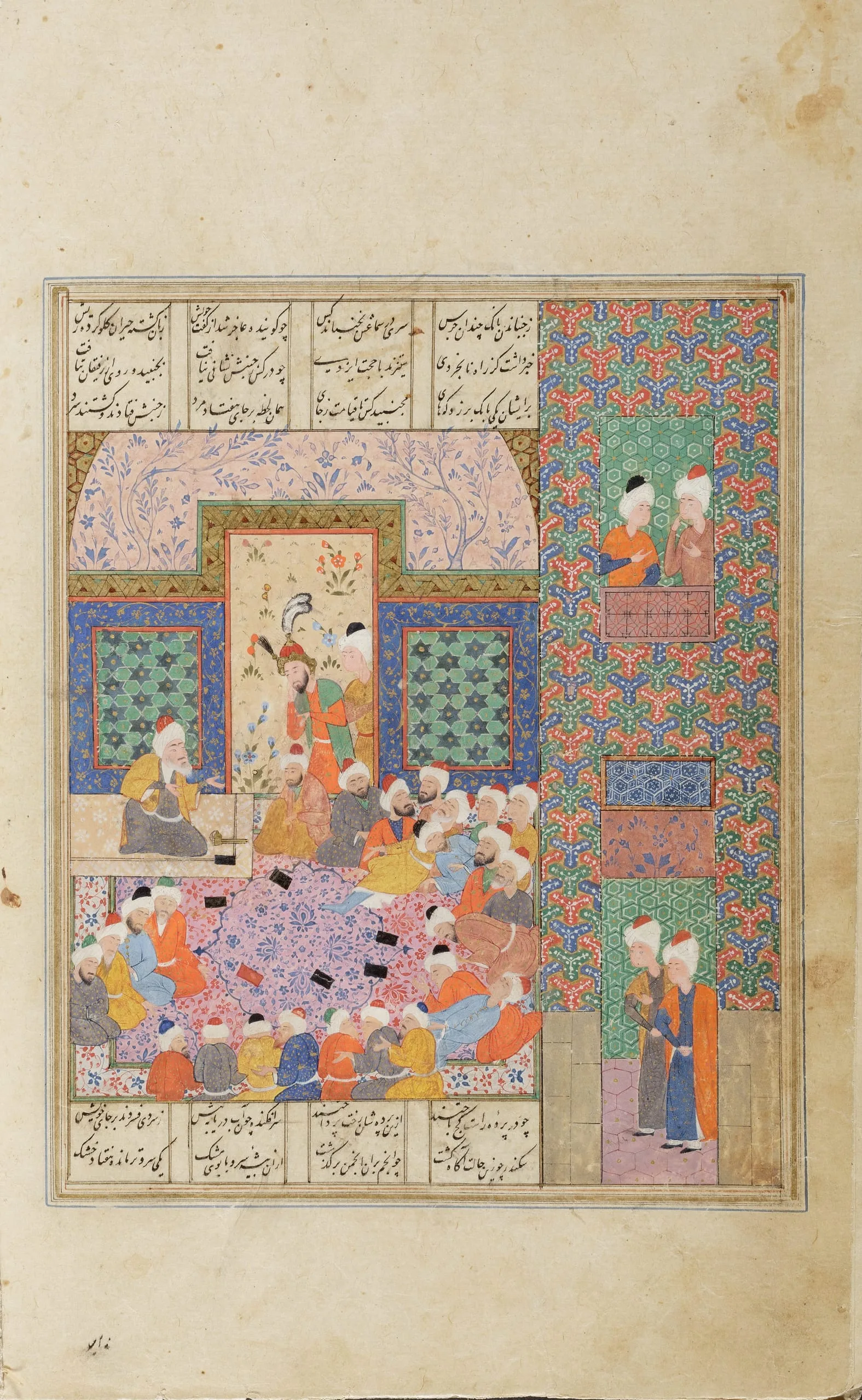 The southwestern Iranian city of Shiraz was a major center of illustrated manuscript production in the sixteenth century. Shiraz manuscripts were often executed at a level of quality that rivaled that of the royal courts in Tabriz and later Qazvin, and they were avidly collected by elites from both Safavid Iran and Ottoman Turkey. This fine mid-sixteenth-century manuscript of Nizami’s Khamsa (Quintet) includes fourteen nearly full-page illustrations, whose heavily patterned architectural interiors and lively multifigural ensembles are characteristic of Shiraz painters at their best.
