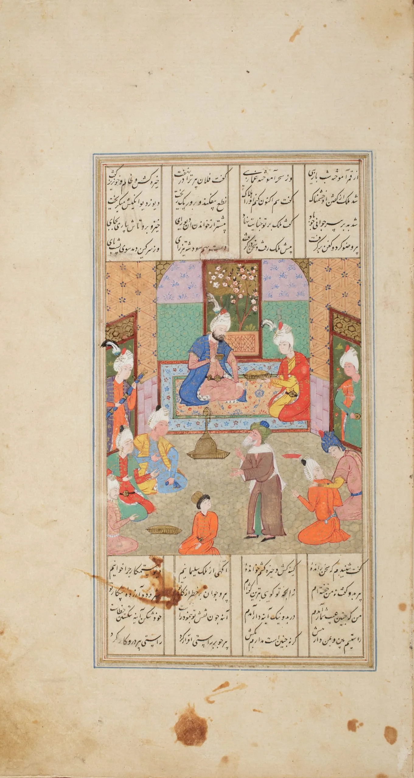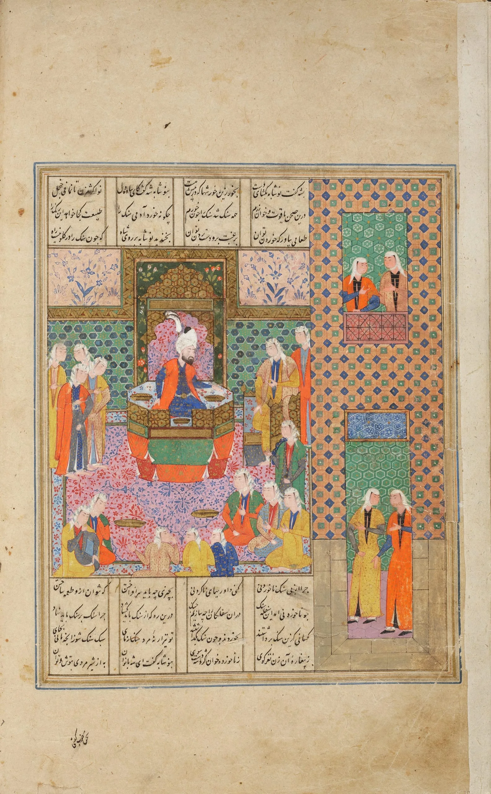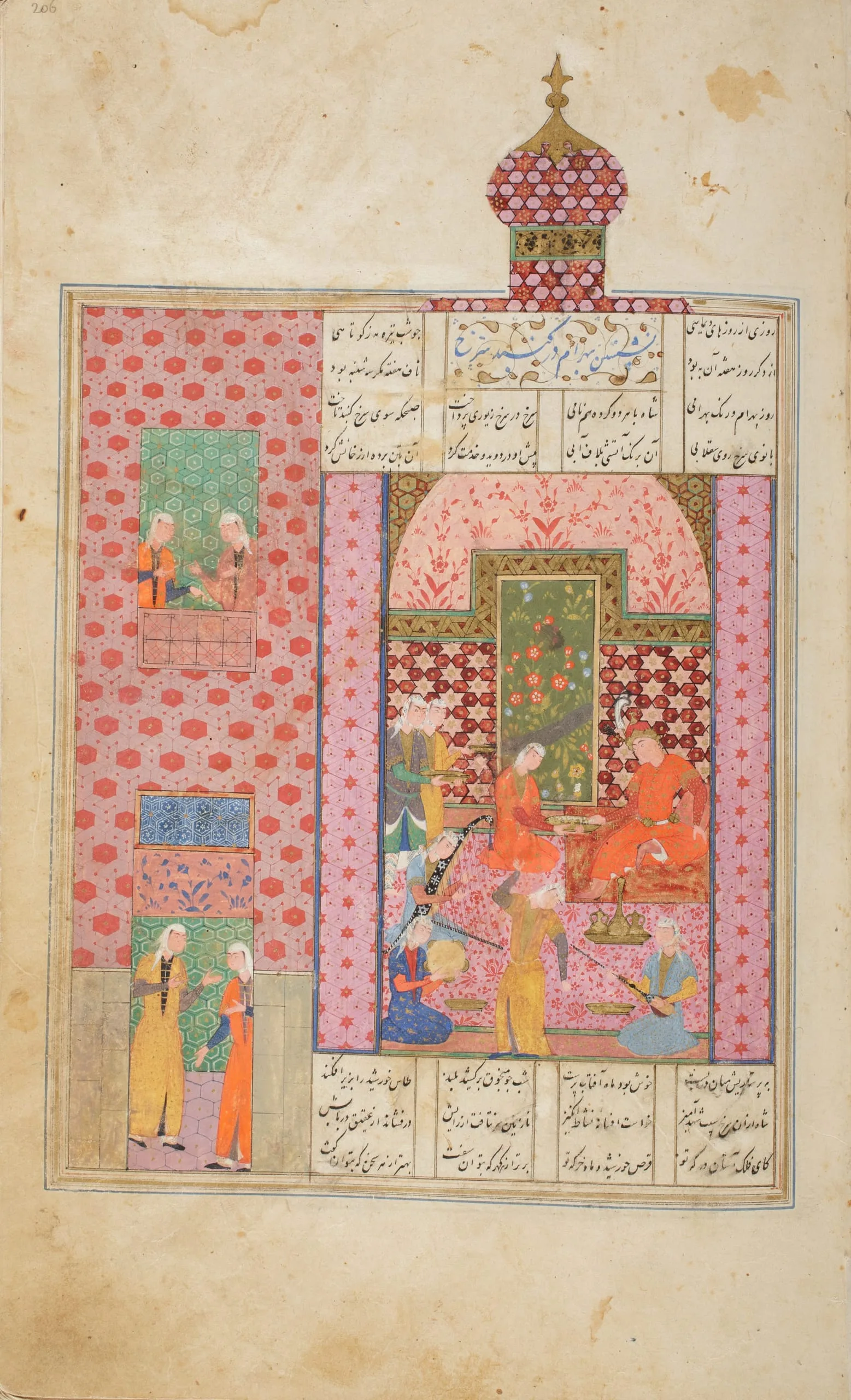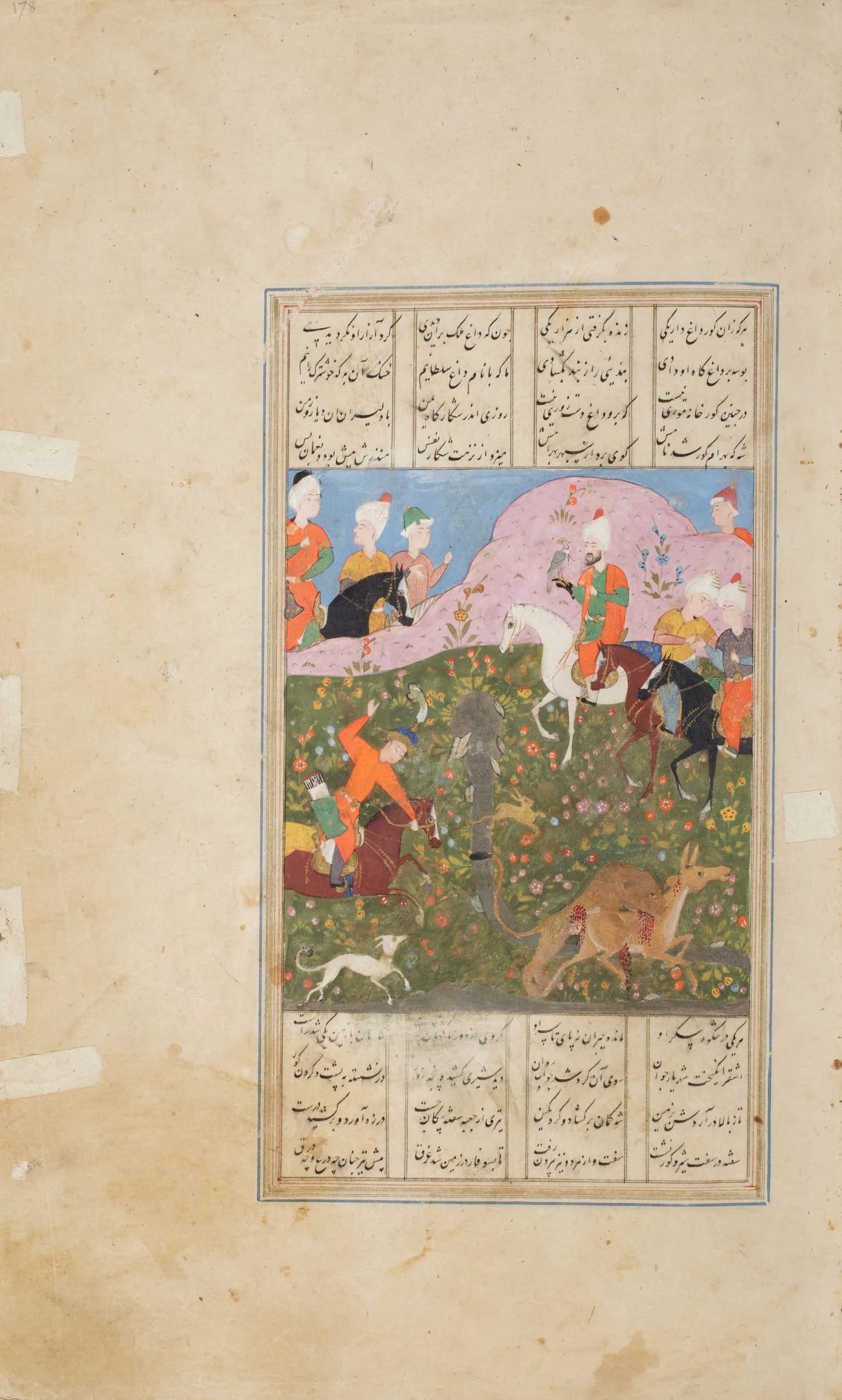 The southwestern Iranian city of Shiraz was a major center of illustrated manuscript production in the sixteenth century. Shiraz manuscripts were often executed at a level of quality that rivaled that of the royal courts in Tabriz and later Qazvin, and they were avidly collected by elites from both Safavid Iran and Ottoman Turkey. This fine mid-sixteenth-century manuscript of Nizami’s Khamsa (Quintet) includes fourteen nearly full-page illustrations, whose heavily patterned architectural interiors and lively multifigural ensembles are characteristic of Shiraz painters at their best.