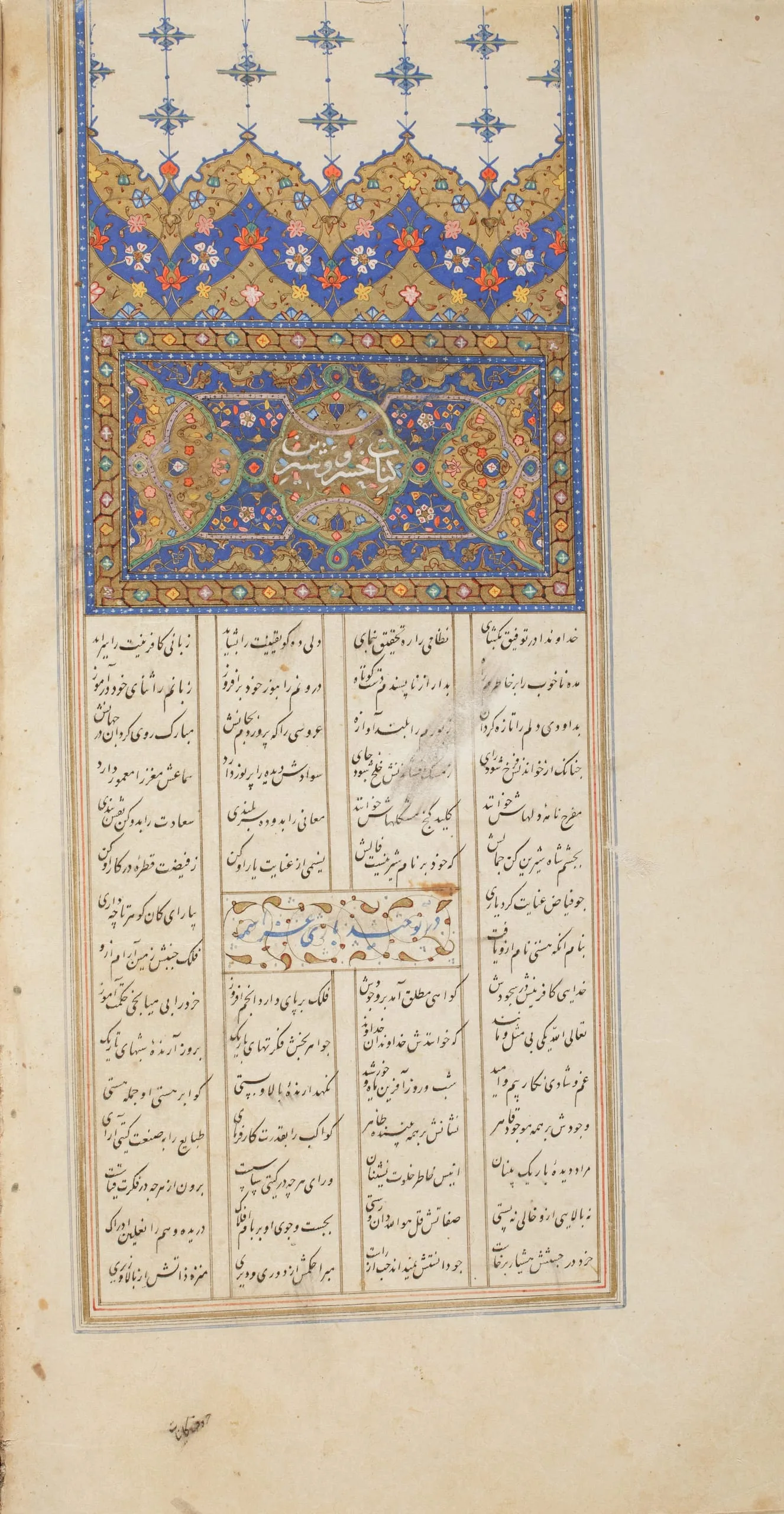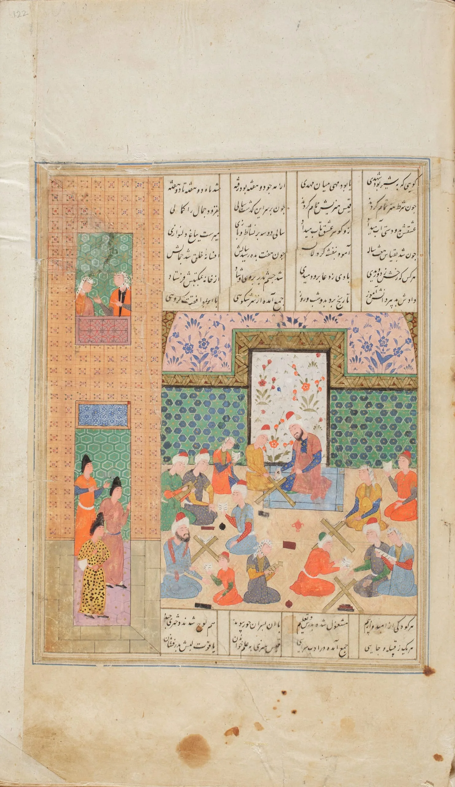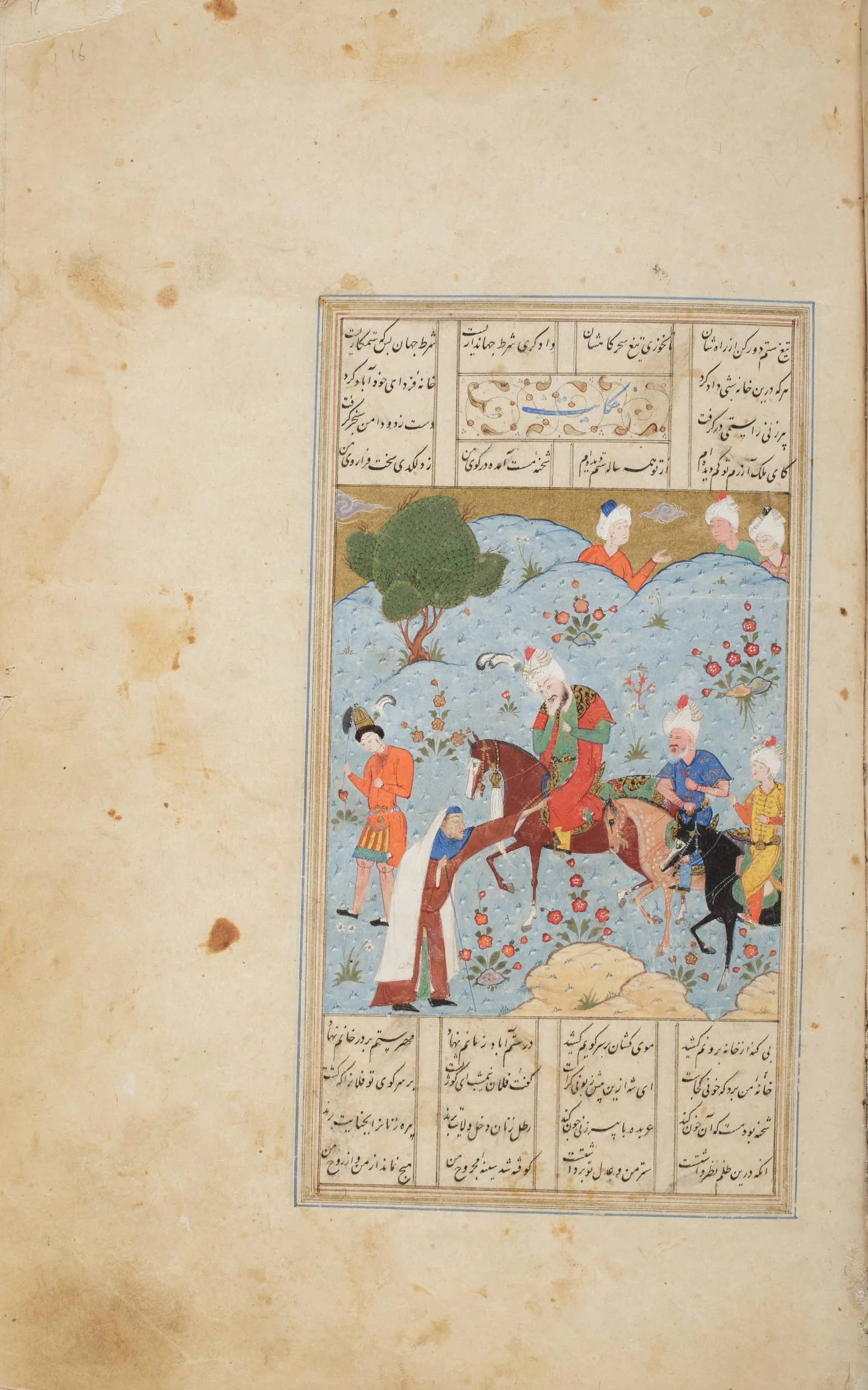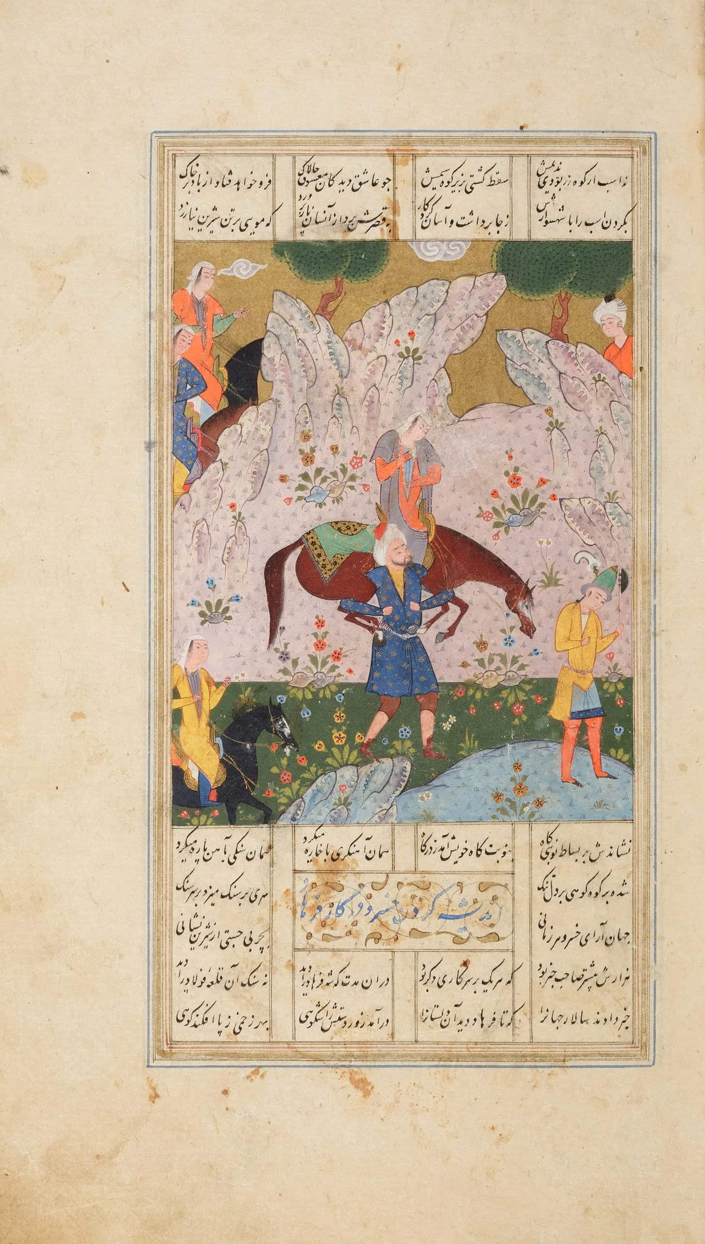 The southwestern Iranian city of Shiraz was a major center of illustrated manuscript production in the sixteenth century. Shiraz manuscripts were often executed at a level of quality that rivaled that of the royal courts in Tabriz and later Qazvin, and they were avidly collected by elites from both Safavid Iran and Ottoman Turkey. This fine mid-sixteenth-century manuscript of Nizami’s Khamsa (Quintet) includes fourteen nearly full-page illustrations, whose heavily patterned architectural interiors and lively multifigural ensembles are characteristic of Shiraz painters at their best.