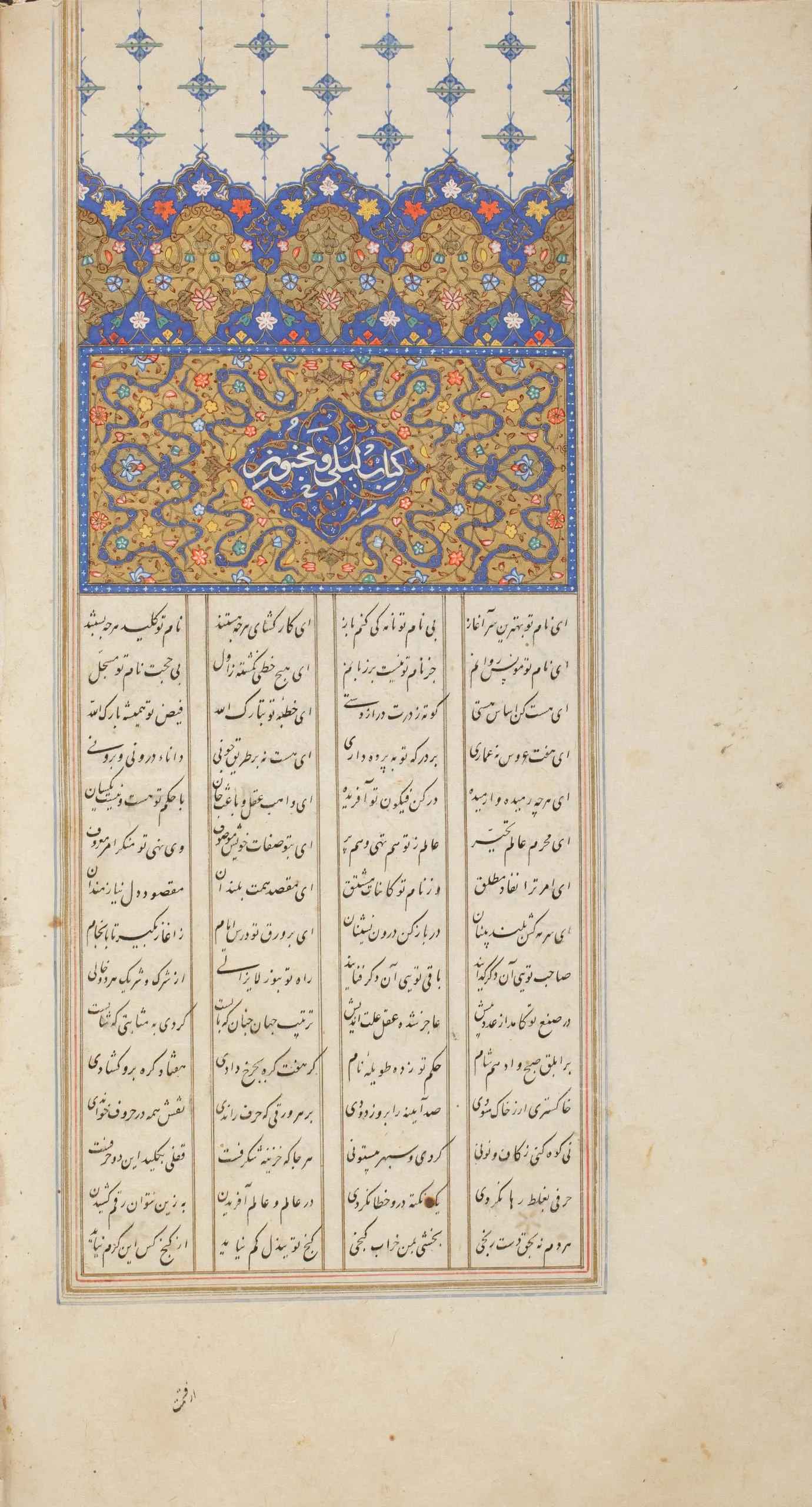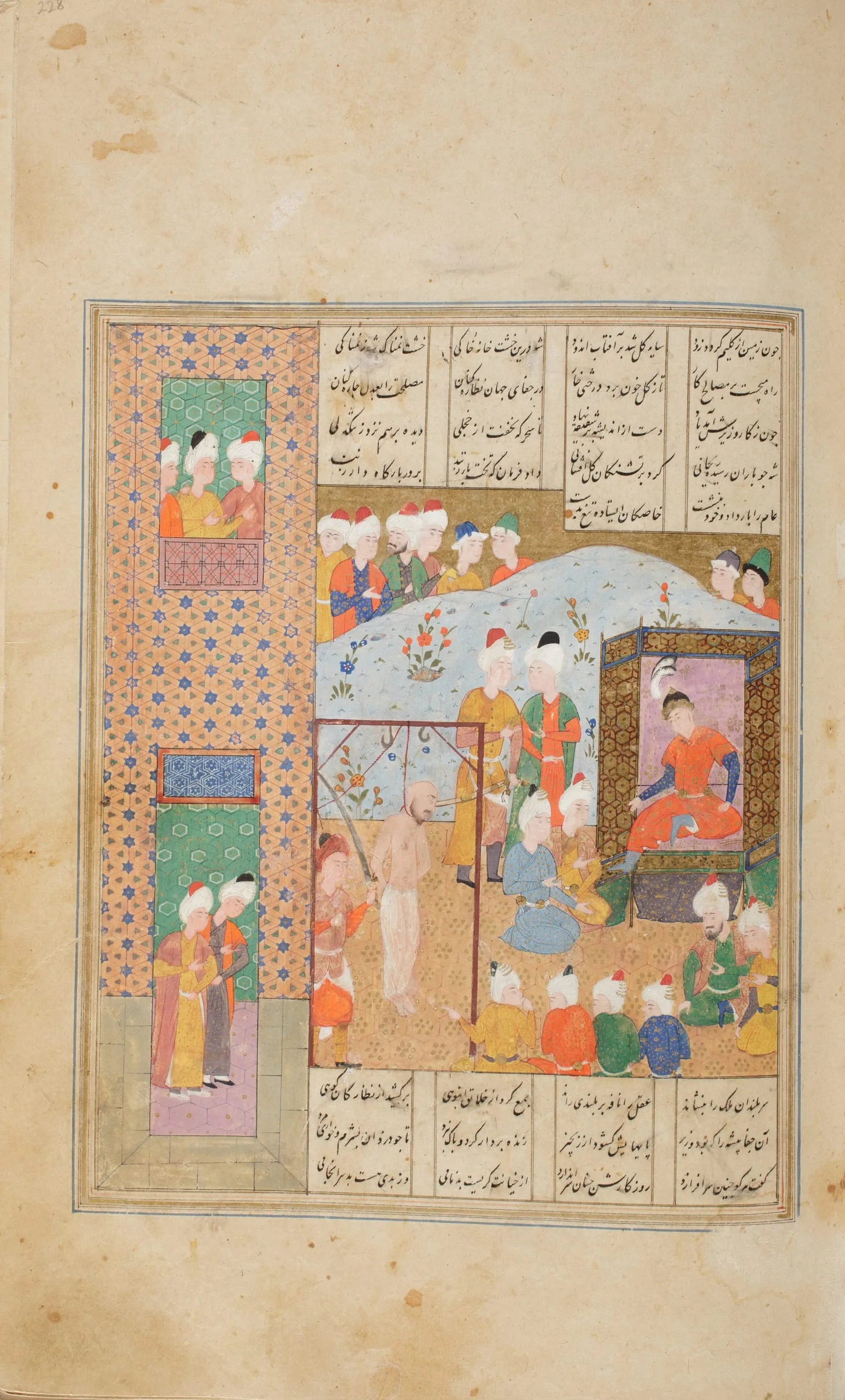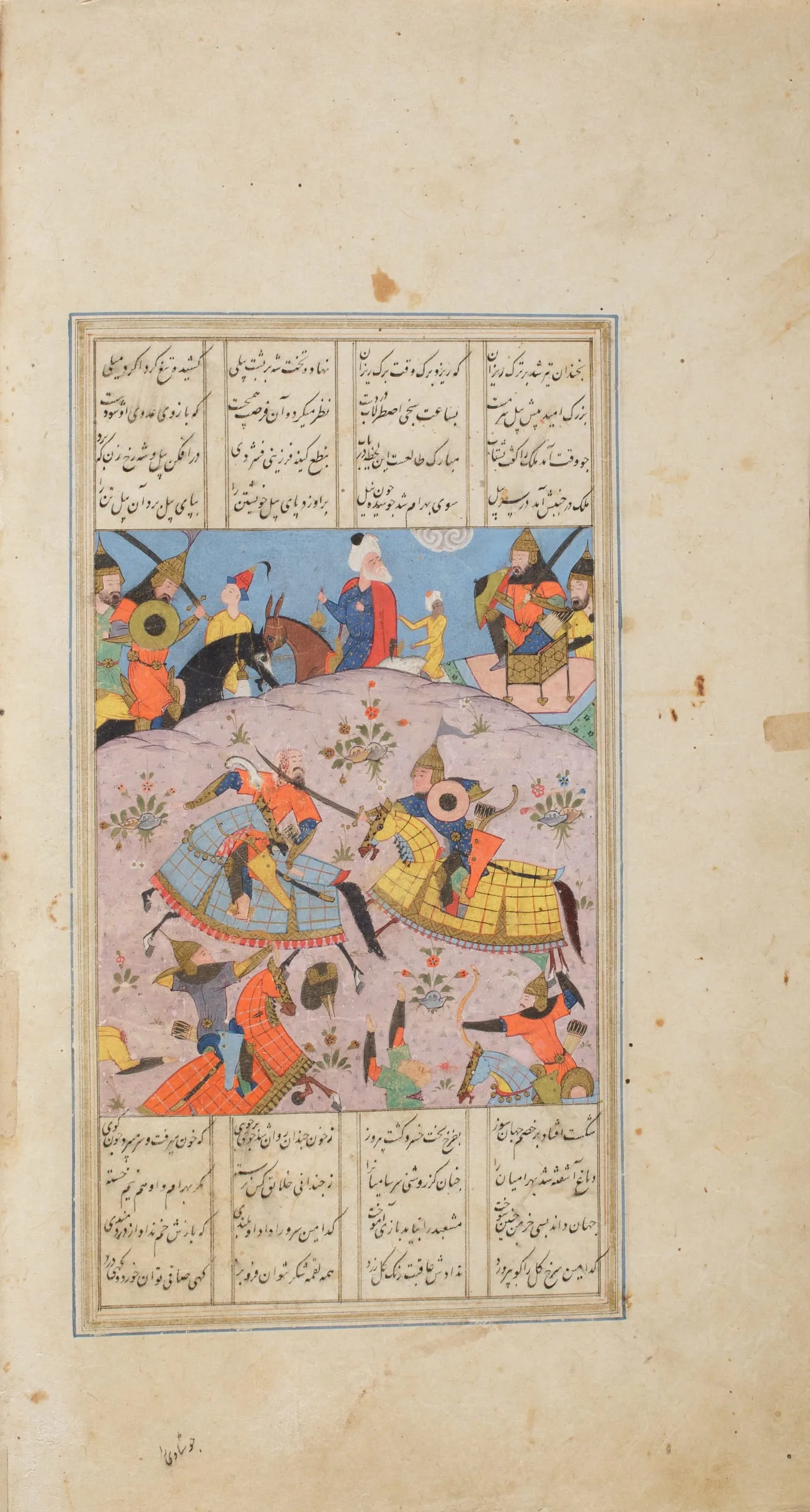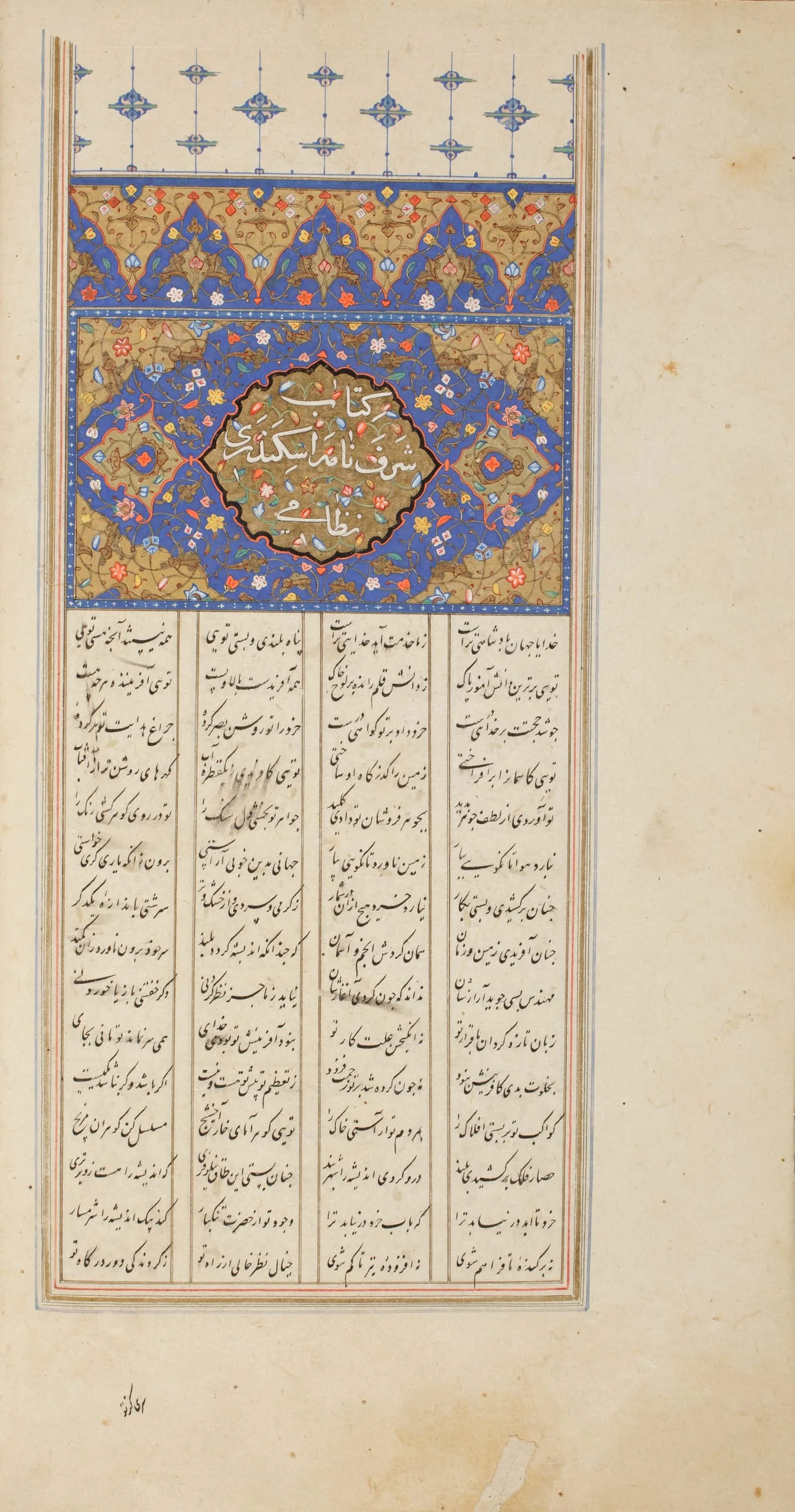 The southwestern Iranian city of Shiraz was a major center of illustrated manuscript production in the sixteenth century. Shiraz manuscripts were often executed at a level of quality that rivaled that of the royal courts in Tabriz and later Qazvin, and they were avidly collected by elites from both Safavid Iran and Ottoman Turkey. This fine mid-sixteenth-century manuscript of Nizami’s Khamsa (Quintet) includes fourteen nearly full-page illustrations, whose heavily patterned architectural interiors and lively multifigural ensembles are characteristic of Shiraz painters at their best.