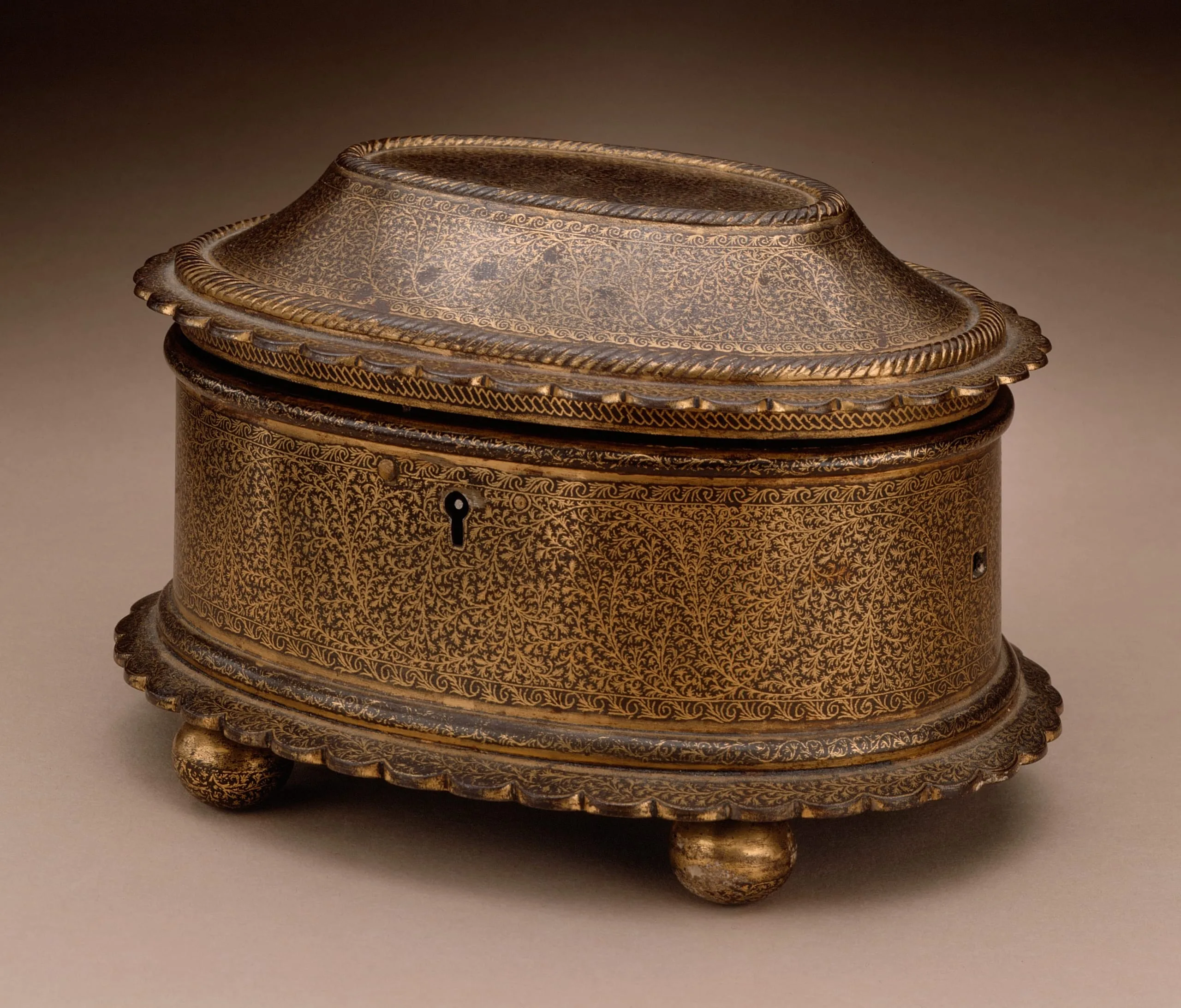 Manufactured in a metalworking technique known as koftgari (made by beating), this oval shaped jewelry box is embellished over most of its surface with foliate motifs of lacelike fineness. The side of the body and the slightly concave sloped top of the lid feature scrolling vegetation. The flat top of the lid has vegetal designs in delicate cartouches. The lid and base have complimenting scalloped rims. Cable molding borders (resembling braided wire) are repeated on the lid. Round balls serve as the feet.