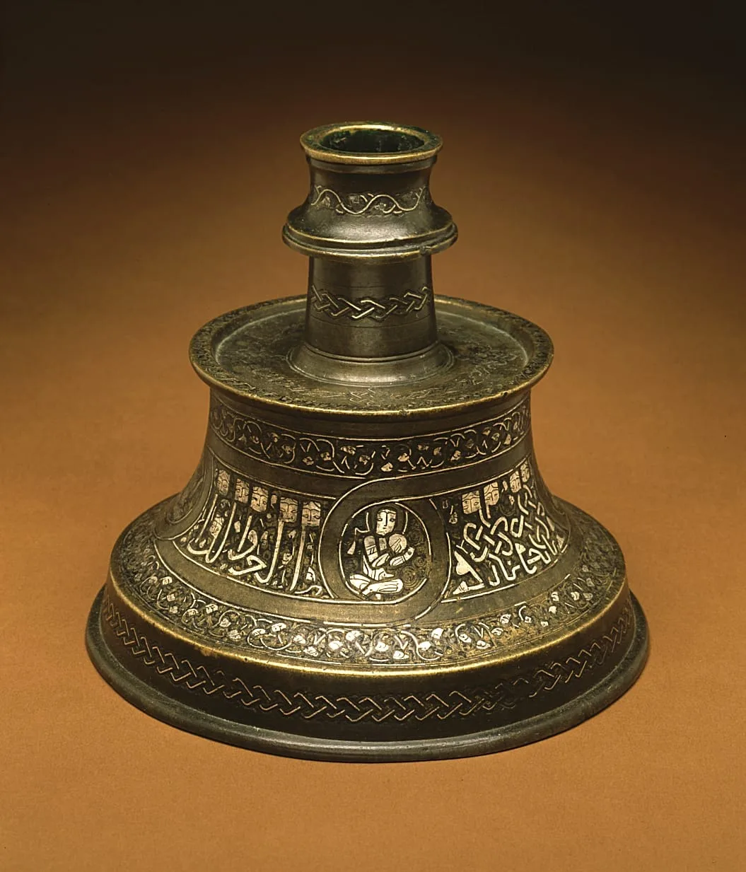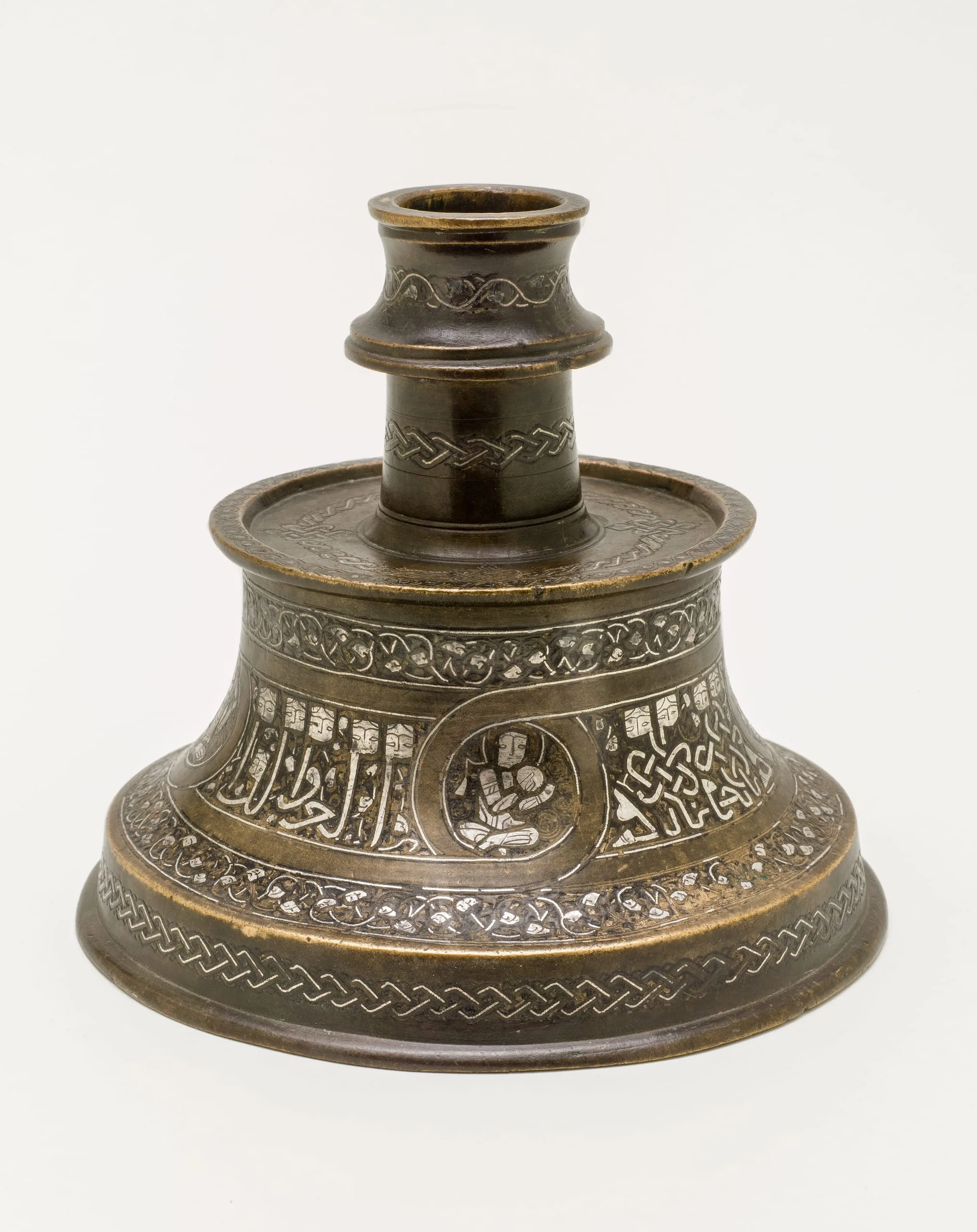 Sometime toward the middle of the twelfth century, the metalwork industry in Iran underwent a major transformation that was to be of signal importance for its history. Bronze and brass objects were decorated with silver, and/or copper or gold inlay of figural imagery, including scenes of pleasure and pastime, and inscriptions in a variety of scripts offering good wishes to a generally unnamed owner. At its base, this silver-inlaid candlestick is circumscribed by a band of alternating medallions and epigraphic cartouches filled with animated inscriptions in which stylized faces surmount the shafts of the vertical letters or are arranged along the top of the text. Each of the four medallions encloses an image of a musician or a seated reveler, motifs associated with a feast.