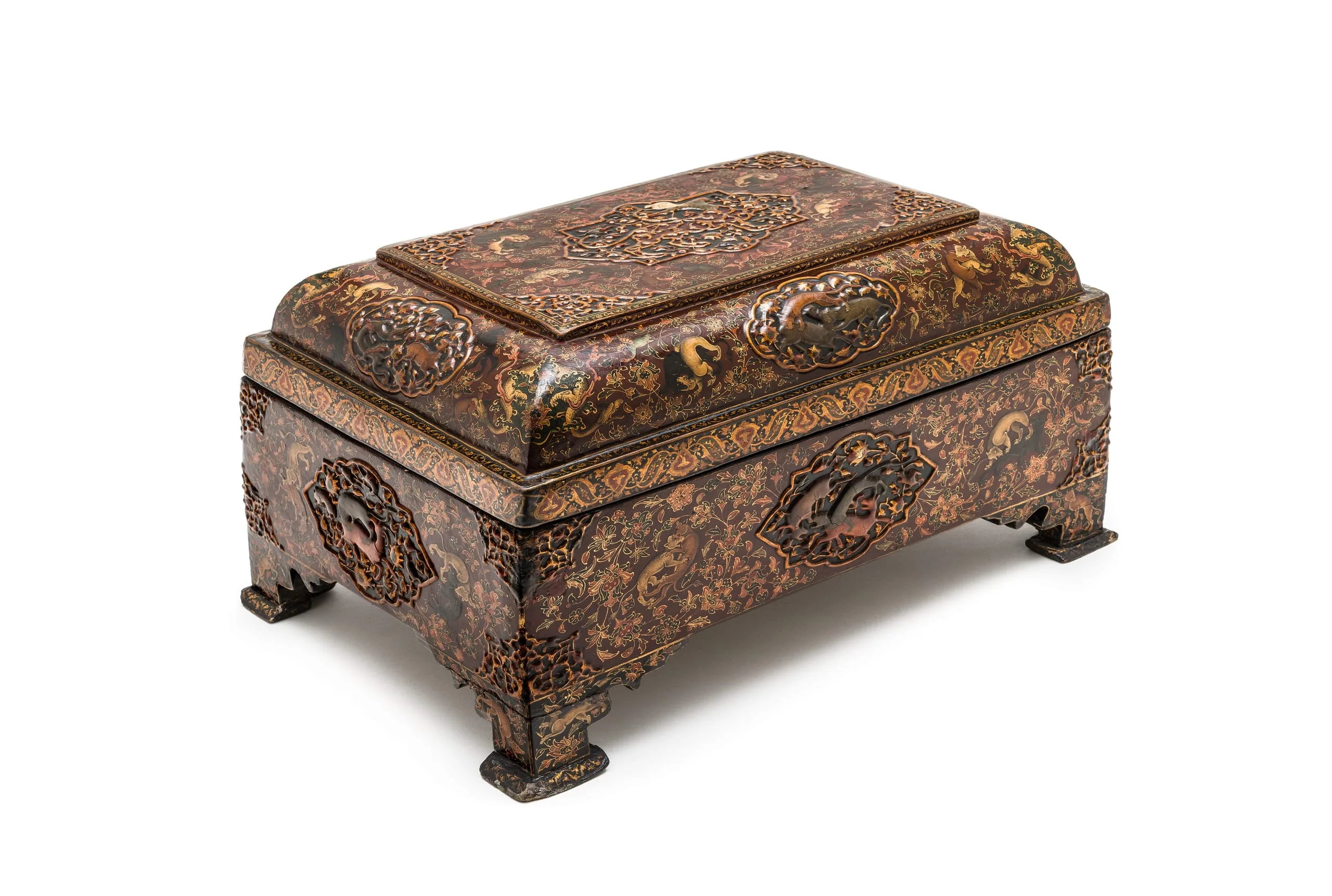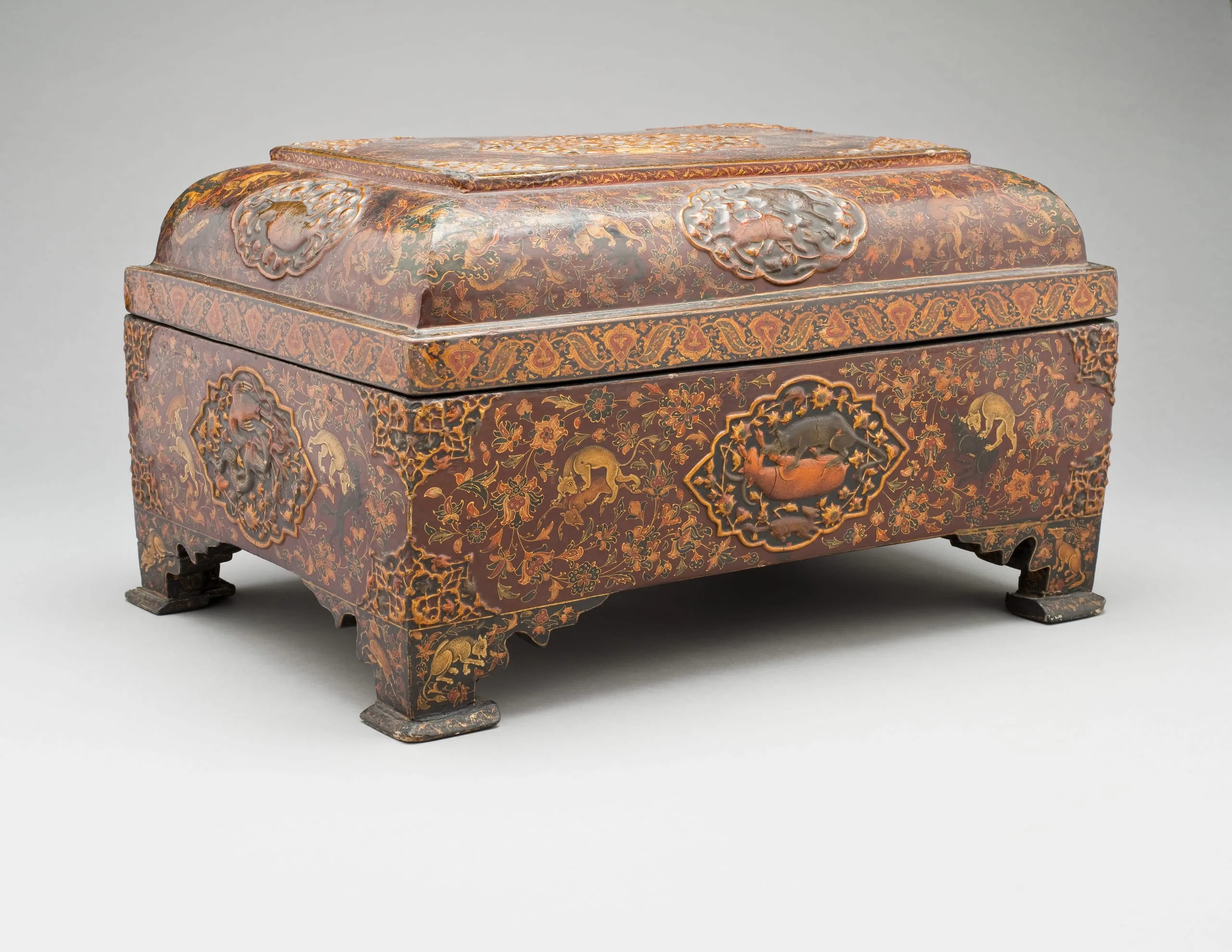 From the fifteenth century onward, lacquer objects—including bookbindings, pen cases and boxes such as this one—gained popularity in Iran, peaking in the nineteenth century. Constructed of papier-mâché and sometimes wood, lacquer objects were decorated with small-scale paintings of popular motifs like floral patterns, birds, and royal scenes before a varnish was applied that protected the painting and added a pleasing amber glow. This box is decorated with beautifully painted animal scenes that hark back to earlier Persian manuscript illustrations and the lid depicts Sagittarius, the centaur archer, aiming a bow at his tail, which ends in a dragon head.