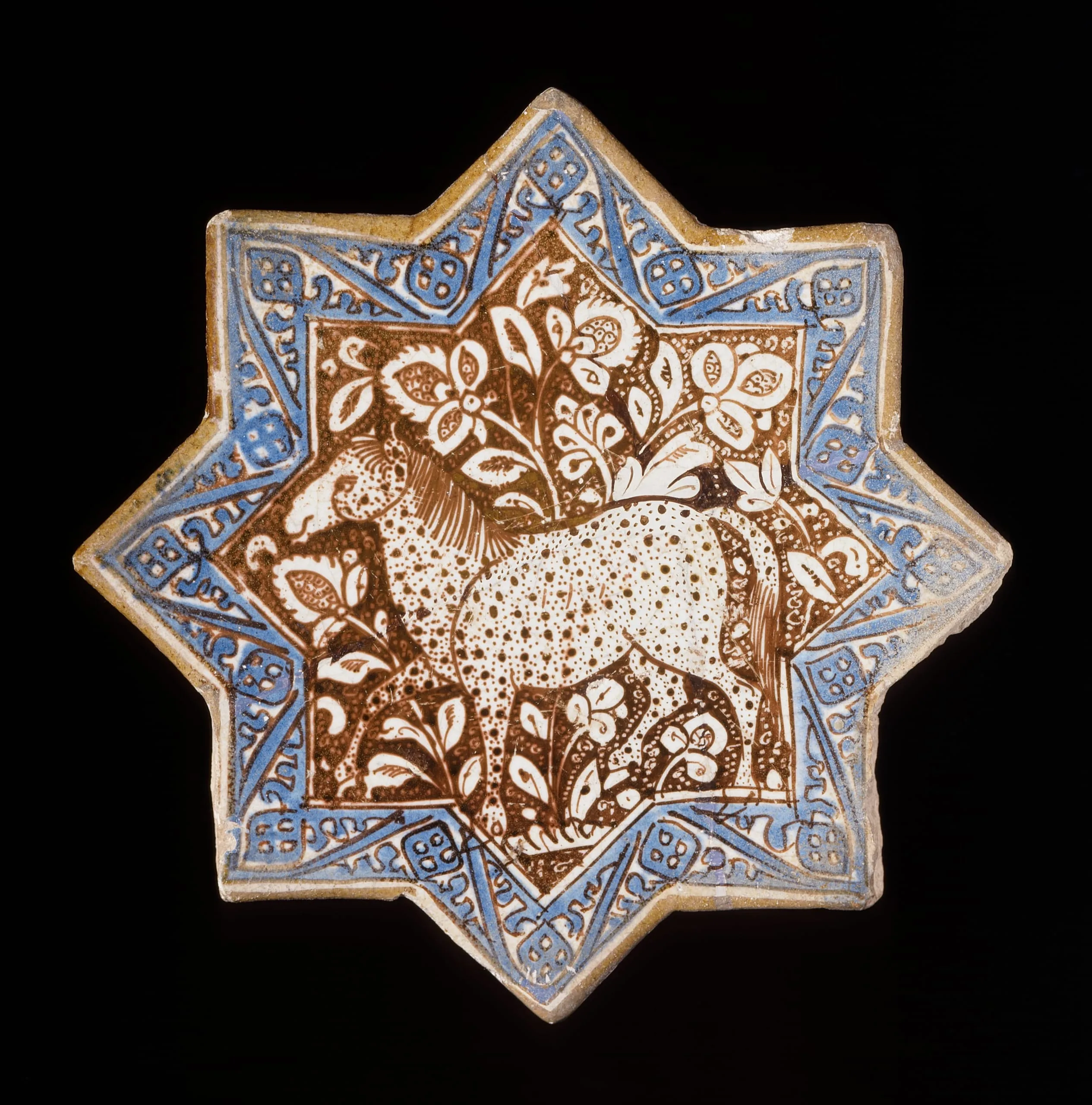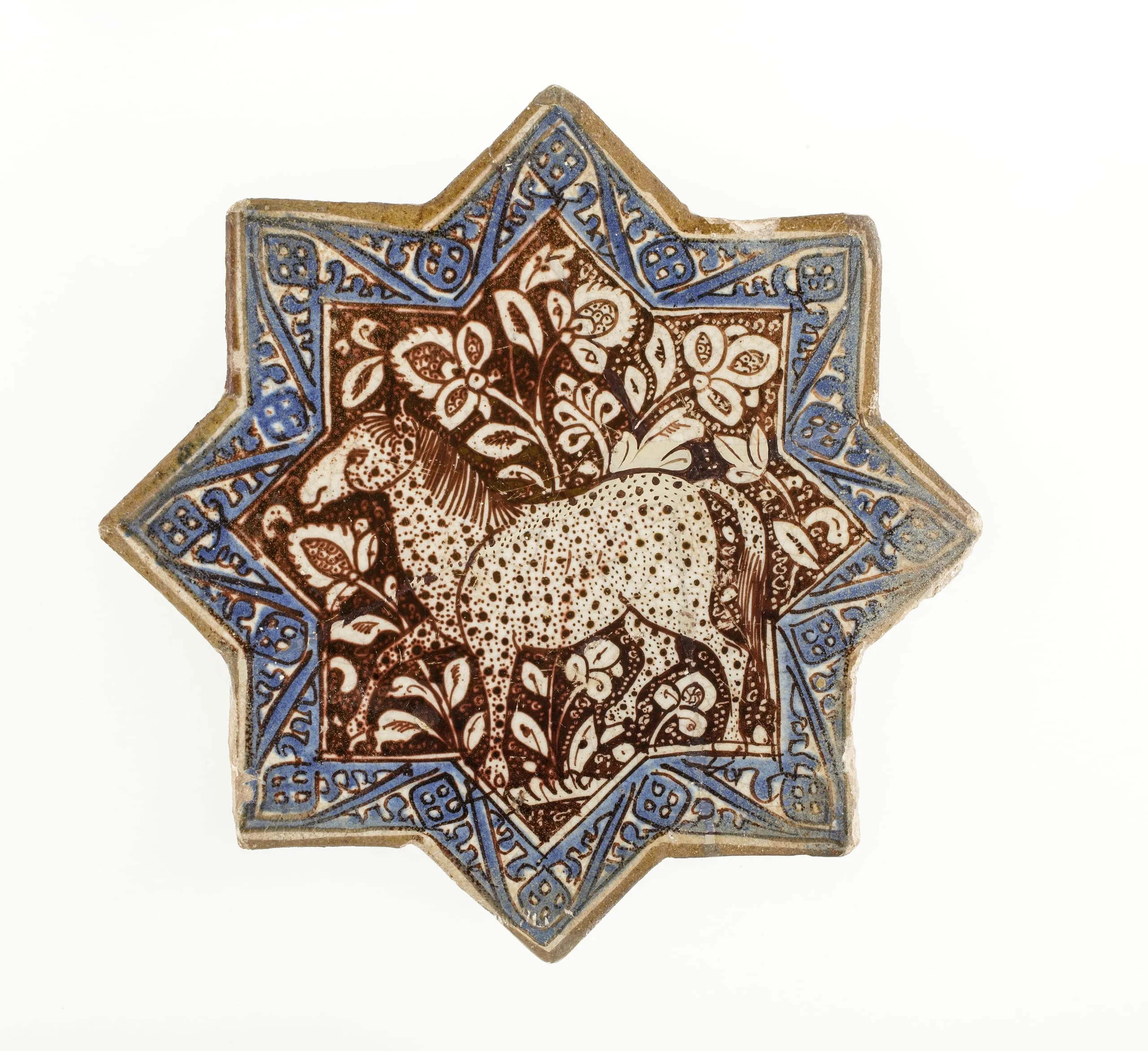 During the thirteenth and early fourteenth centuries, a chief duty of potters working in Kashan was to produce dazzling luster tile ensembles to cover the walls of newly constructed palaces and religious monuments. This star-shaped tile, depicting a horse cheerfully pausing in a landscape, may have originally formed part of one such assemblage, composed of dozens of interlocking pieces that featured various animal and human figures. The horse’s spots represent a convention of Kashan luster painting rather than an observation based on natural appearance.