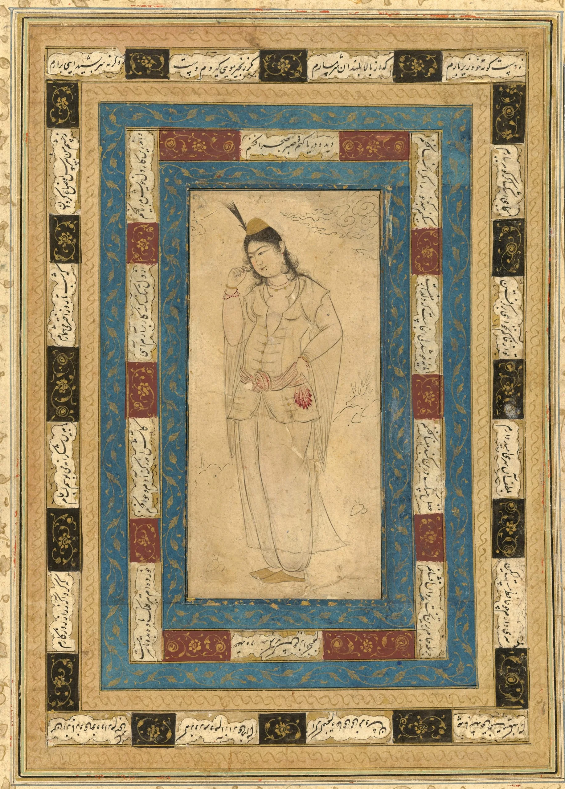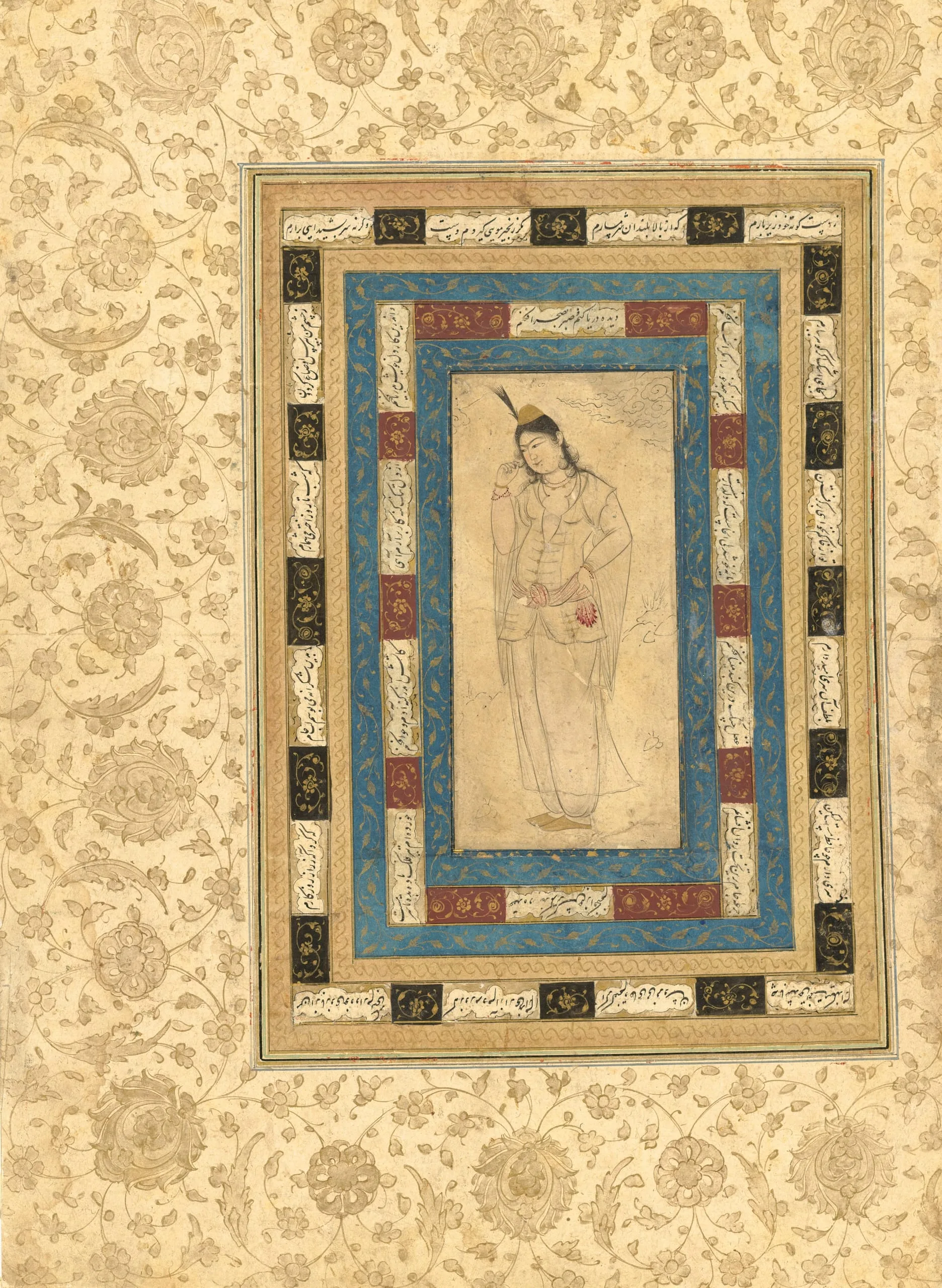 Among the most popular subjects of seventeenth-century Persian album paintings are handsome youths and lovely maidens (see M.73.5.458 and M.73.5.562). In many cases, these figural subjects are generic representations, but it is sometimes possible to identify them with greater precision, as may be the case with this tinted album drawing of a standing figure. Wearing Ottoman-style clothing and coquettishly twirling a lock of their hair, they possibly represent "the beautiful Turk," a conventional figure in Persian love poetry whose physical allure and fickleness cause heartache. The poetry in the surrounding frames is by Hafez.