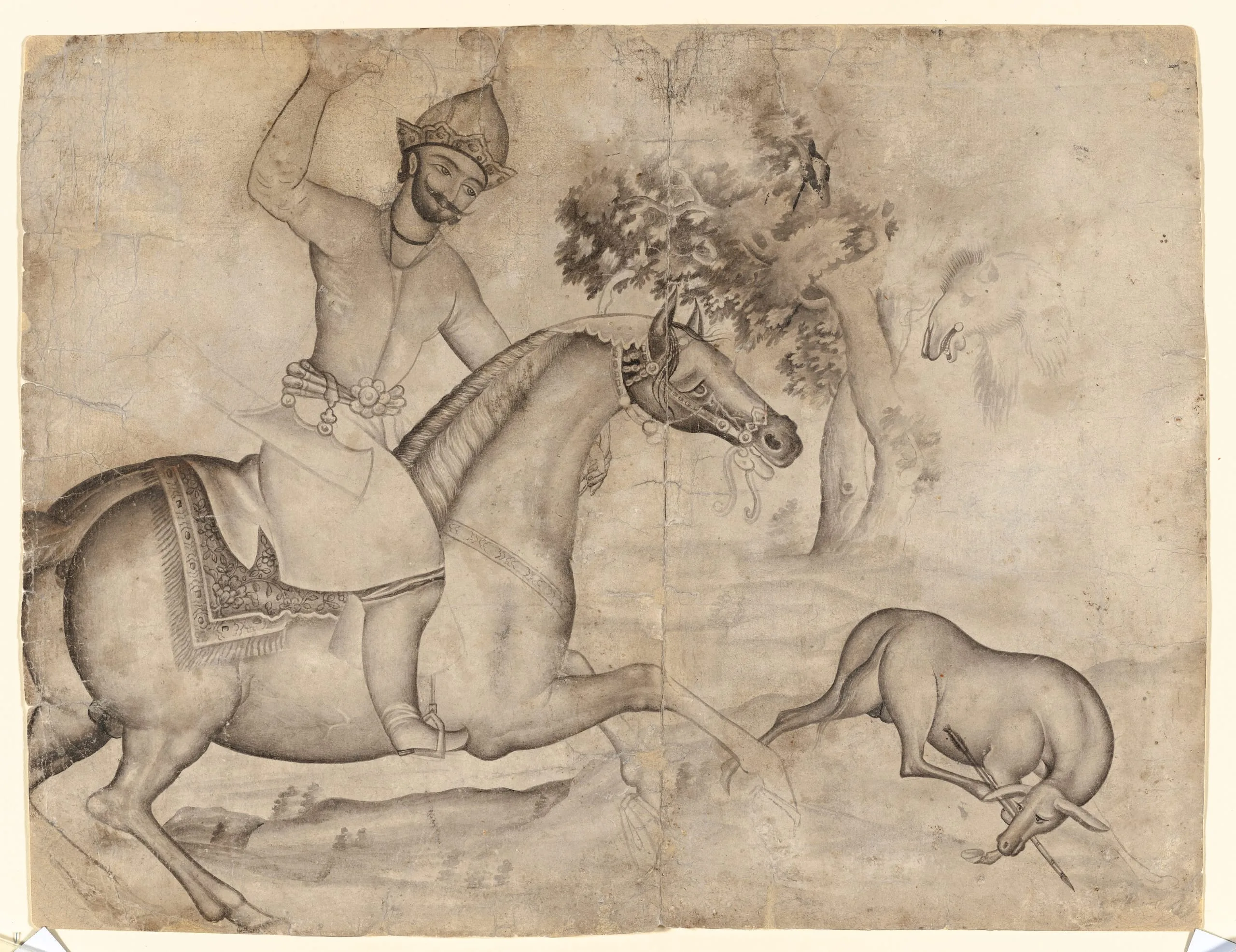 This drawing depicts a well-known story about Bahram Gur, a prince of Iran’s pre-Islamic Sasanian dynasty, best known from Firdawsi’s Shahnama (Book of Kings), the Iranian national epic completed in 1010, but also recounted in the later Haft Paykir (Seven Portraits) by Nizami. Challenged by his favorite concubine to demonstrate his skill as an archer, Bahram Gur performs a series of feats, including pinning the hoof of a gazelle to its own ear. Earlier manuscript illustrations of the same subject often portray Azada (Fitna in Nizami’s poem) as witnessing the prince’s display. In the present version, however, Azada is entirely absent, while the camel, probably her mount, is left unfinished suggesting that this grisaille (gray ink wash) version was made as a study, possibly for (or after) a larger mural or oil painting.