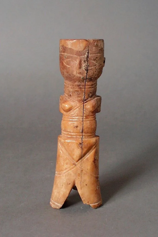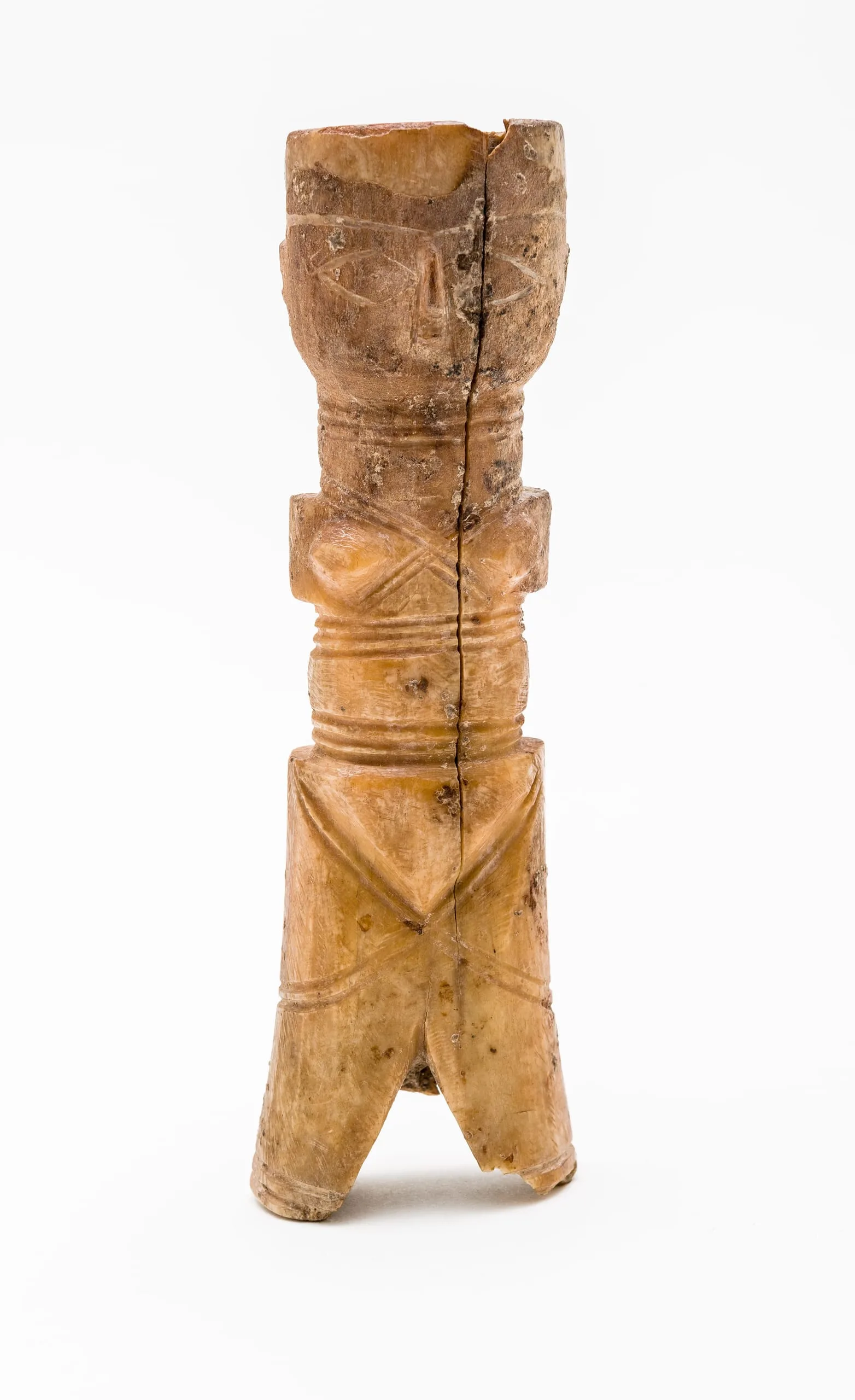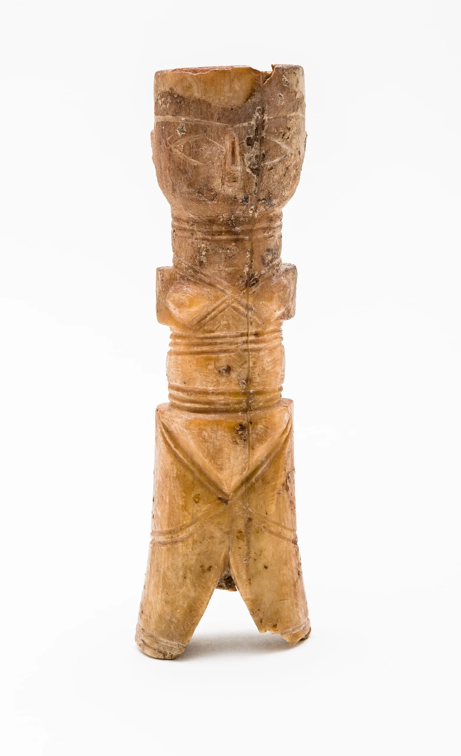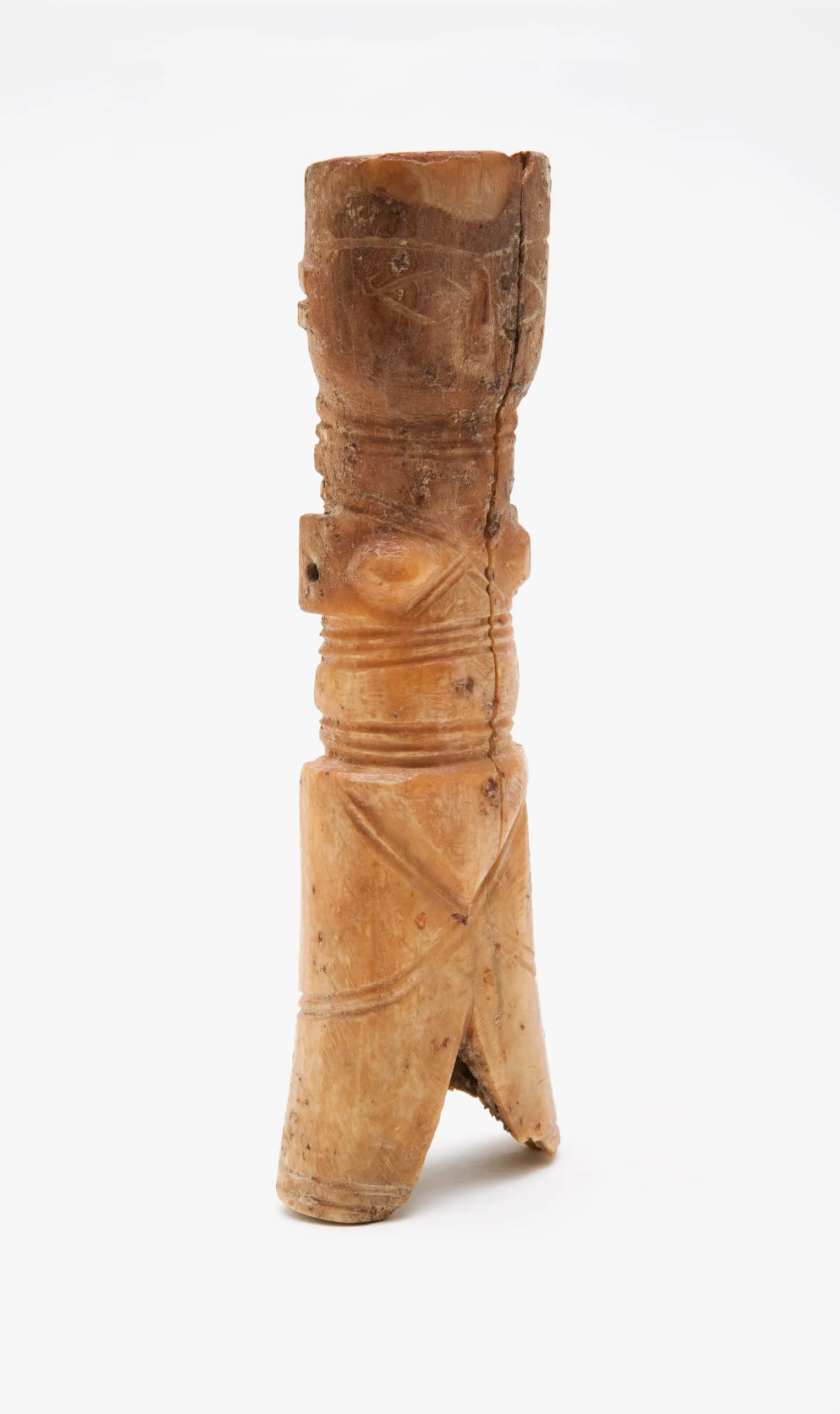 Small bone figurines of this type have been found in large numbers in archaeological excavations in Egypt and were likely mass-produced for Late Byzantine markets, a practice that continued after the Muslim conquests. While some scholars believe they are fertility symbols, their discovery in children’s burials suggests that they were used as toys. This female statuette has holes at the shoulders where moveable arms were once attached, enlivening the tiny figure.