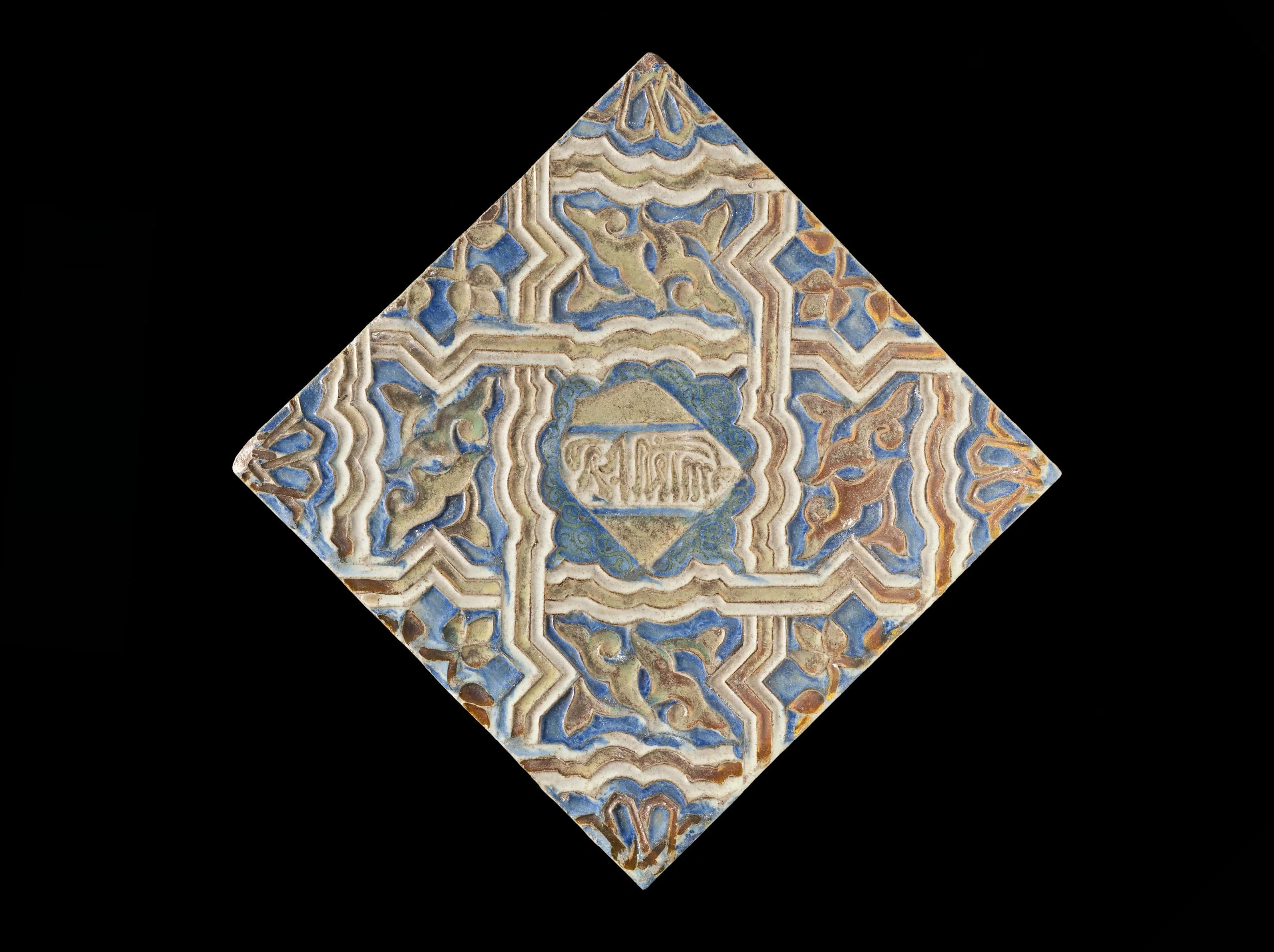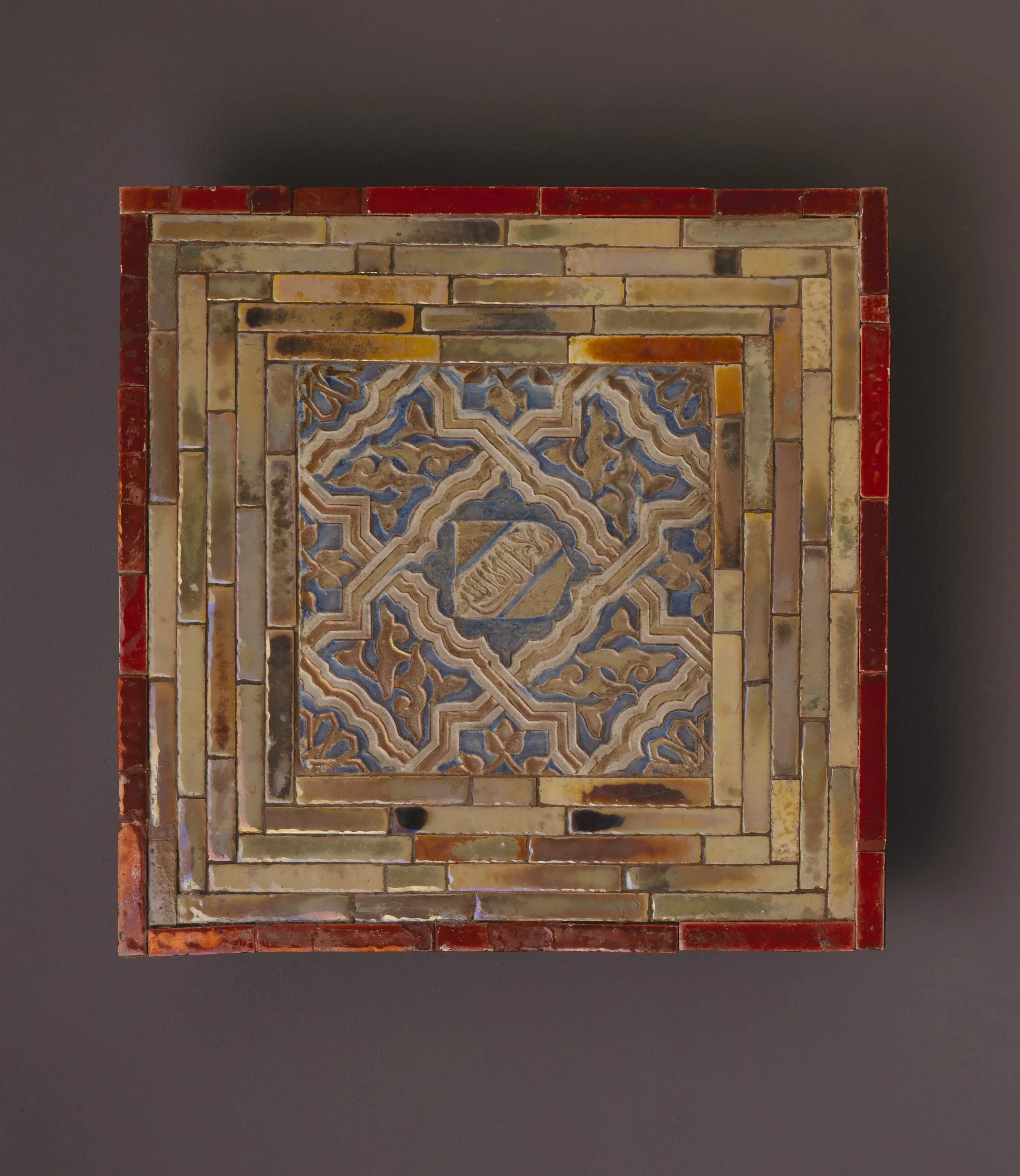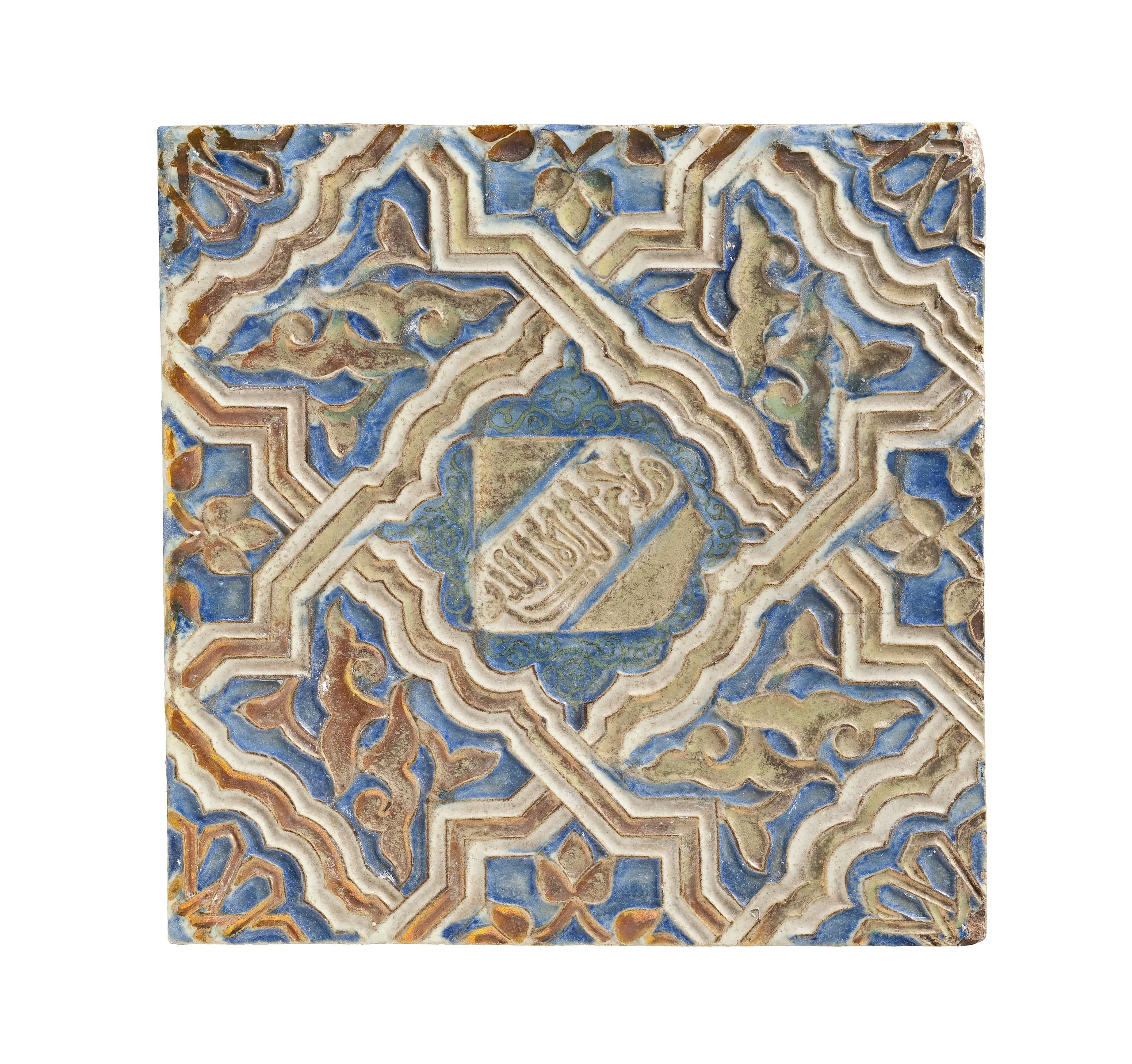 The Alhambra is the most significant artistic achievement of the Nasrids, the last Islamic dynasty in Spain. Both a well-fortified palace and a royal city, the Alhambra was guarded by stone walls and towers on the exterior, which conceal on the interior an elaborate succession of gardens, courtyards, and intricately decorated rooms, some of which had veneers of carved and painted stucco and colorful tiles. This earthenware tile is inscribed with the Nasrids’ dynastic motto: "There is no conqueror but God" (for the same inscription on a stucco plaque, see M.2002.1.685,).