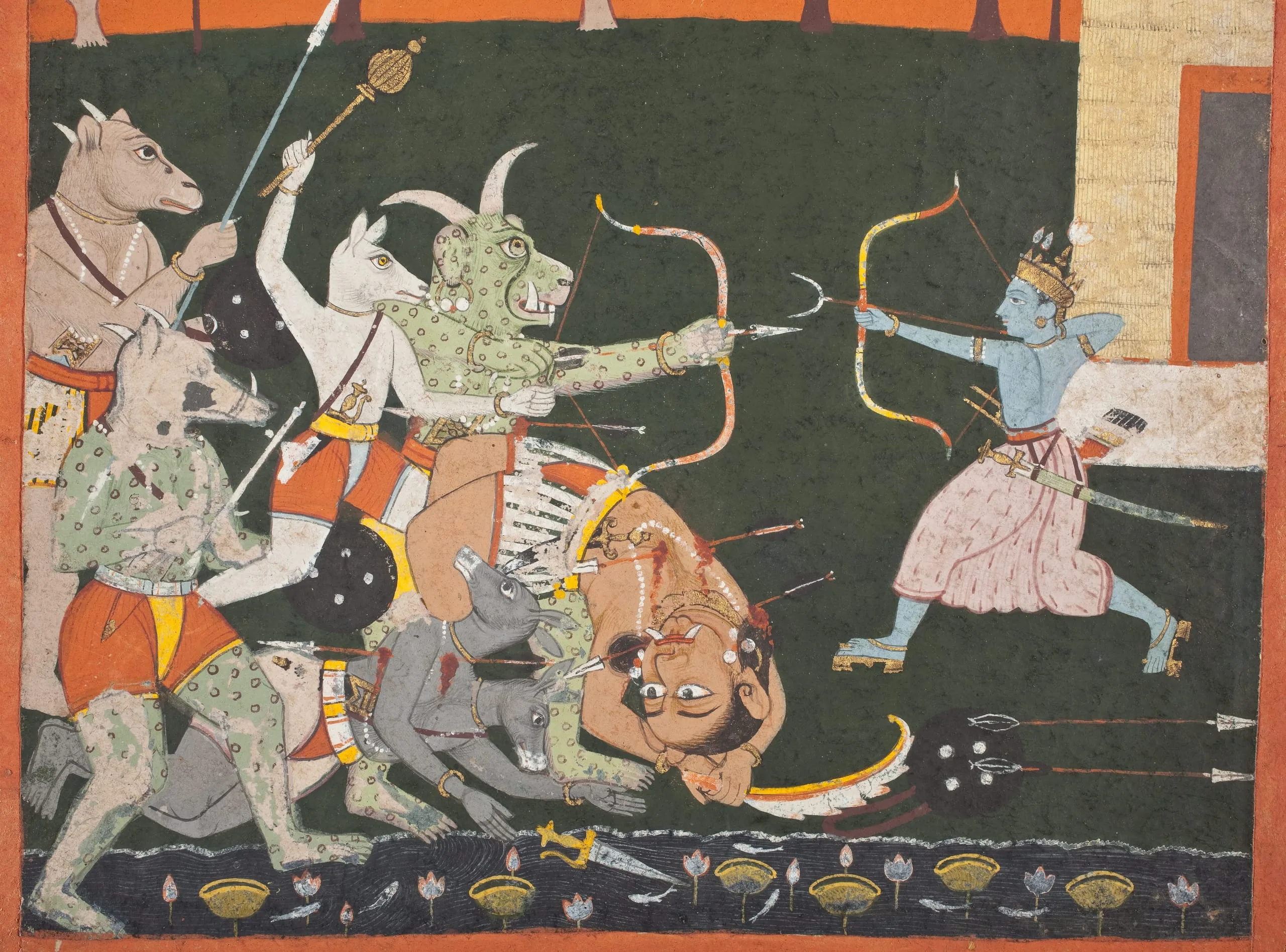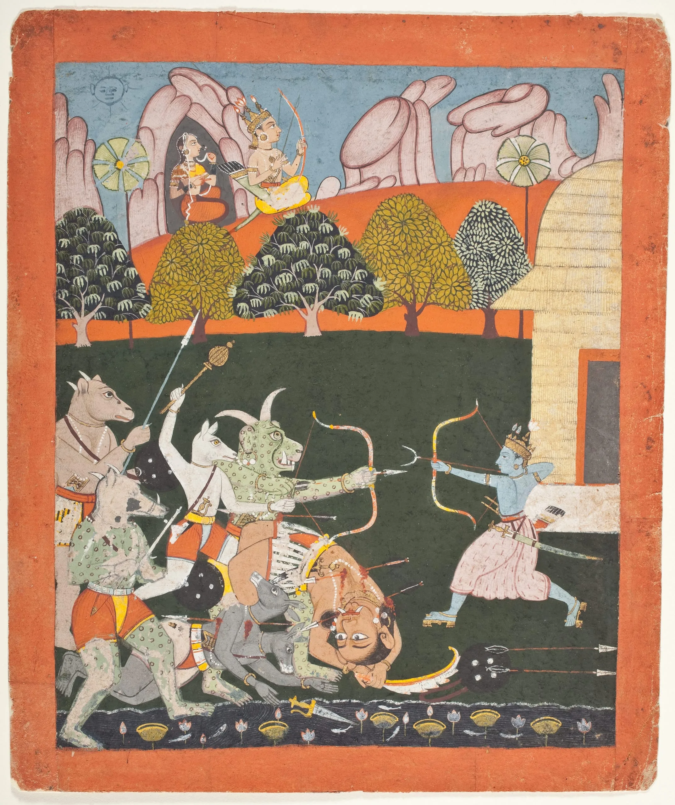 This illustration is from Book 3 (Aranya kanda) when Rama, Sita, and Lakshmana took refuge in the Panchavati Forest. After Lakshmana cuts off the nose and ears of the ogress Shurpanakha for insulting Rama and attacking Sita, Shurpanakha fled and complained to her brother Khara, who returned and attacked Rama with his army of 14,000 demon warriors. Here, Rama kills the fiendish horde. In the upper register, Lakshmana guards Sita sheltered within a cave. (Ramayana 3:18-19).