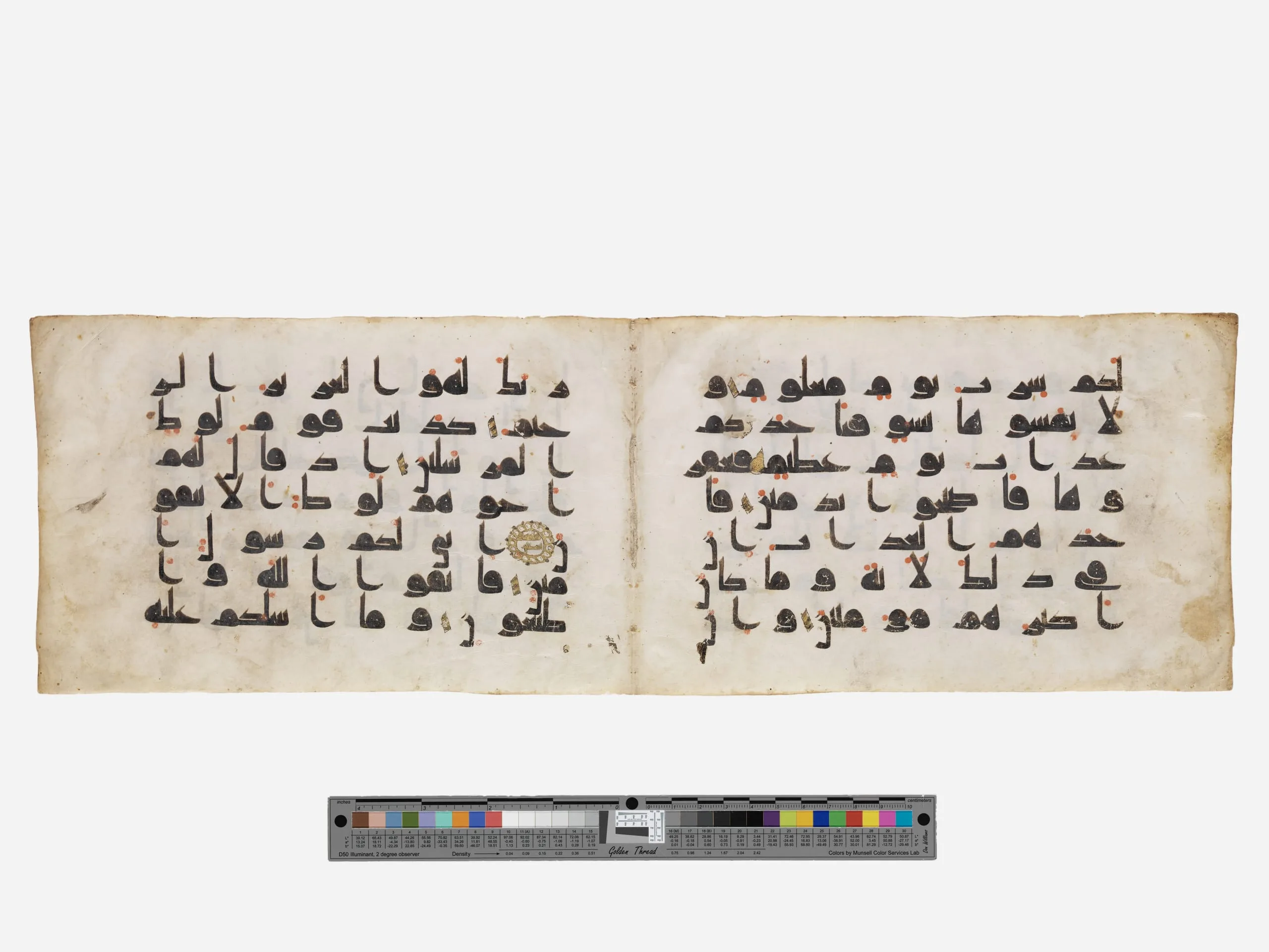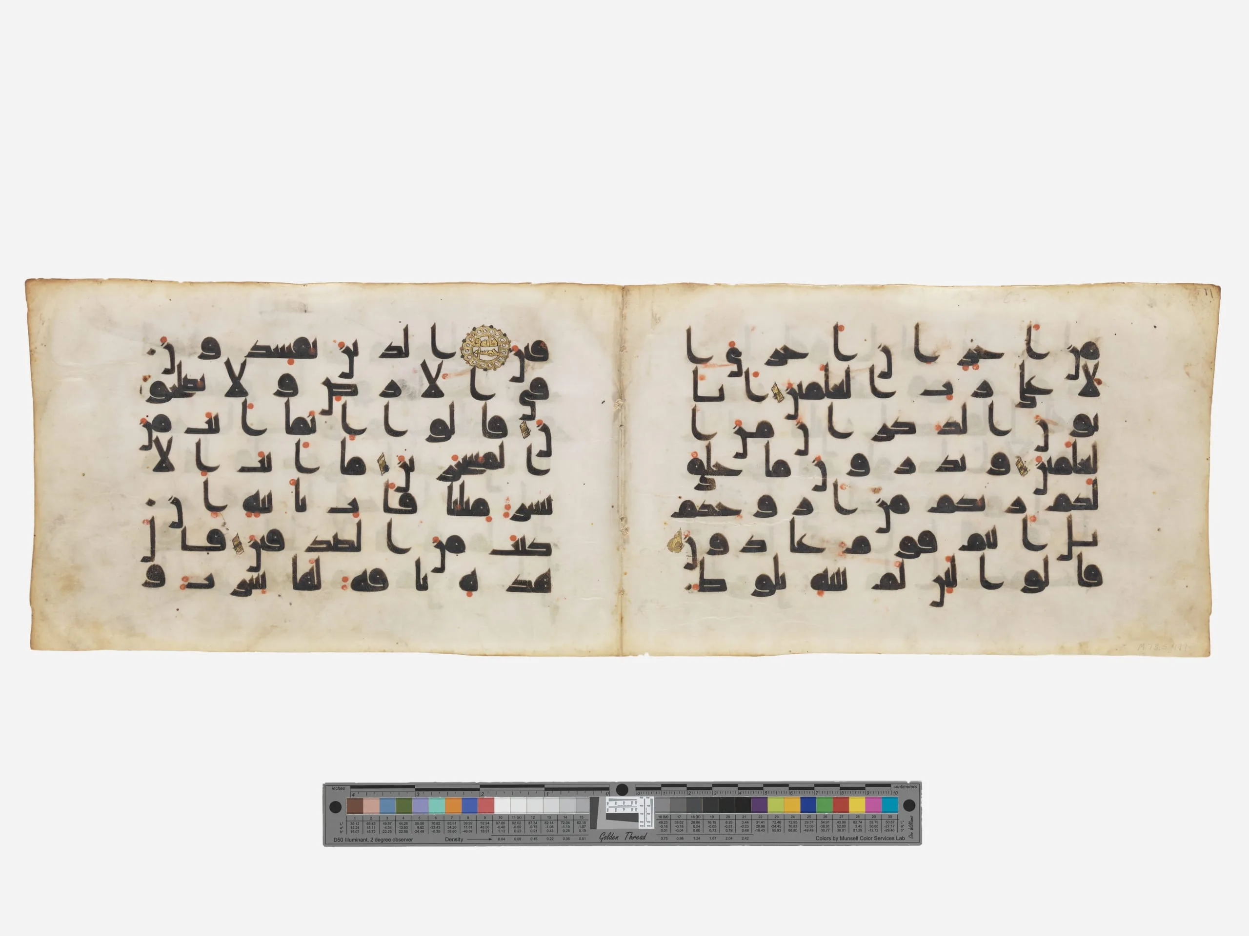 By the late eighth century, manuscripts of the Qur’an had achieved a standard format rendered in parchment, made from cured and scraped animal skin, generally sheep, and configured and bound as a codex or book. These two pages are from an illuminated Qur’an dating to the ‘Abbasid period. Copied in rectilinear Kufic script, each folio has seven lines of text written in dark brown ink, with the short vowels indicated by red dots. Such early Qur’anic manuscripts were challenging to read due to the lack of the dots or letter pointing that, from the eleventh century onward, were used to distinguish one consonant from another.