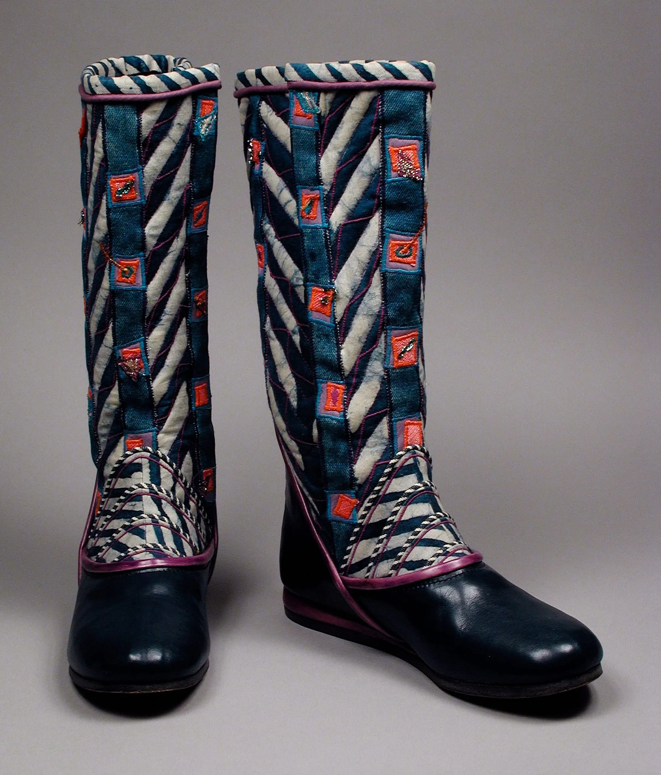 - Cotton twill, wax-resist-dyed, quilted, with cotton plain weave, silk satin, silk and lurex plain weave appliqué, and leather