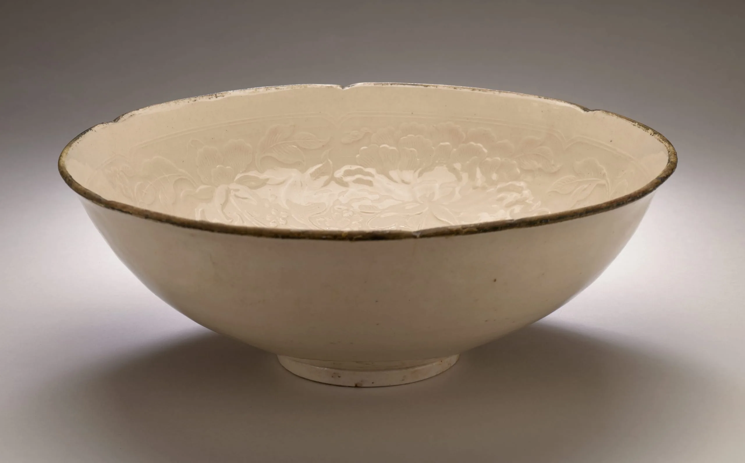 - Ding ware, wheel-thrown stoneware with impressed decoration, transparent glaze, and banded metal rim