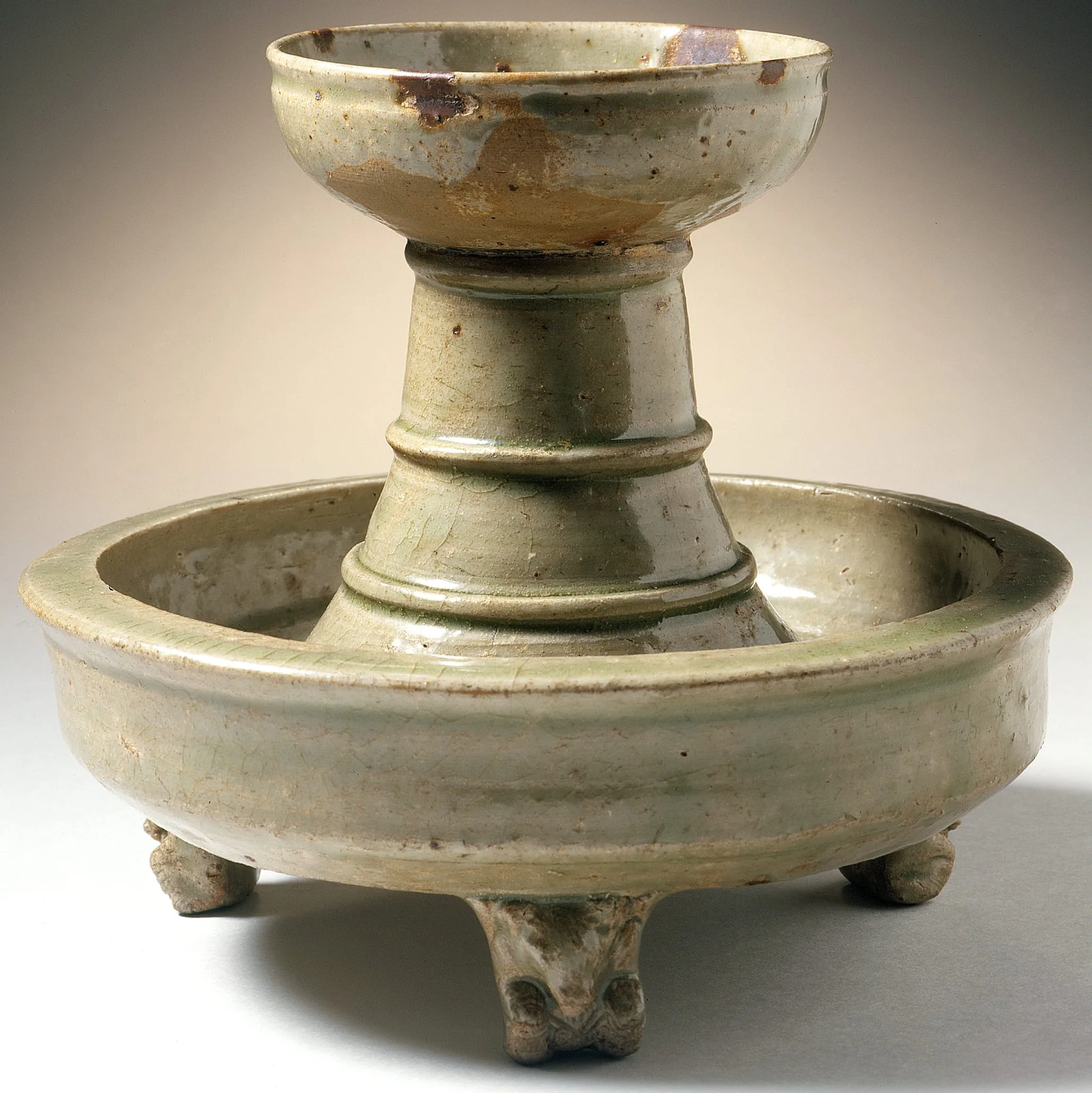 - Yue ware, wheel-thrown stoneware with molded and applied decoration and green glaze with brown spots