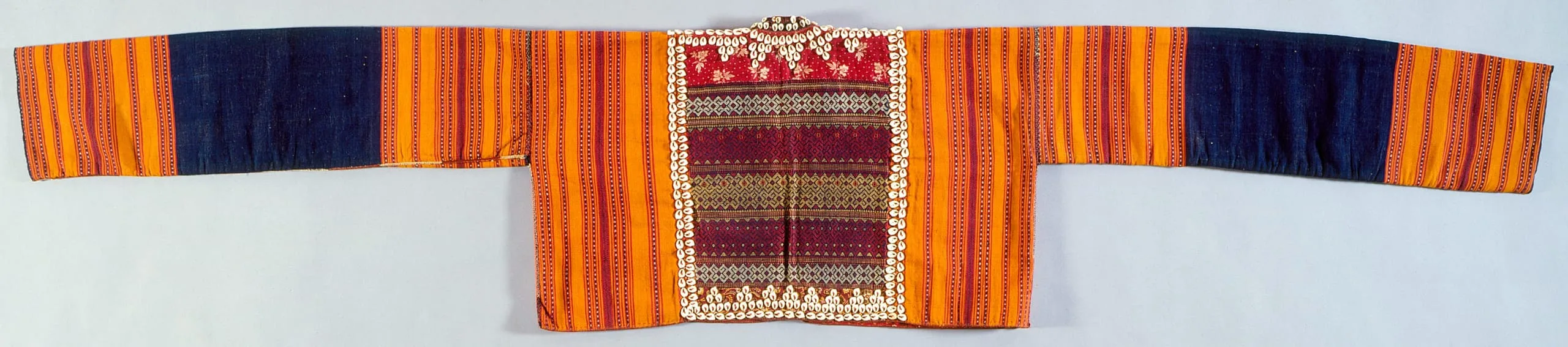 - Cotton plain weave with metallic thread supplementary weft patterning, cotton appliqué, sequins, shells and mica