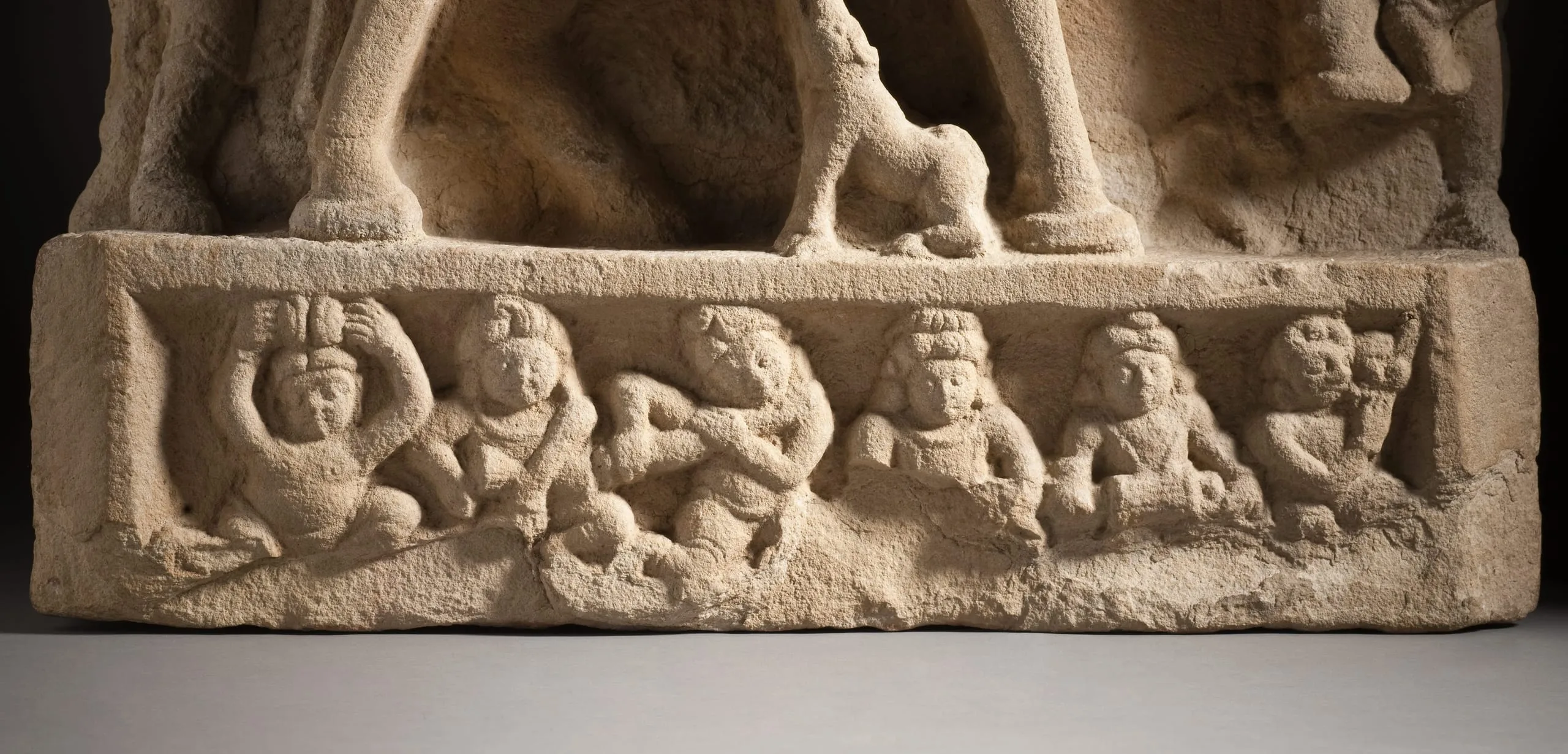 Revanta (Brilliant) is the youngest son of the Hindu Sun God, Surya, and his wife Sañjña (or Saranya). He is the chief of the Guhyakas (Hidden Ones), nature spirits who dwell in mountain caves and protect forest travelers. Revanta is worshiped as a patron deity of horse traders and is represented as a hunter on horseback returning from a successful hunt. Perhaps due to Iranian cultural influence, and in accordance with his father’s attire in northern Indian representations, he wears boots, trousers, and a tunic. His hair is styled like a Phrygian cap and he wears a bejeweled diadem. He carries a drinking cup in his right hand and holds the horse’s reins in his left. He is accompanied by five Guhyaka attendants with similar hairstyles. The attendant behind him carries an honorific parasol (chattra) over Revanta’s head. An attendant behind the horse’s head holds a flask to refill his master’s drinking cup. The attendant in the upper left corner carries a slain boar captured in the hunt. The hunting dog licks his master’s boot in a charming genre embellishment. Beneath the hunting procession is a frieze of dancing musicians celebrating the good fortune of the hunt. See also M.86.61.1.