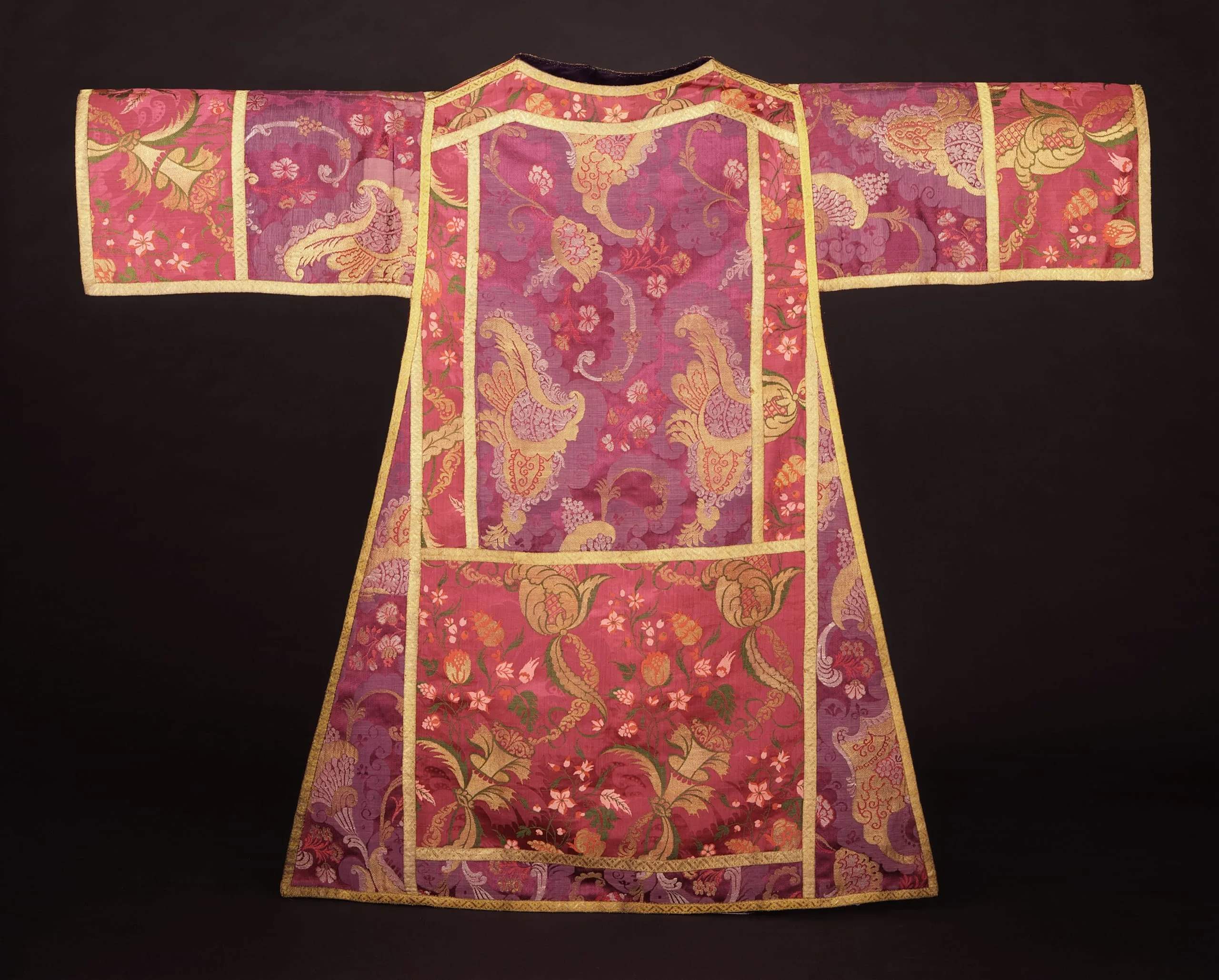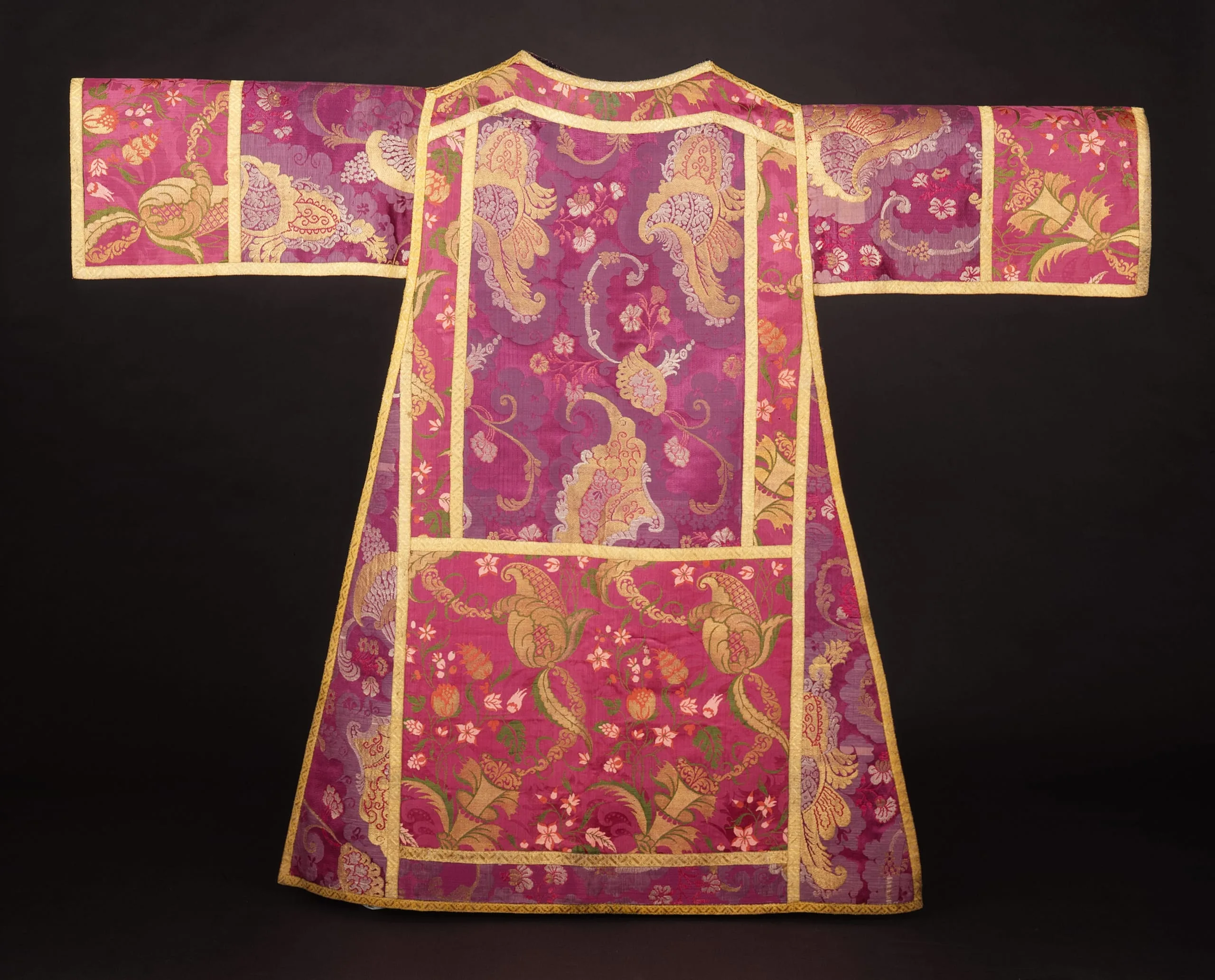 - Silk damask with silk and metallic- thread supplementary weft patterning bound in twill (lampas) with metallic braid
