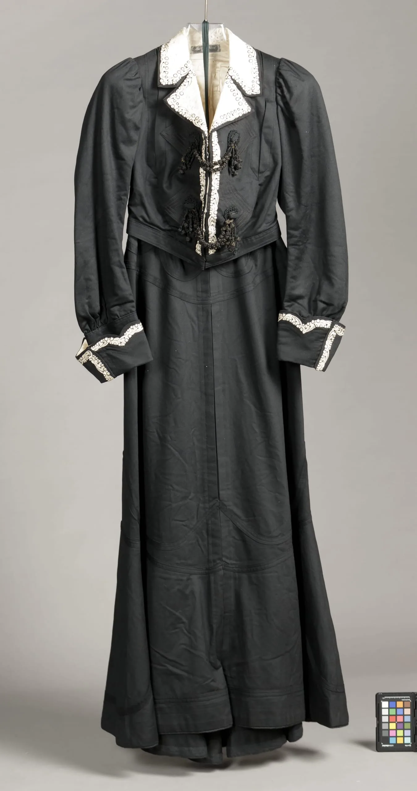 - Bodice: wool plain weave (broadcloth), silk satin with silk embroidery, and silk bead tassels; Skirt: wool plain weave (broadcloth)
