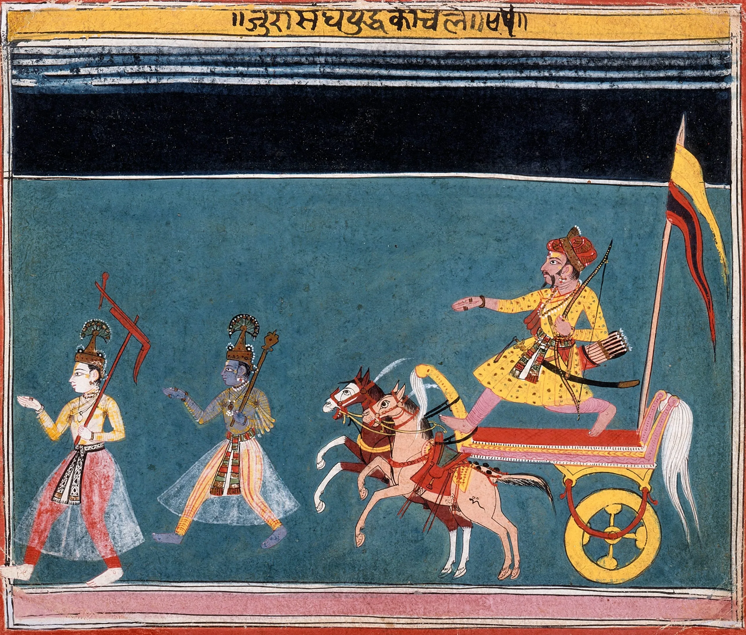 The devanagari inscription in the header reads, “going to fight Jurasandha [Jarasandha].” Jarasandha was a king of Magadha (ancient Bihar) who vowed to kill Krishna after Krishna had slayed the evil King Kamsa of Mathura, who was Jarasandha’s son-in-law. After Krishna challenged Jarasandha to a duel, the king chose instead to fight Bhima, one of the Pandava brothers whose exploits are recounted in the Mahabharata ([War of the] Great Bharatas). Jarasandha was then killed by Bhima in a wrestling match (Bhagavata Purana 10:72). Here, the white-skinned Balarama holding plowshare and the blue-skinned Krishna carrying a mace lead a chariot ridden by the mighty Bhima.