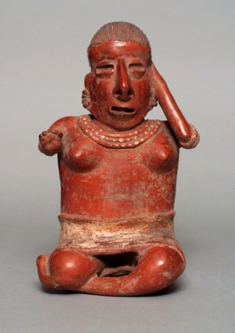 Terracotta ceramic figure of a seated human with crossed legs, raised right arm, open mouth, and white-dot necklace, covered in red slip with worn surface