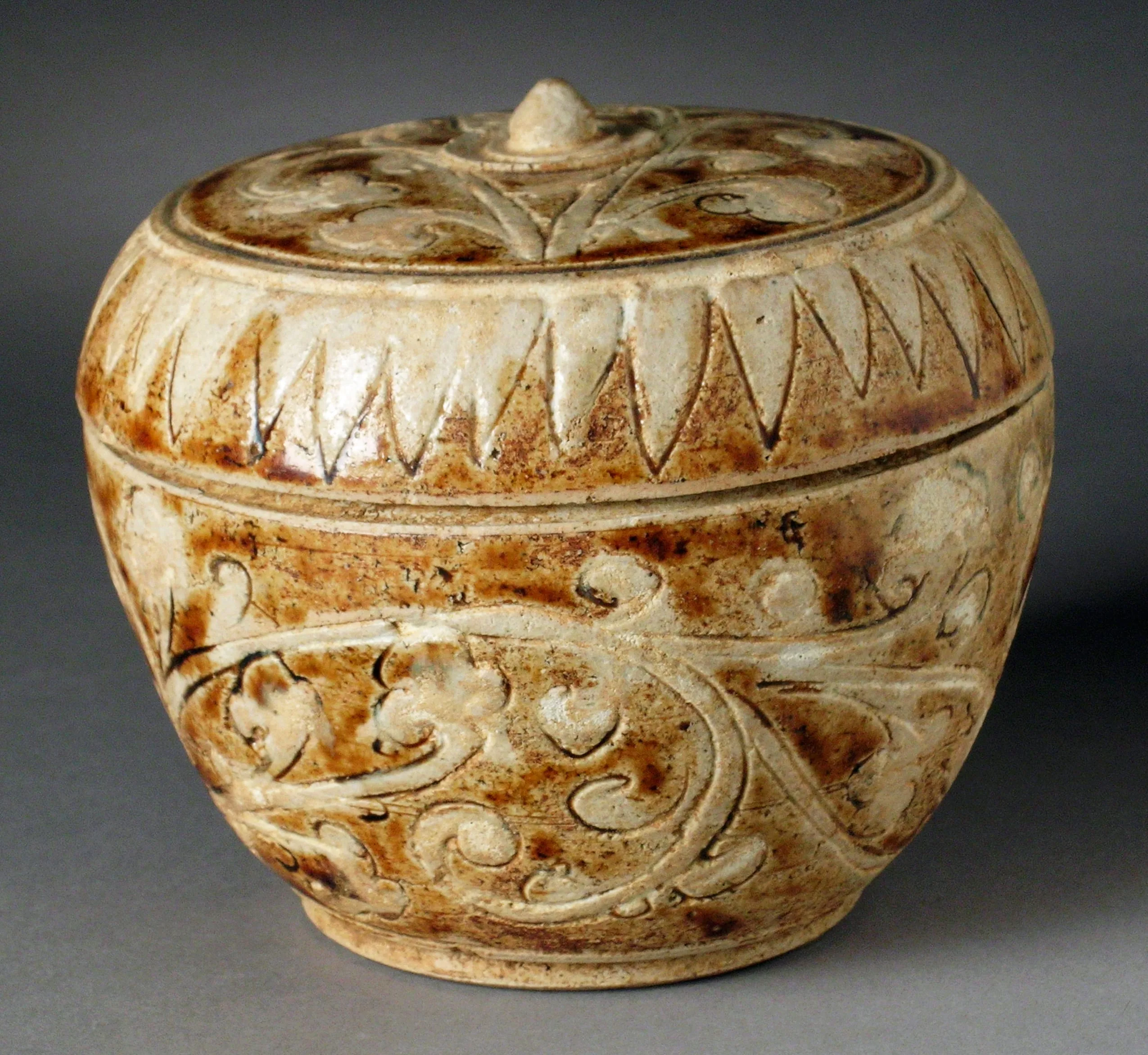 - Wheel-thrown stoneware with incised decoration and brown and cream glaze