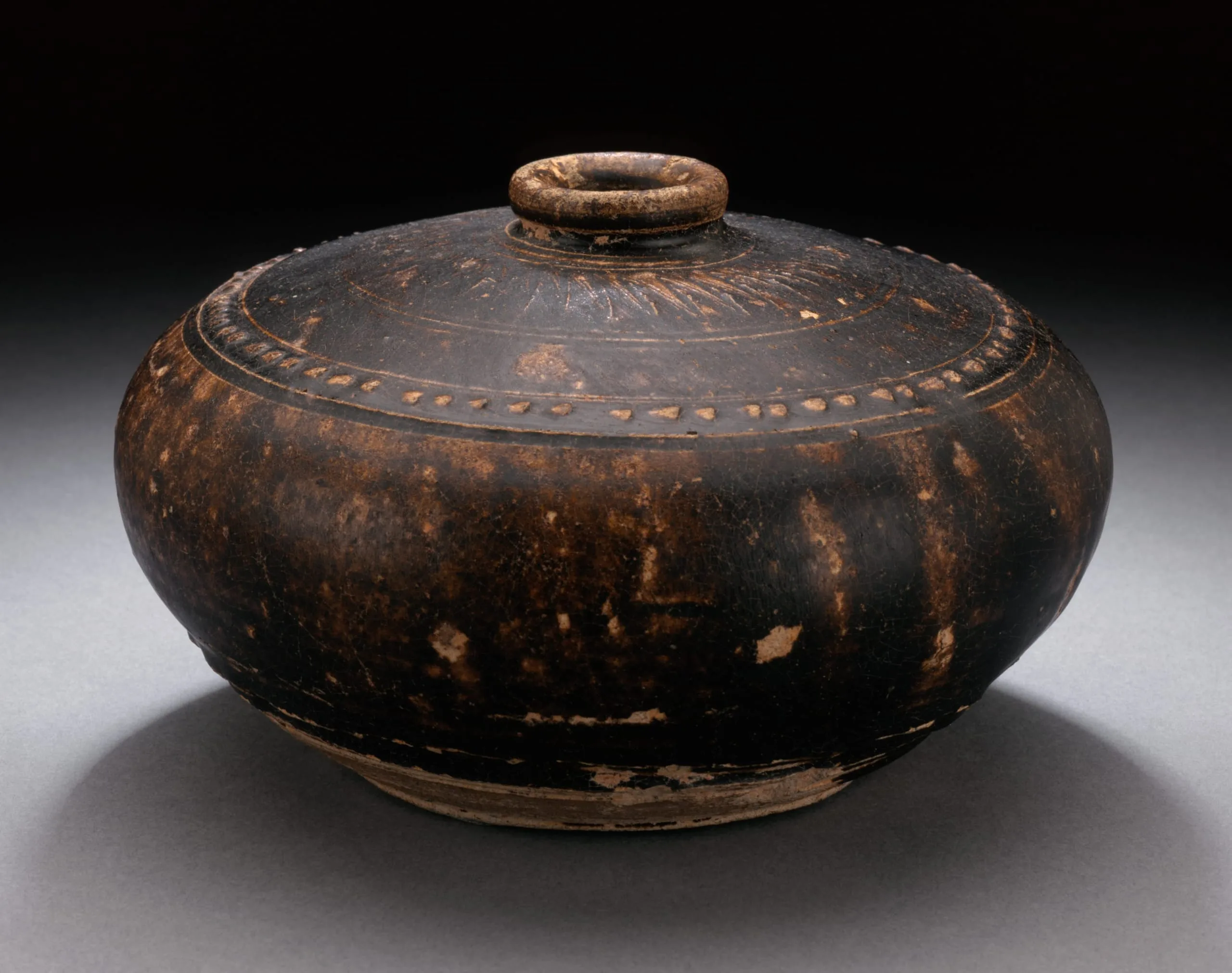 - Wheel-thrown stoneware with applied and incised decoration and brown glaze