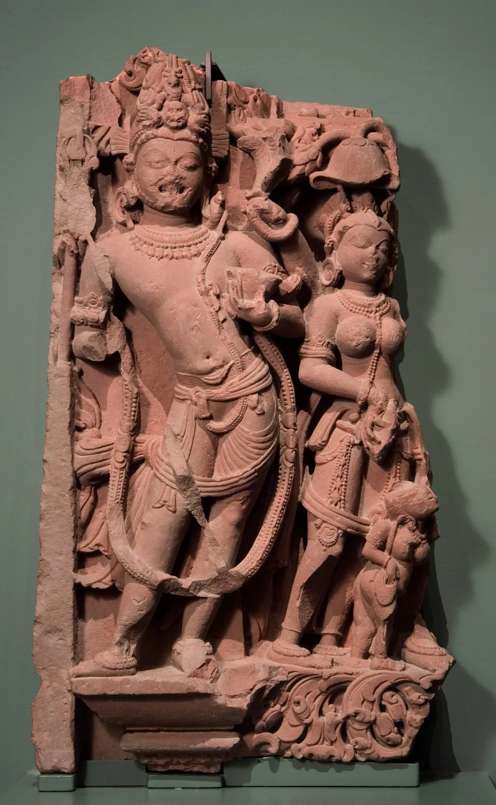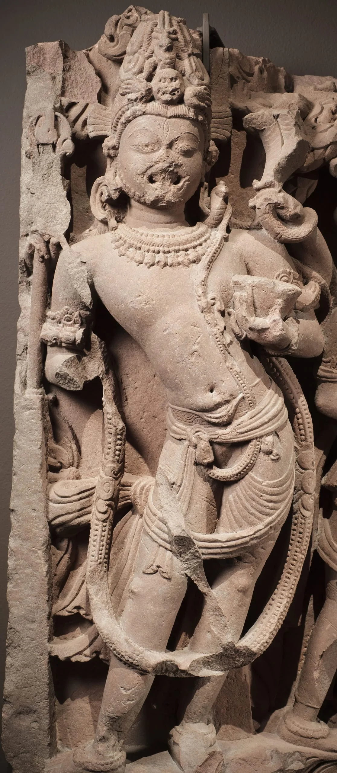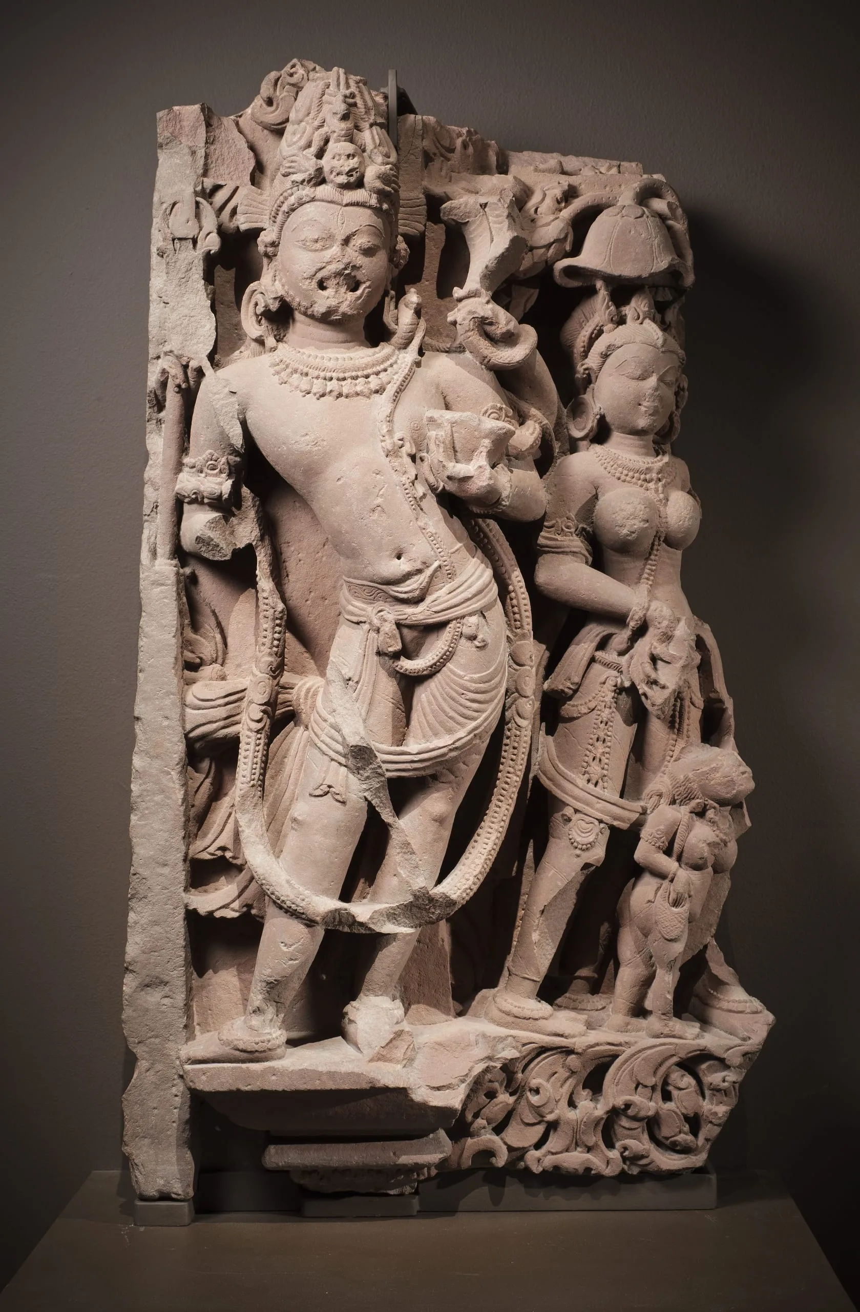 This river goddess panel is partially damaged. The sculpture of Ganga on the right end of the relief is now missing except for a fragment of her right foot and the tail end of her mythical aquatic creature (makara) mount that extends beneath her attendants. (For a complete representation of this subject, see M.79.9.10.1.) On the left end, a fierce Shaiva door guardian (dvarapala) stands in a pronounced swaying posture. He has Shiva’s ascetic hairstyle (jata mukuta) with a skull and cobra, his third eye of wisdom (jñana netra), roaring mouth, fangs, and is bearded. He wears the Brahmanical sacred thread (yajnopavita) over his left shoulder, a long garland (vana mala), and an elegantly tied dhoti. He has four arms. In his upper right hand, he carries a now-damaged trident (trishula). In his upper left hand, he carries a now-damaged multi-headed cobra. He holds a skull cup (kapala) in his lower left hand. His lower right hand is now missing. He may represent Shiva in the form of Mahakala, who functioned as one of the eight guardians of Shiva temples. Beside him are two attendants in the river goddess’s retinue: a full-breasted female wearing exquisite jewelry, and a female dwarf looking up at her now-missing mistress and holding a cosmetic bag. This sculpture may have originally been on the same temple as M.74.5.6 and M.77.19.27. A sculpture of Shiva’s Family from the same temple is in the National Museum of Korea (formerly LACMA M.73.4.12).