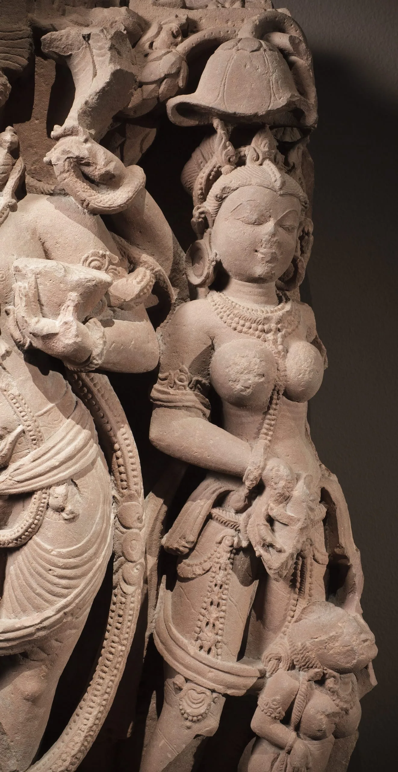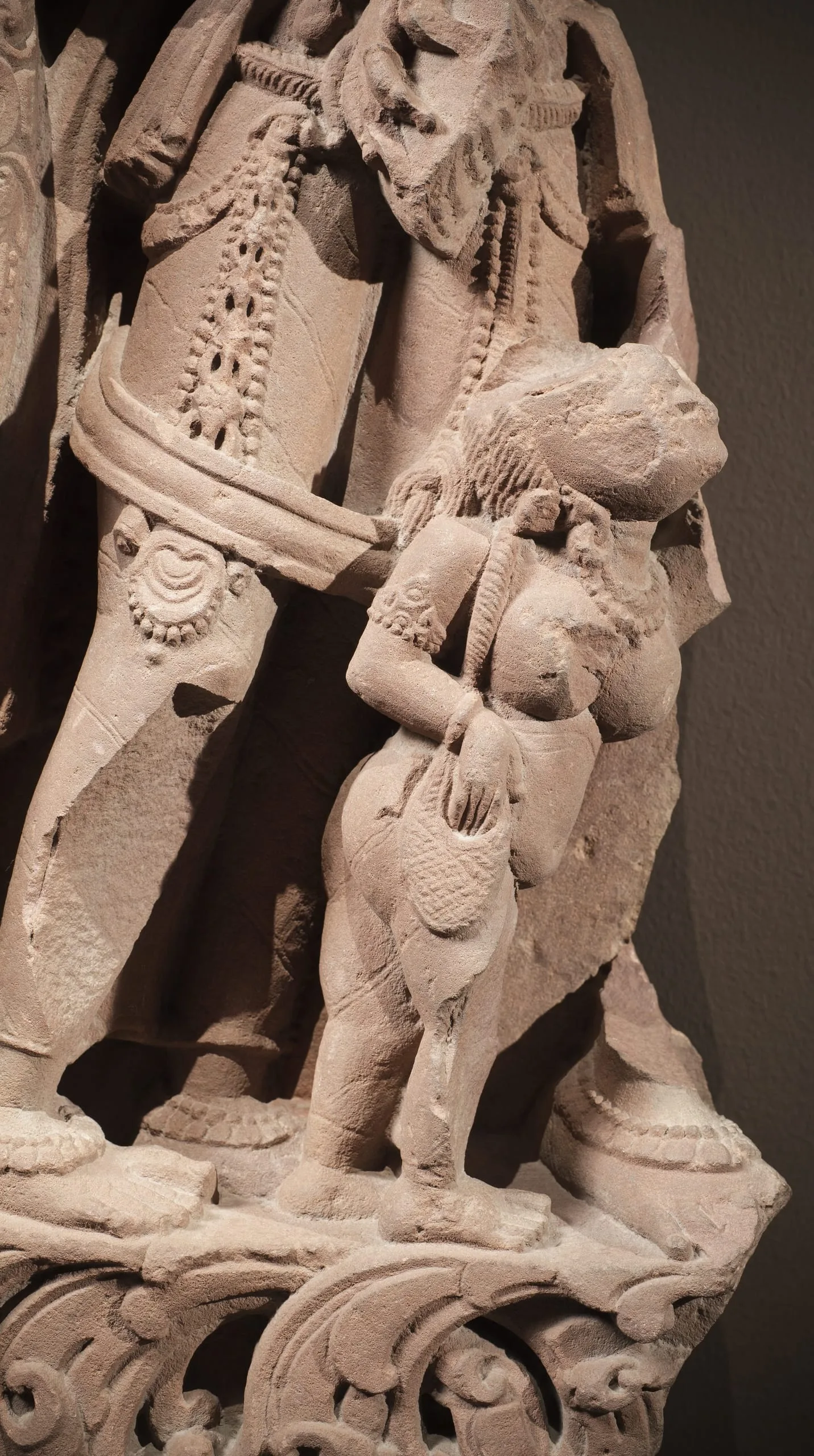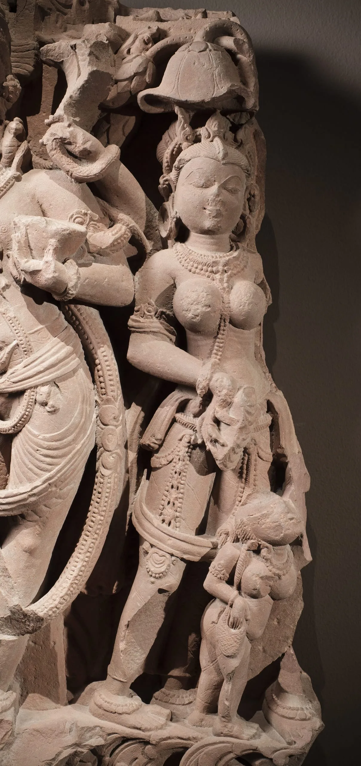 This river goddess panel is partially damaged. The sculpture of Ganga on the right end of the relief is now missing except for a fragment of her right foot and the tail end of her mythical aquatic creature (makara) mount that extends beneath her attendants. (For a complete representation of this subject, see M.79.9.10.1.) On the left end, a fierce Shaiva door guardian (dvarapala) stands in a pronounced swaying posture. He has Shiva’s ascetic hairstyle (jata mukuta) with a skull and cobra, his third eye of wisdom (jñana netra), roaring mouth, fangs, and is bearded. He wears the Brahmanical sacred thread (yajnopavita) over his left shoulder, a long garland (vana mala), and an elegantly tied dhoti. He has four arms. In his upper right hand, he carries a now-damaged trident (trishula). In his upper left hand, he carries a now-damaged multi-headed cobra. He holds a skull cup (kapala) in his lower left hand. His lower right hand is now missing. He may represent Shiva in the form of Mahakala, who functioned as one of the eight guardians of Shiva temples. Beside him are two attendants in the river goddess’s retinue: a full-breasted female wearing exquisite jewelry, and a female dwarf looking up at her now-missing mistress and holding a cosmetic bag. This sculpture may have originally been on the same temple as M.74.5.6 and M.77.19.27. A sculpture of Shiva’s Family from the same temple is in the National Museum of Korea (formerly LACMA M.73.4.12).