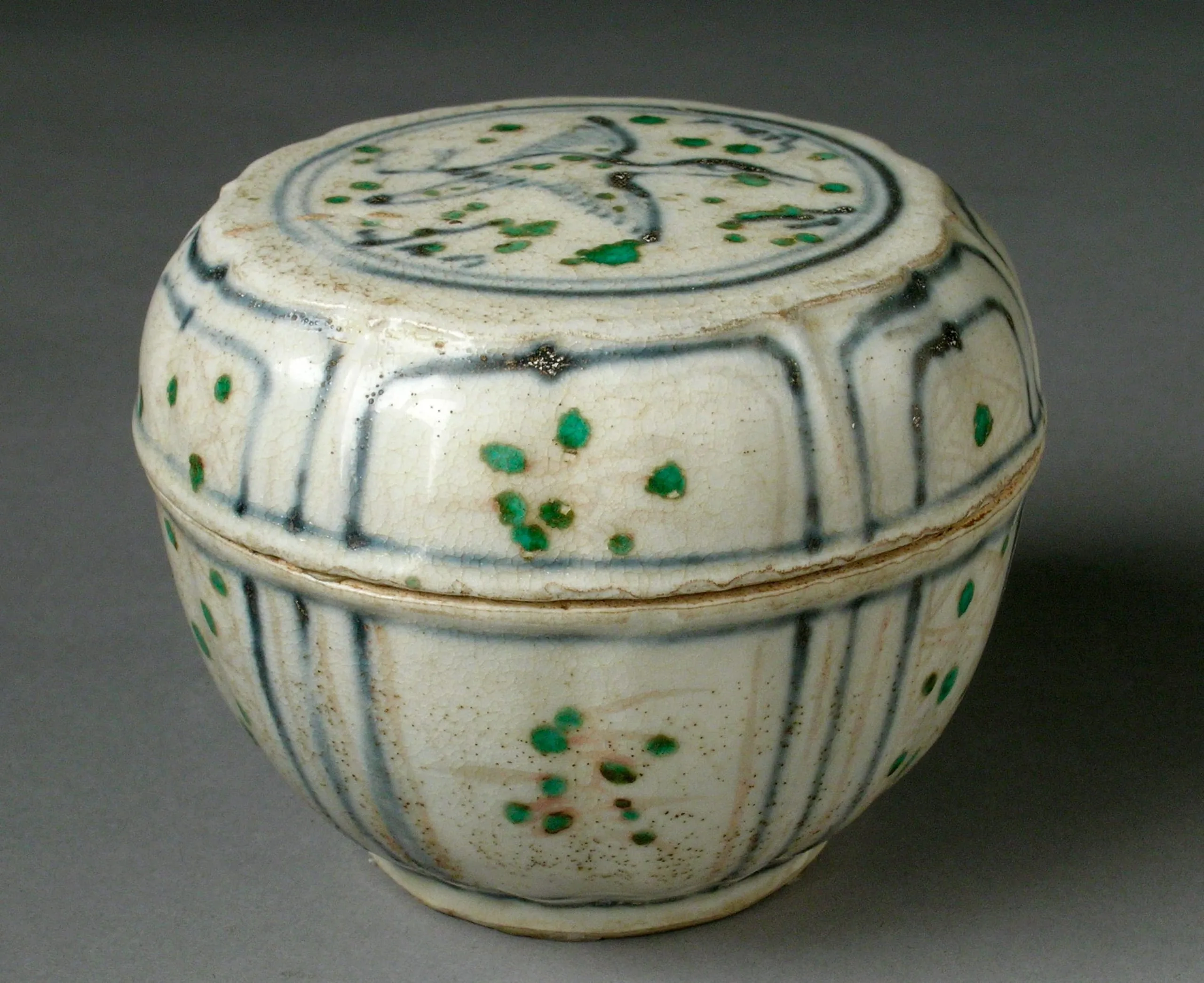 - Wheel-thrown stoneware with cream slip, incised and underglaze blue painted decoration, clear glaze and overglaze green and red enamel decoration