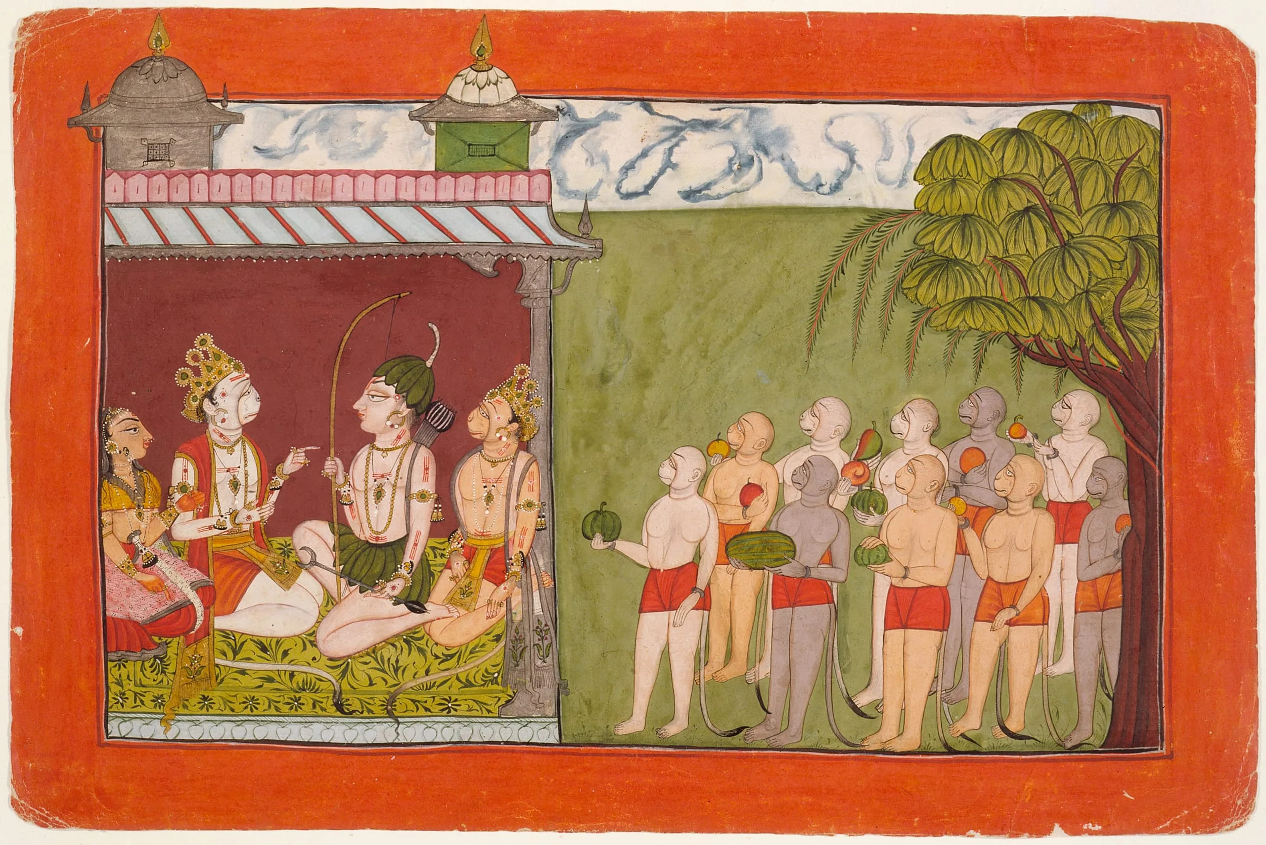 This illustration is from Book 4 (Kishkindha kanda). On the left, Lakshmana and Hanuman meet with Sugriva and Tara in Sugriva’s palace in Kishkindha (Ramayana 4:33-35). On the right, the monkeys summoned by Sugriva to aid Rama arrive at Sugriva’s palace bearing fruits in his honor that they gathered from the Himalayan mountains (Ramayana 4:36:27-37).