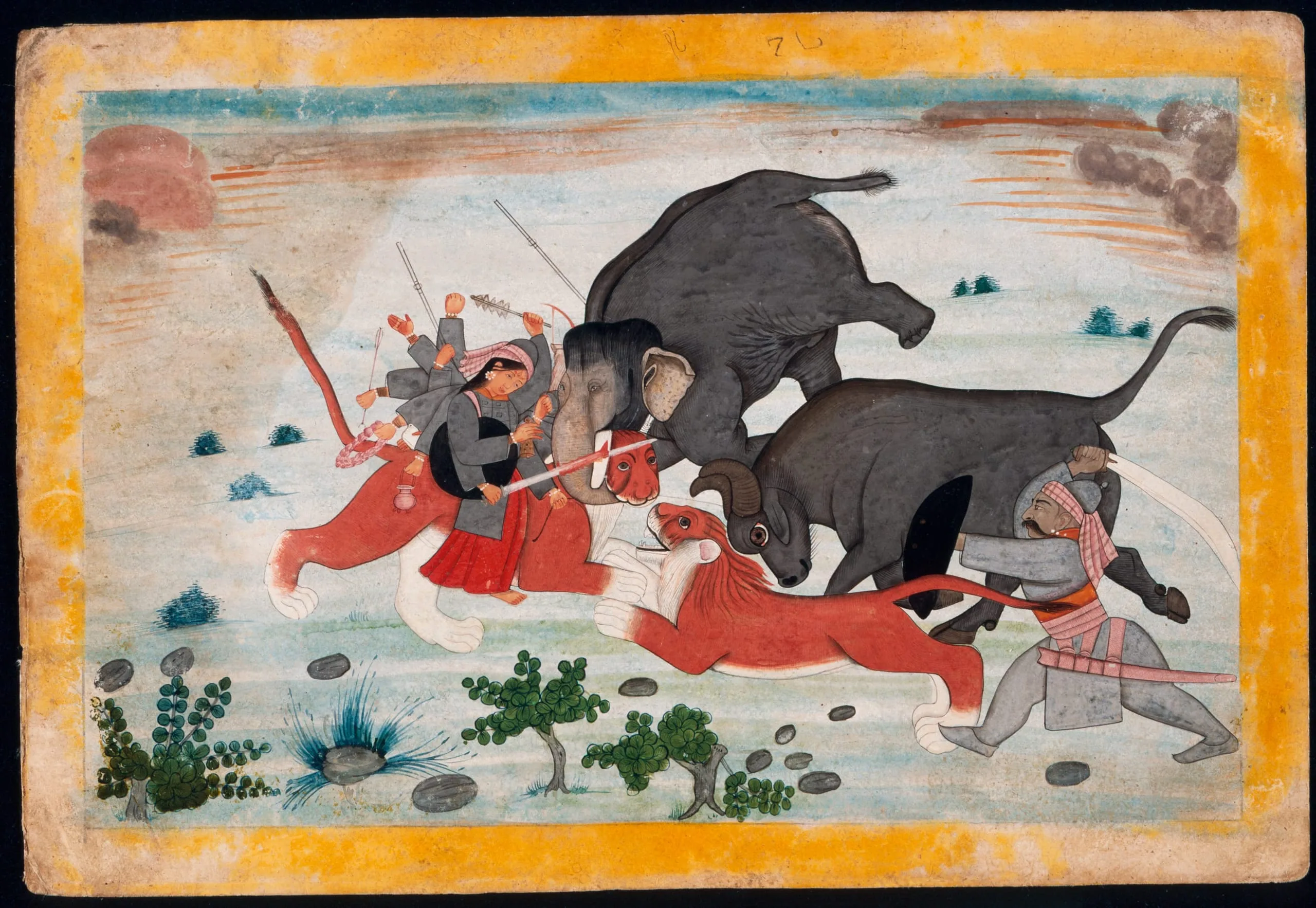 This folio illustrates the penultimate episodes in Chapter 3, “The Slaying of Mahishasura.” It conflates into a single image Mahishasura’s sequential manifestations as a buffalo, lion, warrior with a sword, and elephant, each of which was easily defeated by the Goddess (Devimahatmya 3:24-32). After the Goddess cut off the trunk of the elephant, Mahishasura resumed his buffalo form and was slain by the Goddess.