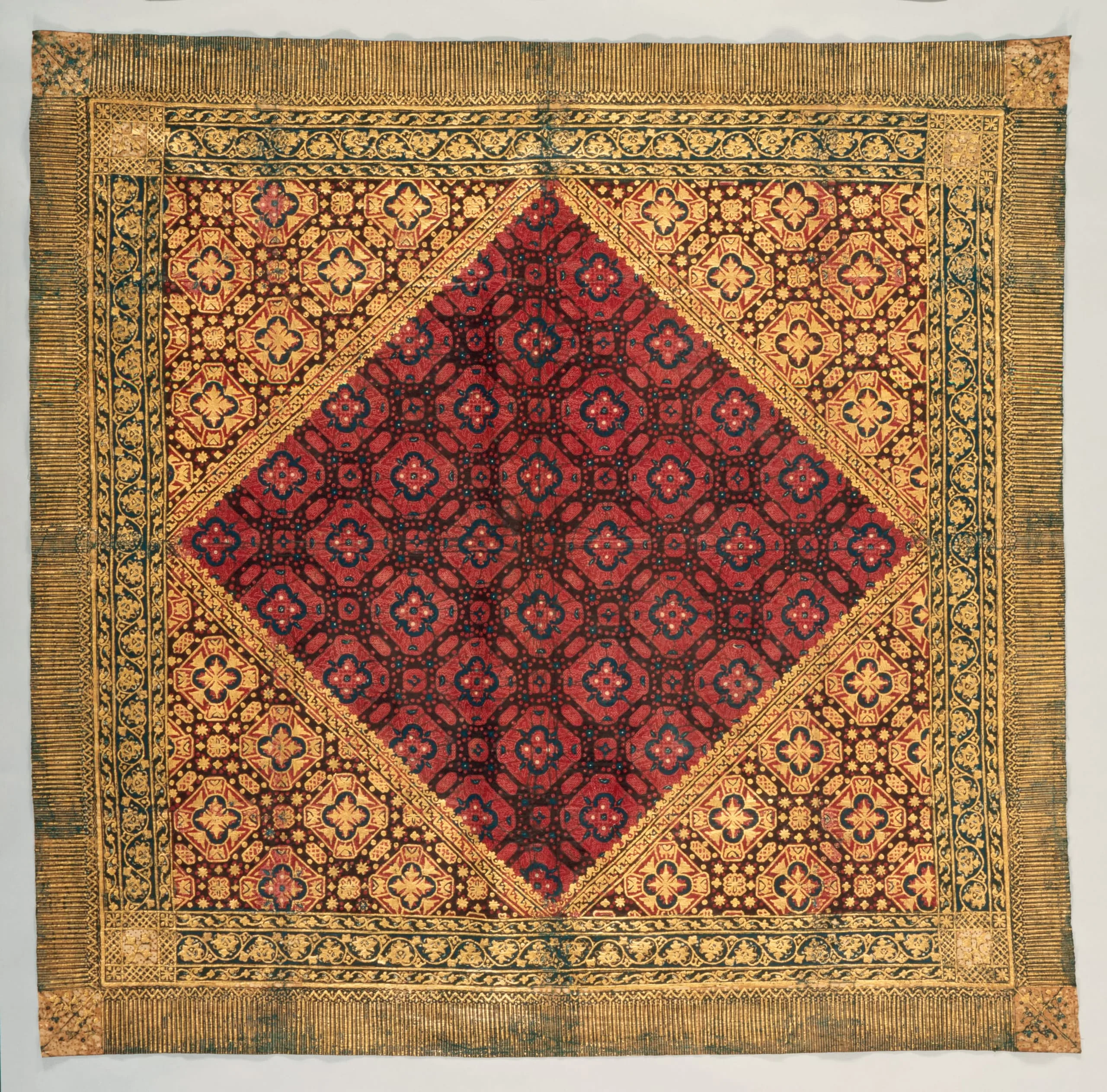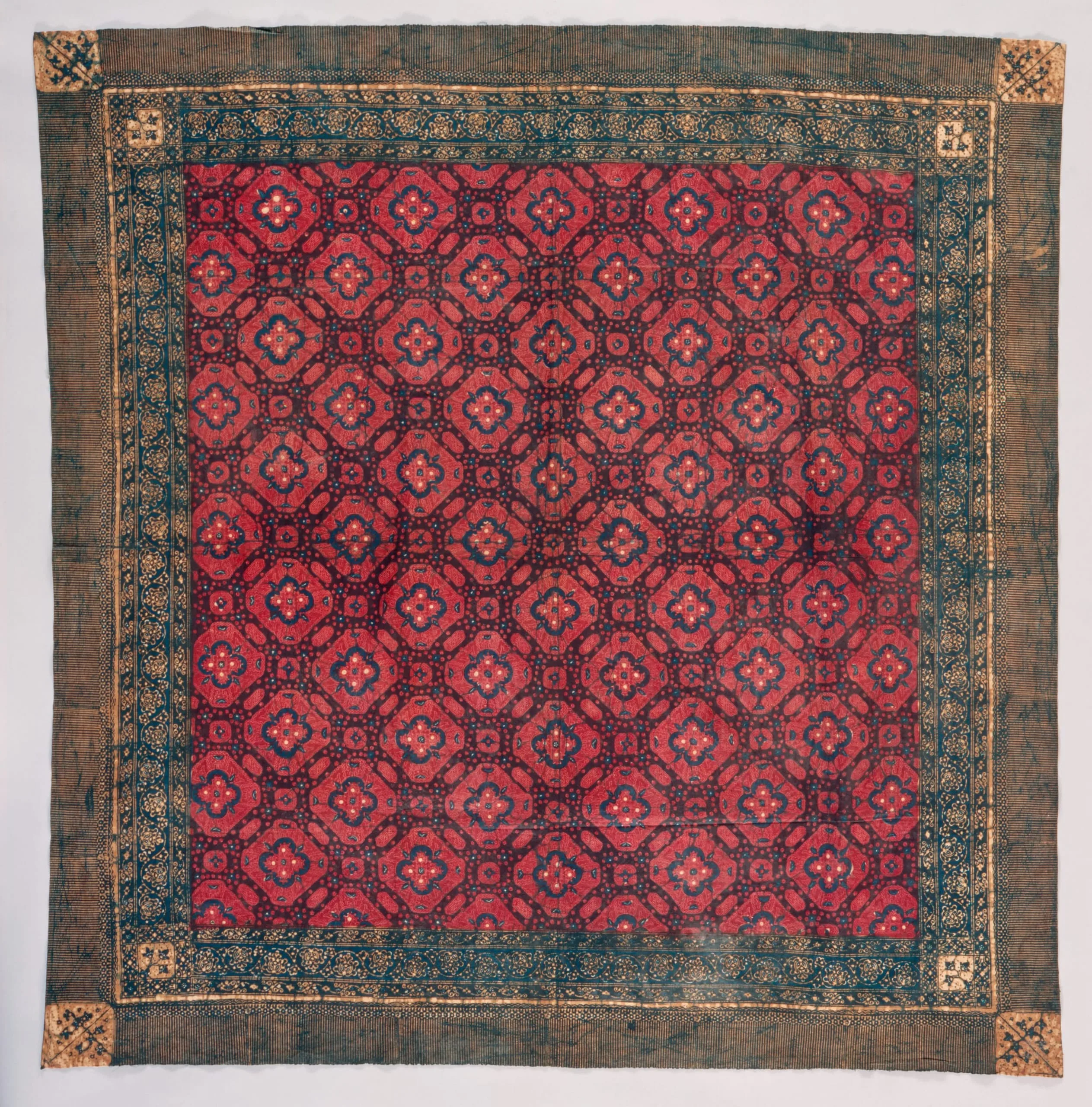 - Stamped wax resist (batik) on machine-woven cotton, natural and synthetic dyes and applied gold leaf