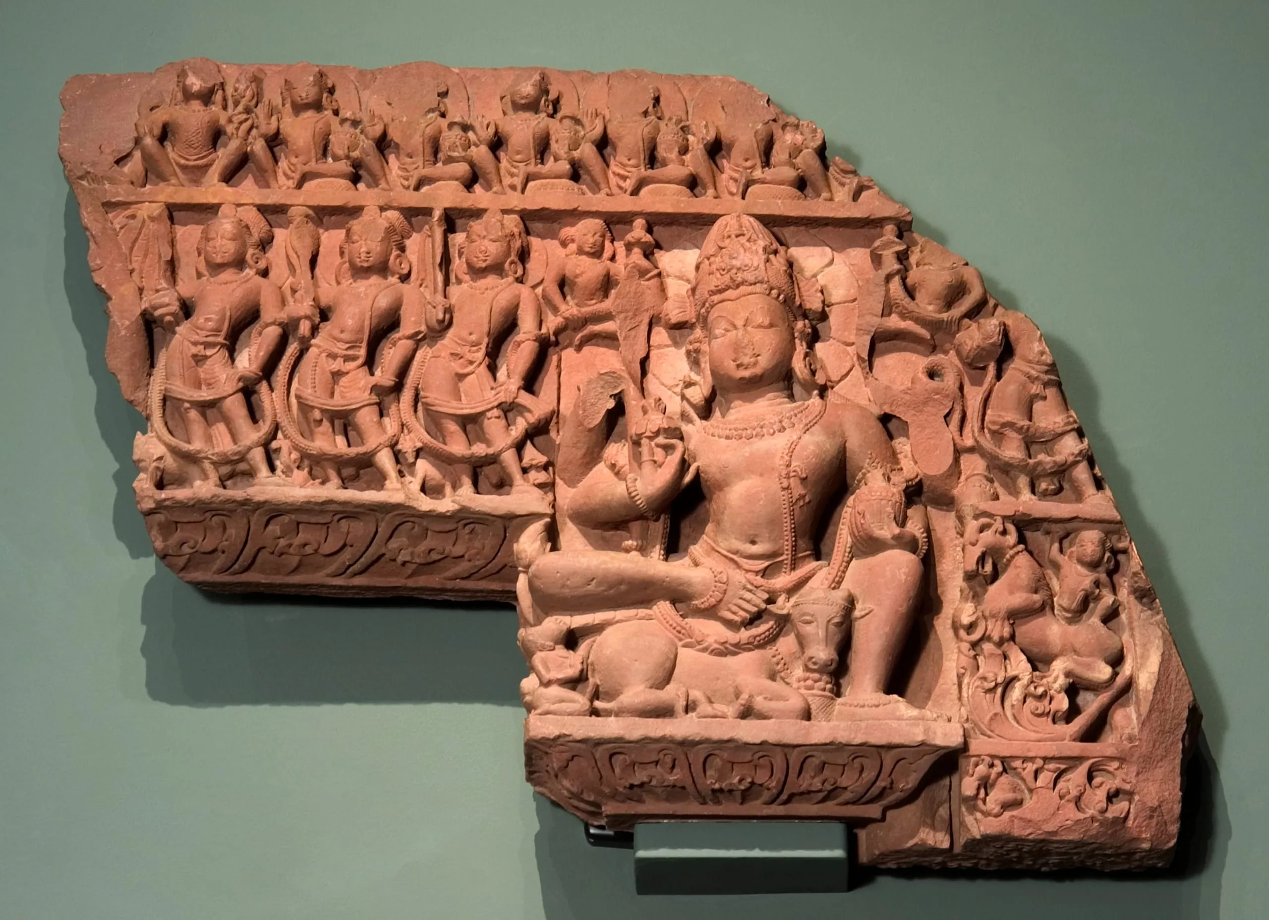 This frieze was once the right corner section of the extensive lintel and overdoor (uttaranga) decoration of a Vaishnava temple dedicated to Vishnu, who would have been shown to the left of this portion in the center above the doorway. The main figure here represents Shiva seated on his bull mount, Nandi. He has the piled hair of an ascetic and wears the Brahmanical sacred thread (yajnopavita) over his left shoulder. Shiva has four arms. In his upper right hand, he holds a now-damaged trident (trishula). In his lower right hand, he carries a lotus. In his upper left hand, he holds a now-damaged serpent. In his lower left hand, he carries an ascetic’s waterpot (kamandalu). He is flanked by four of the eight Guardians of the Directions (ashta dikpala). Three Guardians are on the left. From left to right, they are Nirriti, Regent of the Southwest, with his sword and a dog mount; Varuna, Regent of the West, with his mythical aquatic creature (makara) mount; and Varuna, Regent of the Northwest, with his standard (dhvaja) and deer mount. On the right of Shiva, is the partially damaged Guardian Kubera, Regent of the North, with his drinking cup in his right hand and a pot of wealth between his legs. On the top of the relief, seven of the nine Indian planetary deities (nava graha) are seated, beginning with the Sun God Surya on the left. In the lower right corner, an attendant rides a rearing leogryph (shardula). This sculpture may have originally been on the same temple as M.74.5.5 and M.77.19.27. A sculpture of Shiva’s Family from the same temple is in the National Museum of Korea (formerly LACMA M.73.4.12).